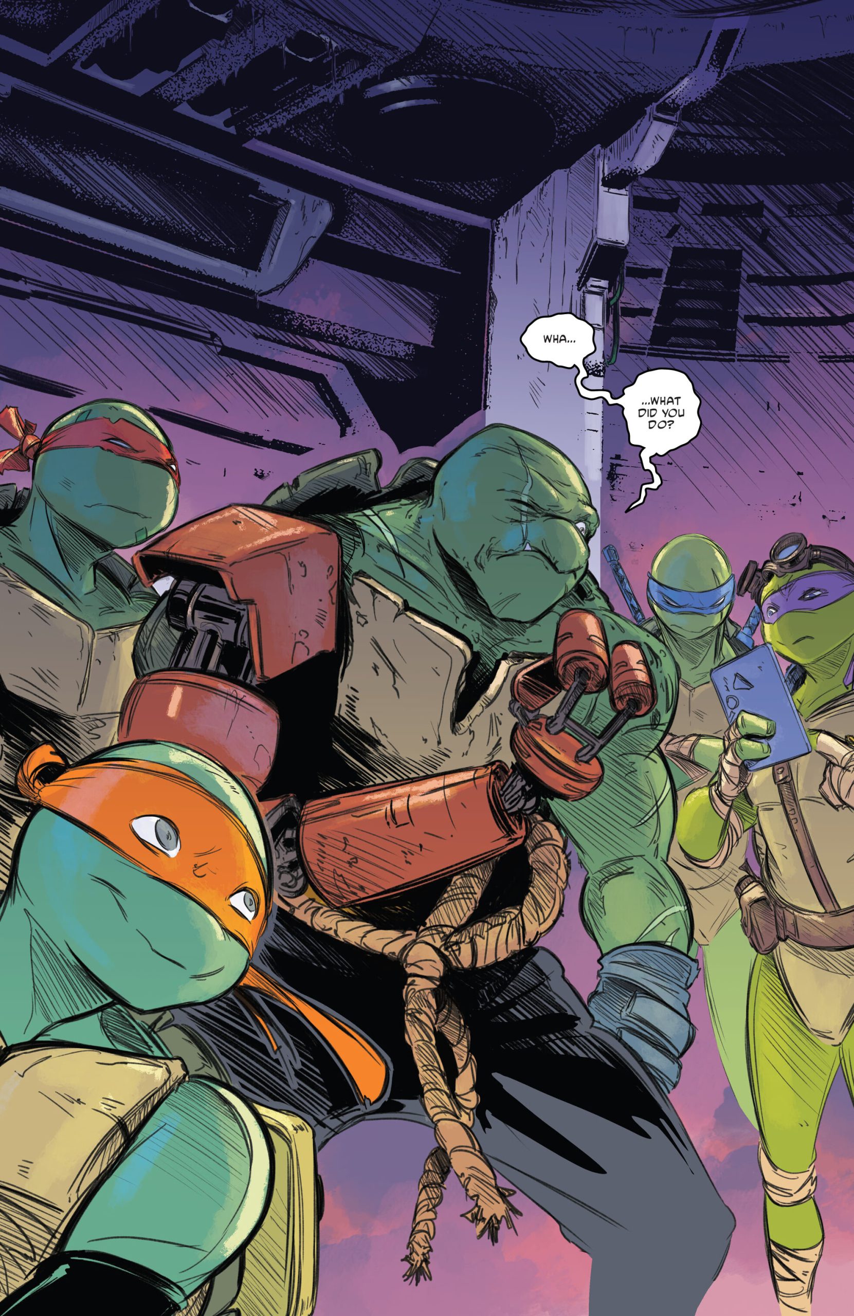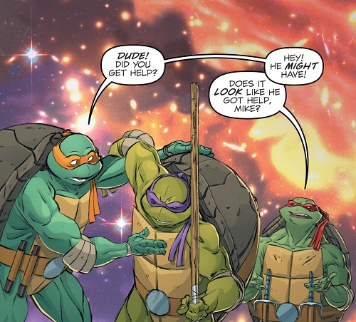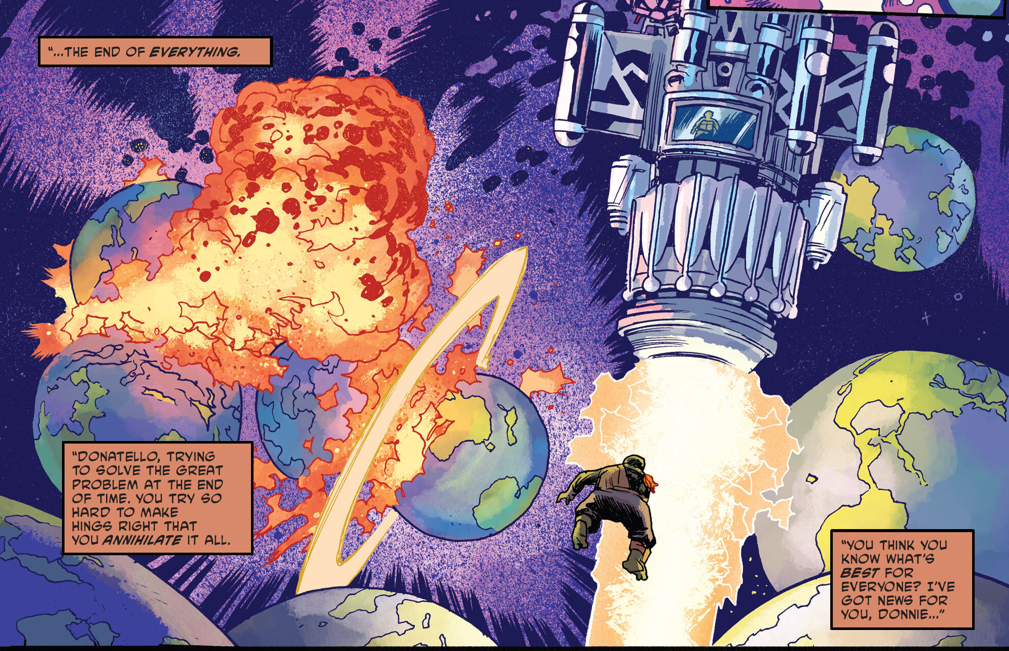 Un soir, les tortues reçurent la visite d’un intrus totalement inattendu. Michelangelo avait convié ses frères dans leur ancien repaire dans les égouts pour se détendre et repenser au bon vieux temps. Mais ils furent dérangés par une étrange tortue mutante à l’apparence vieillissante, balafrée et avec un bras arraché. La remettant sur pied, Donatello découvrit que celle-ci voulait s’entretenir avec lui. Les autres frères ne lui faisaient guère confiance. Raphael était même convaincu qu’il s’agissait de lui, bien plus vieux. Il ne s’était pas trompé. Et ils découvrirent que ce Raphael était venu pour tuer Donatello avant qu’il ne crée de quoi détruire les mondes, après s’être fait dépasser par les évènements. Raisonnant le mutant, les quatre frères réussirent à le faire partir, lui rappelant que Splinter leur avait toujours enseigné à compter les uns sur les autres. Averti, Donatello pouvait encore ne pas commettre les mêmes erreurs que celui de la temporalité avancée. Raphael quittait le lieu, accordant sa confiance à son petit frère (Annual 2023).