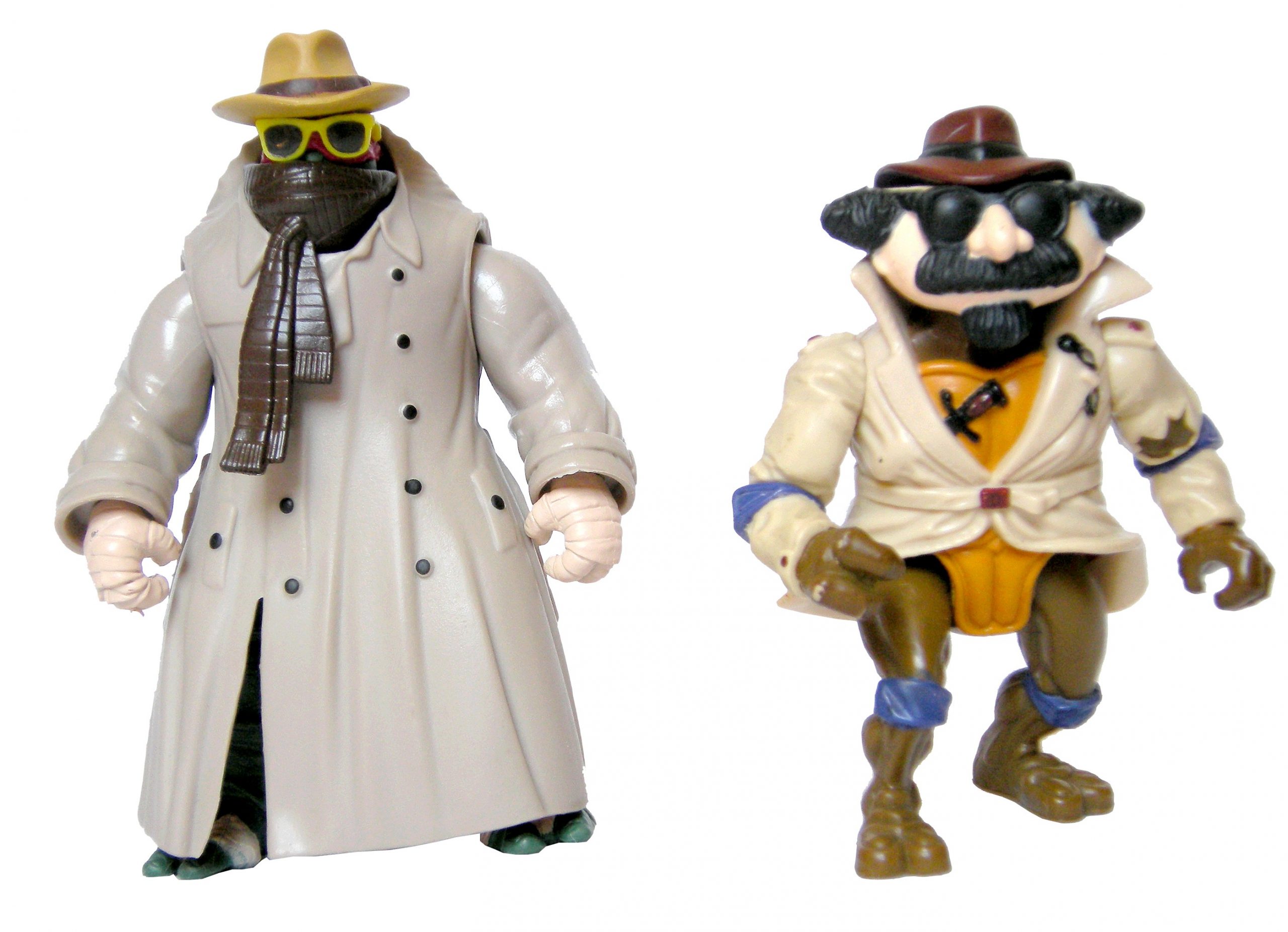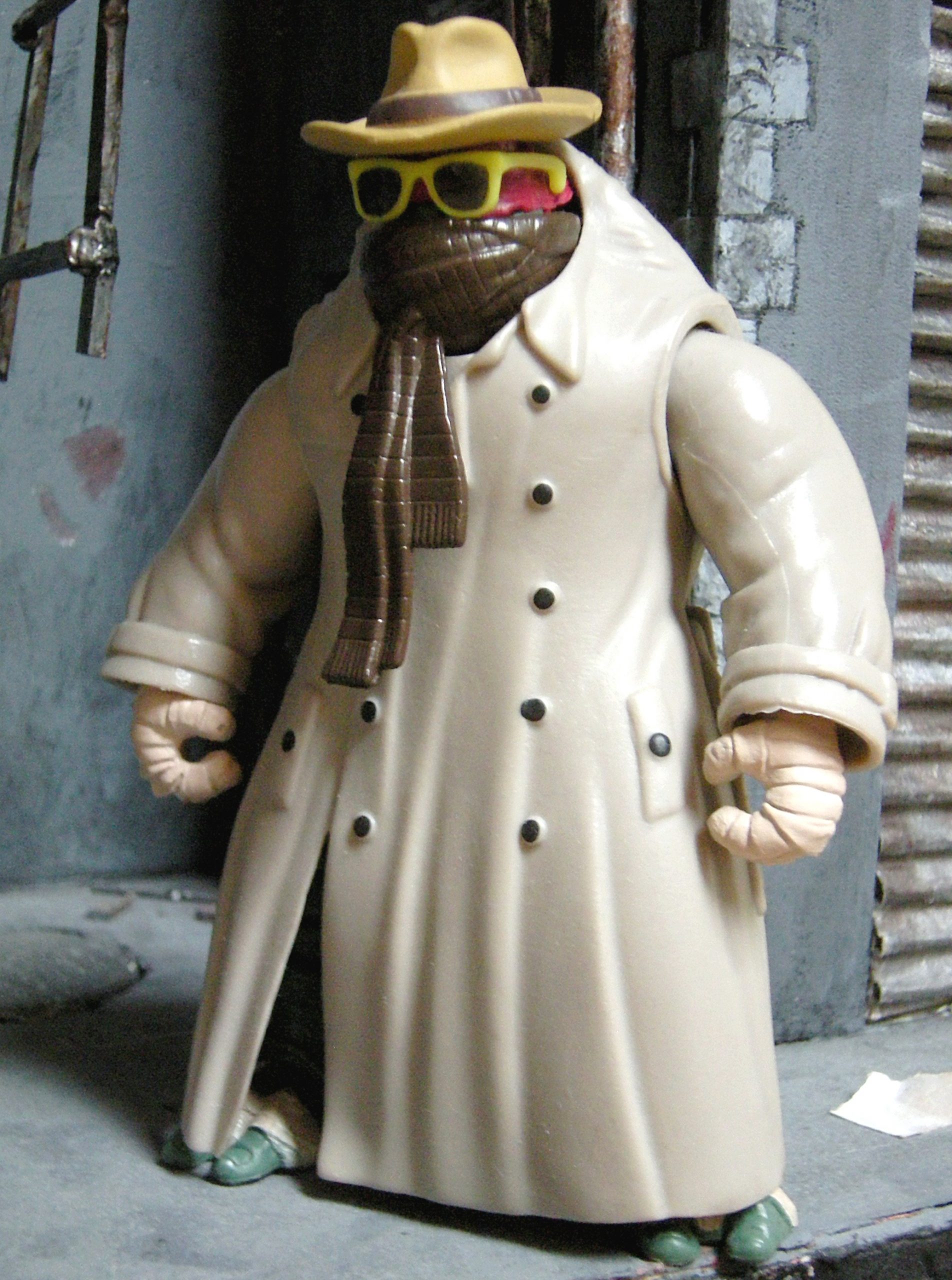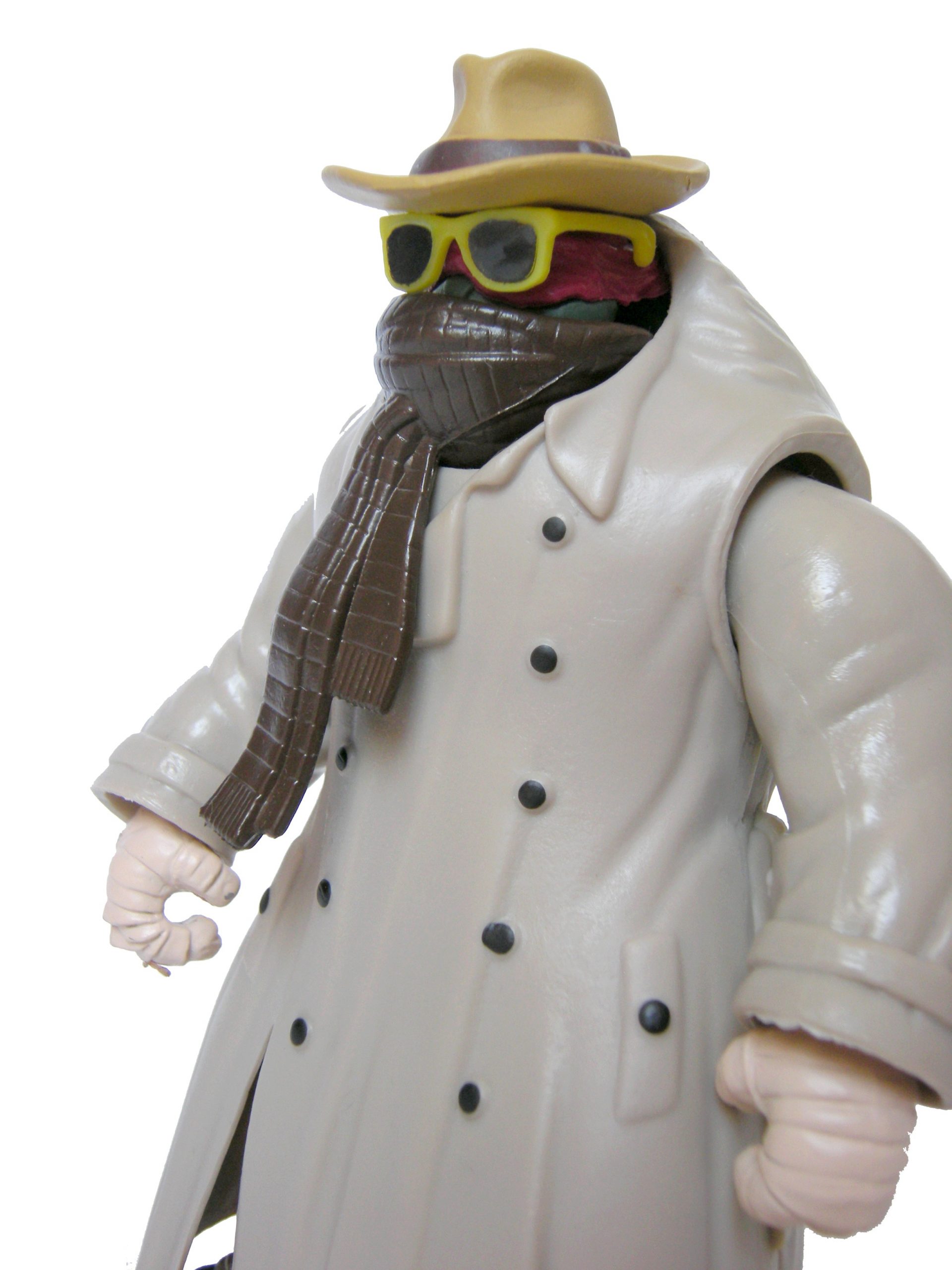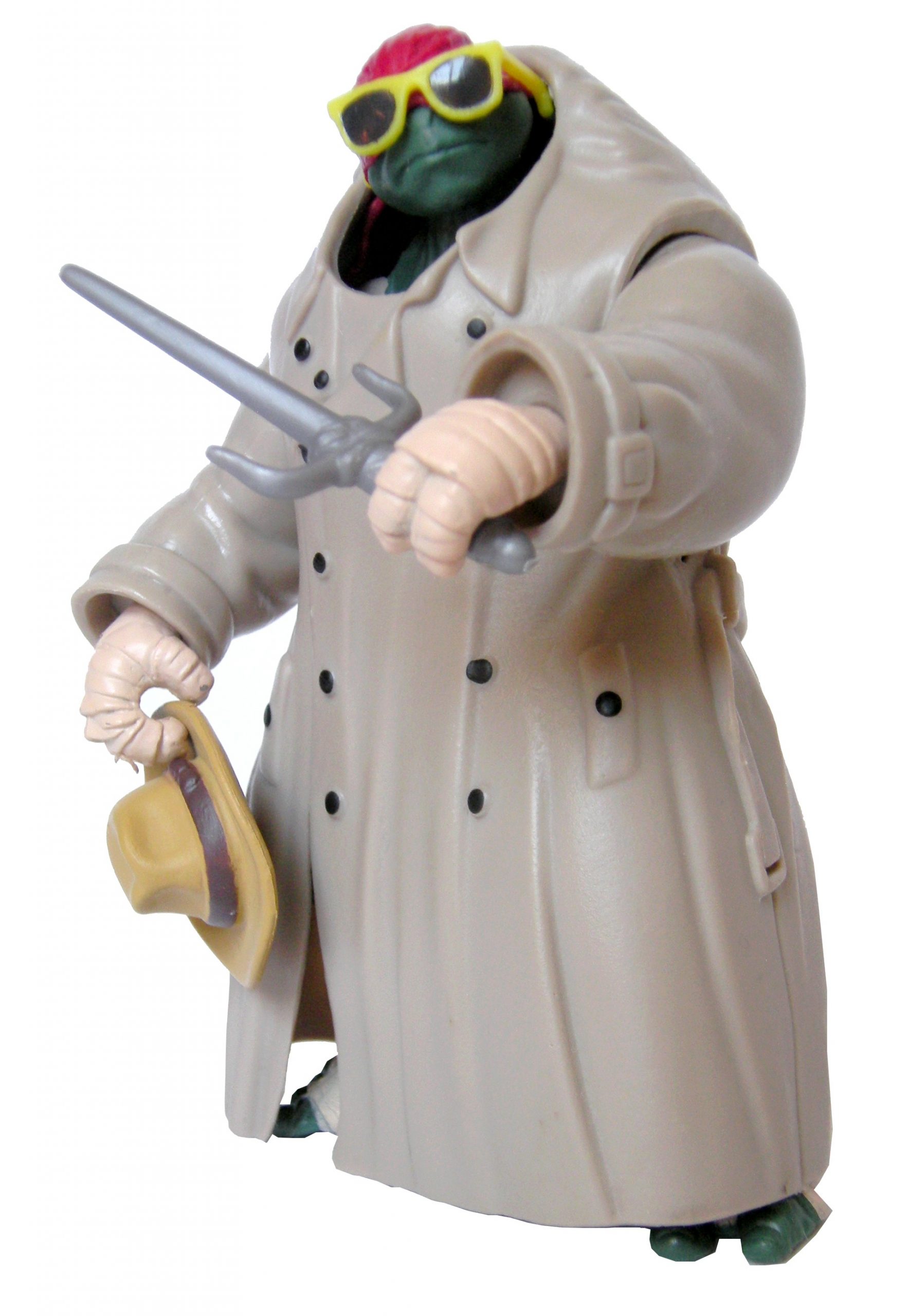 Enfin, cette figurine fait beaucoup penser à une autre munie d’un trench coat, il est bien entendu question de la figurine de Don, the undercover turtle, sortie en 1990. Les deux tortues portent un manteau sensé les cacher (et c’est bien loupé pour les deux), ainsi qu’un masque plus que louche.