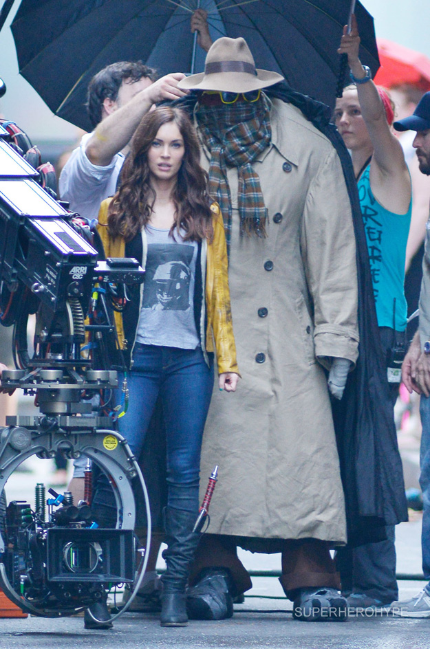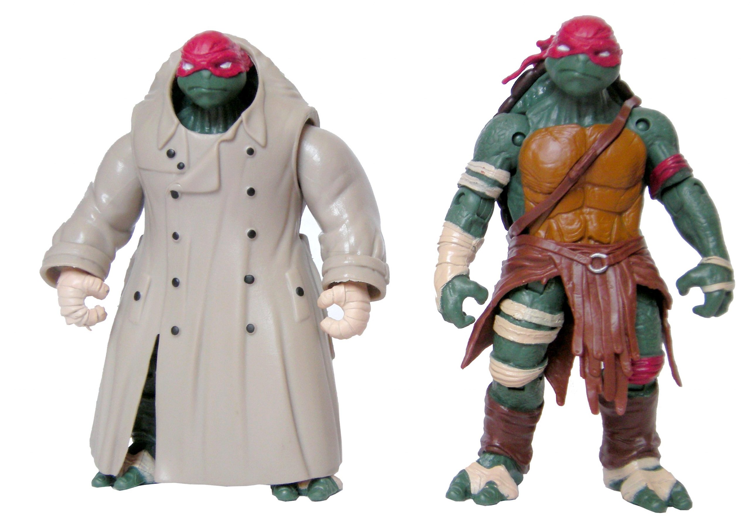 Cette figurine de Raphael in disguise est toutefois très particulière par son histoire. Le film de Liebesman eut à de nombreuses reprises sa date repoussée. La dernière fois eut lieu quelques mois avant la sortie en salle du film, ce qui le contraignit à sortir deux mois après, en aout 2014. De nombreux changements furent alors réalisés dans le scénario, appelant notamment un nouvel acteur pour jouer le rôle de Shredder, écartant William Fichtner qui avait fait crier les fans de par son origine occidentale. Mais les origines du grand méchant de l’histoire ne furent pas les seules à connaitre quelques changements. Raphael porta bien un trench coat, référence directe à la couverture utilisée par les tortues dans la série animée de 1987, et surtout à Raphael dans le premier film des TMNT ! Mais la scène fut coupée. Il a été possible d’en avoir quelques images grâce aux personnes présentes pendant le tournage de la scène. Elle devait faire suite à la décision de la tortue de partir sauver ses frères, au moment où April retrouvait Vernon en ville. En effet, il était possible de voir Raphael dans un épais manteau, et la jeune femme, portant ses saïs. Il semblerait qu’ils aient rencontrés ainsi Vernon d’après les images, et non pas dans une ruelle comme dans la version finale.