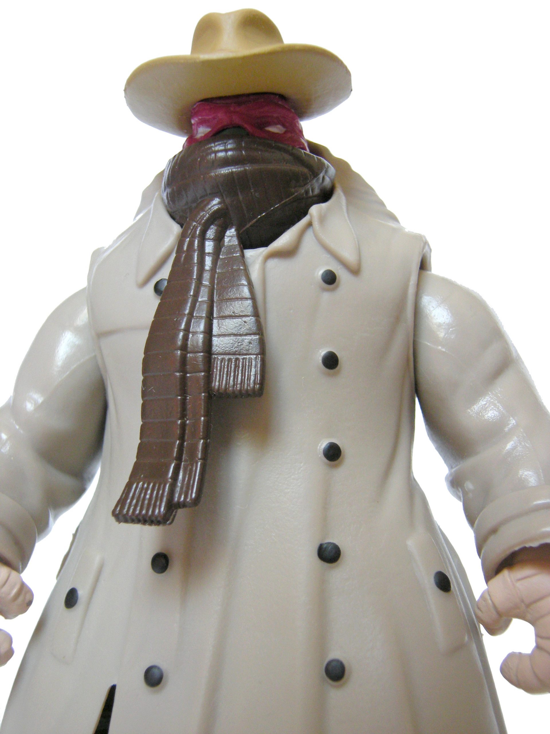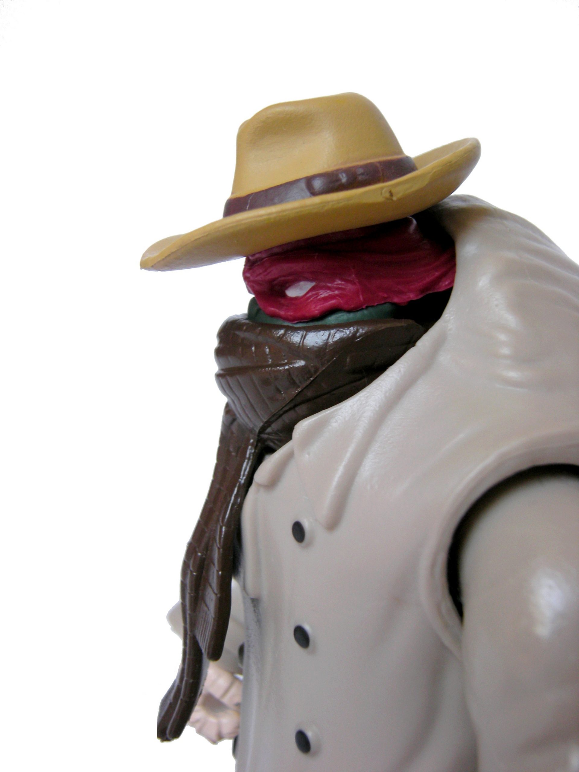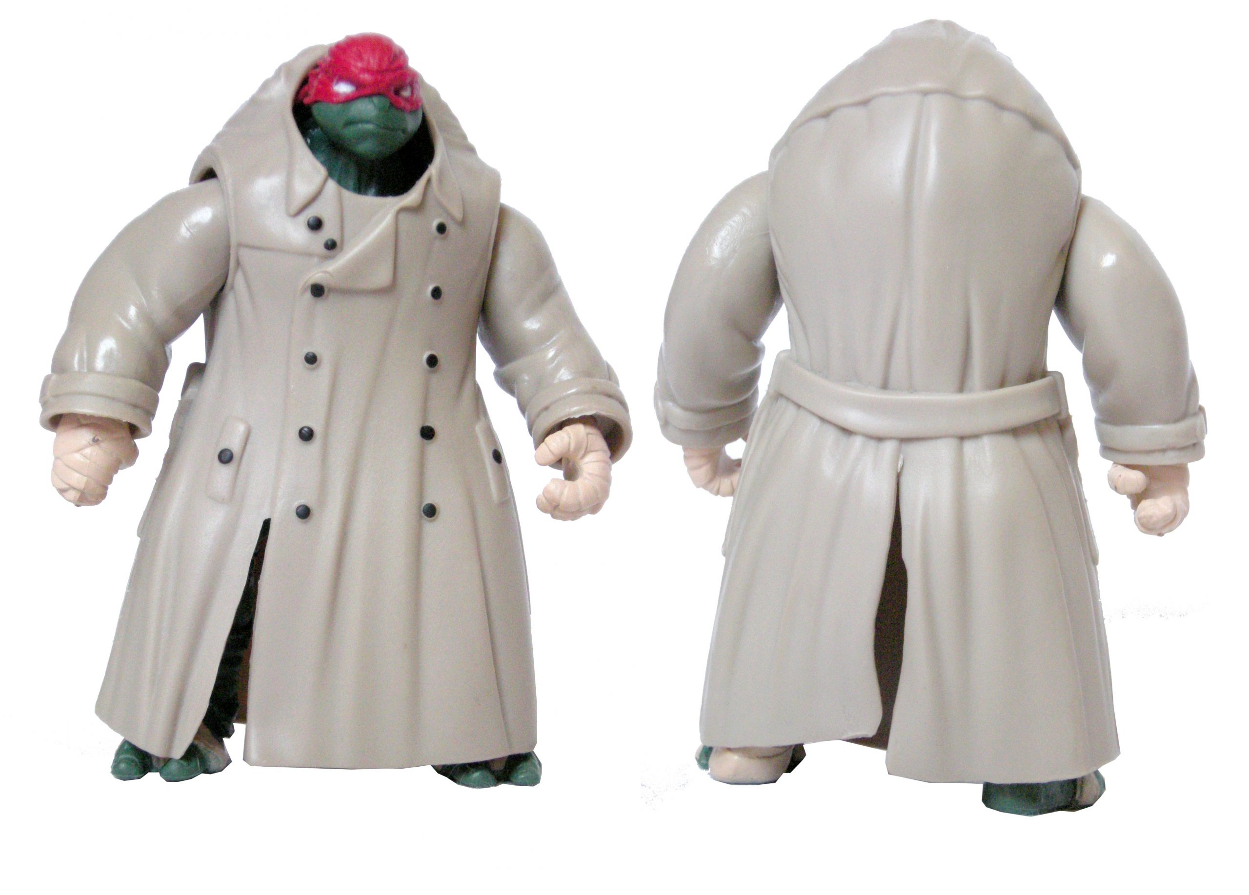 La figurine en soit est un Raphael de base, dont les parties rapportées, comme la ceinture et le pagne, ne furent pas ajoutés. La figurine est recouverte d’un manteau, son trenchcoat, réalisé dans un plastique très souple, un peu comme la robe de Splinter (dessin-animé 2012) ou la cape de Shredder (film 2014). Ses bras quant à eux sont inédits, réalisés pour cette figurine.