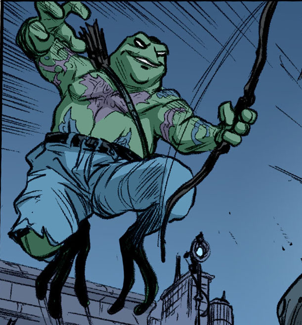 Cherchant constamment de la nourriture, les grenouilles restèrent à New York. L’attaque de Baxter Stockman (The Armageddon Game #1) leur avait révélé la véritable nature des tortues. Rasputin était le plus critique à leur égard, les traitant de traitres et d’hypocrites par rapport à la bonne image qu’elles cherchaient à avoir. Genghis se montrait bien plus prudent à leur égard, repensant à la discussion que Michelangelo avait cherché à avoir avec lui. Casey, qui espionnait leurs faits et gestes, fut repéré et essaya de les attaquer. Les grenouilles n’avaient rien à faire en dehors de Mutant Town. Mais leur altercation prit fin lorsqu’ils furent tous attaqués par les Purple Dragons. Le groupe de marginaux en voulait à Casey de les avoir abandonnés. Le justicier au masque de hockey fit équipe avec les batraciens pour neutraliser les extrémistes qui réalisaient une chasse aux mutants. Prouvant sa valeur, les grenouilles comprirent que ni lui ni les tortues n’étaient mauvais. Il revint avec des burritos pour calmer leurs estomacs (The Armageddon Game – The alliance #2).