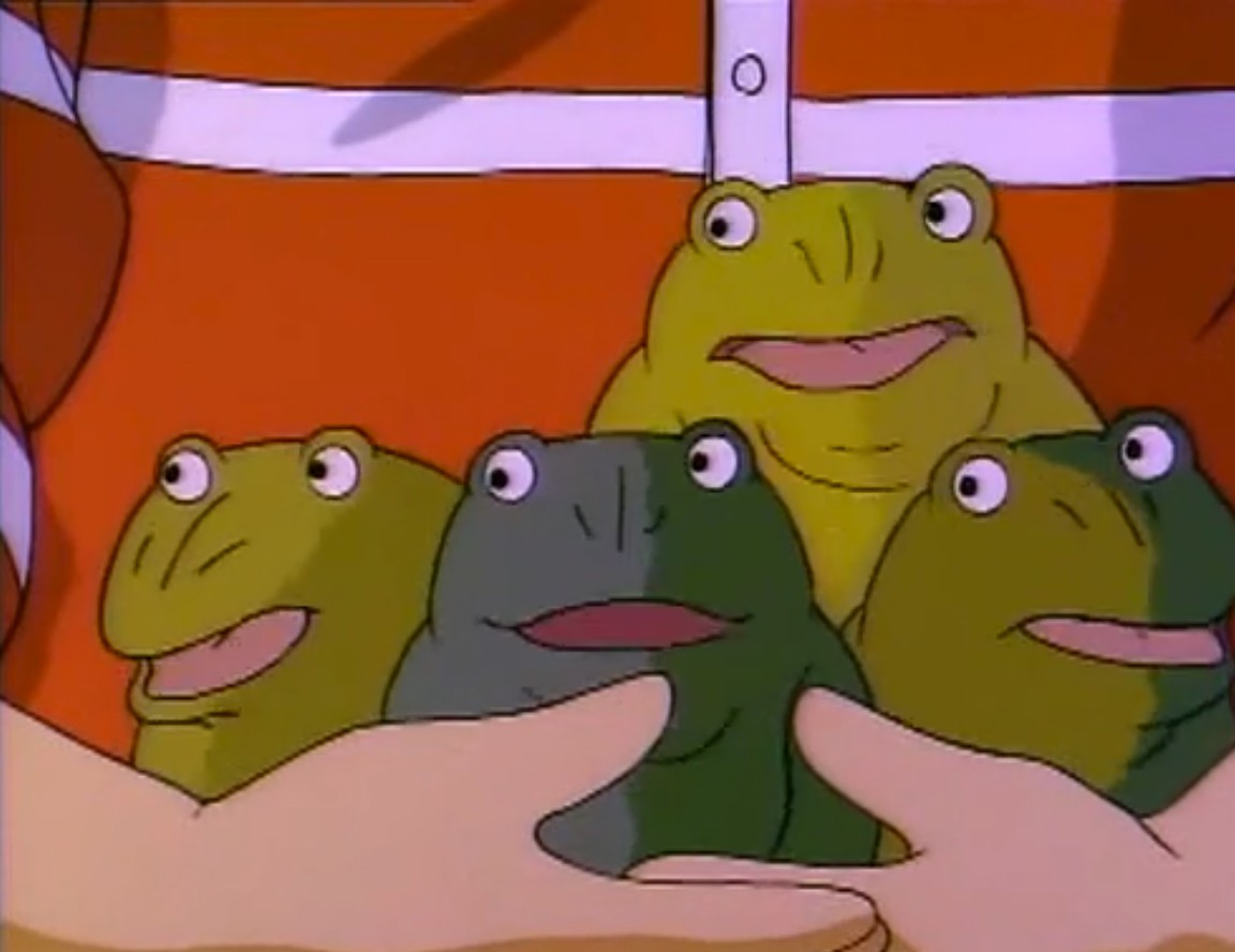 - Napoleon Bonafrog et Genghis Frog ont bénéficié tous deux d’une figurine chez Playmates Toys. Cette adaptation en jouet a permis aux deux grenouilles d’être les plus présentes dans la série, principalement Napoleon. Attila et Rasputin le sont beaucoup moins et totalement laissés pour compte.