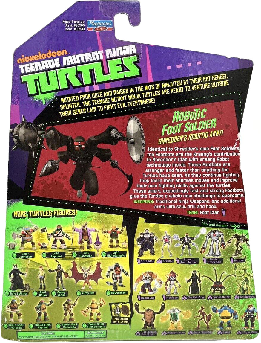 Identical to Shredder’s own Foot Soldiers, the Footbots are the Kraang’s contribution to Shredder’s Clan with Kraang Robot technology inside. These Footbots are stronger and faster than anything the Turtles have seen. As they continue fighting, they learn their enemies moves and improve their own fighting skills against the Turtles. These smart, exceedingly fast and strong Footbots give the Turtles a whole new challenge to overcome. Weapons: Traditional Ninja Weapons, and additional arms with saw, drill, and hook. Team: Foot Clan.