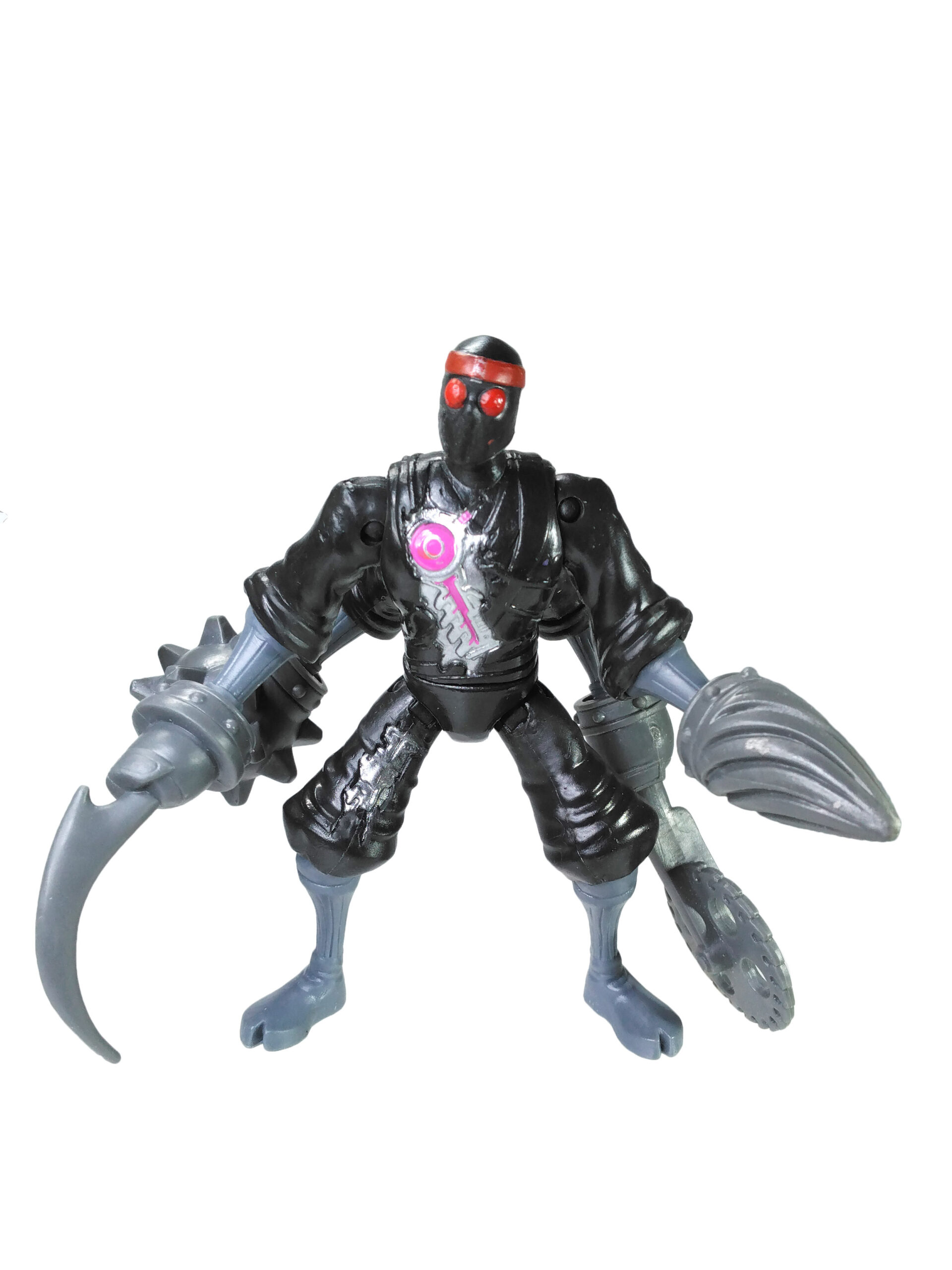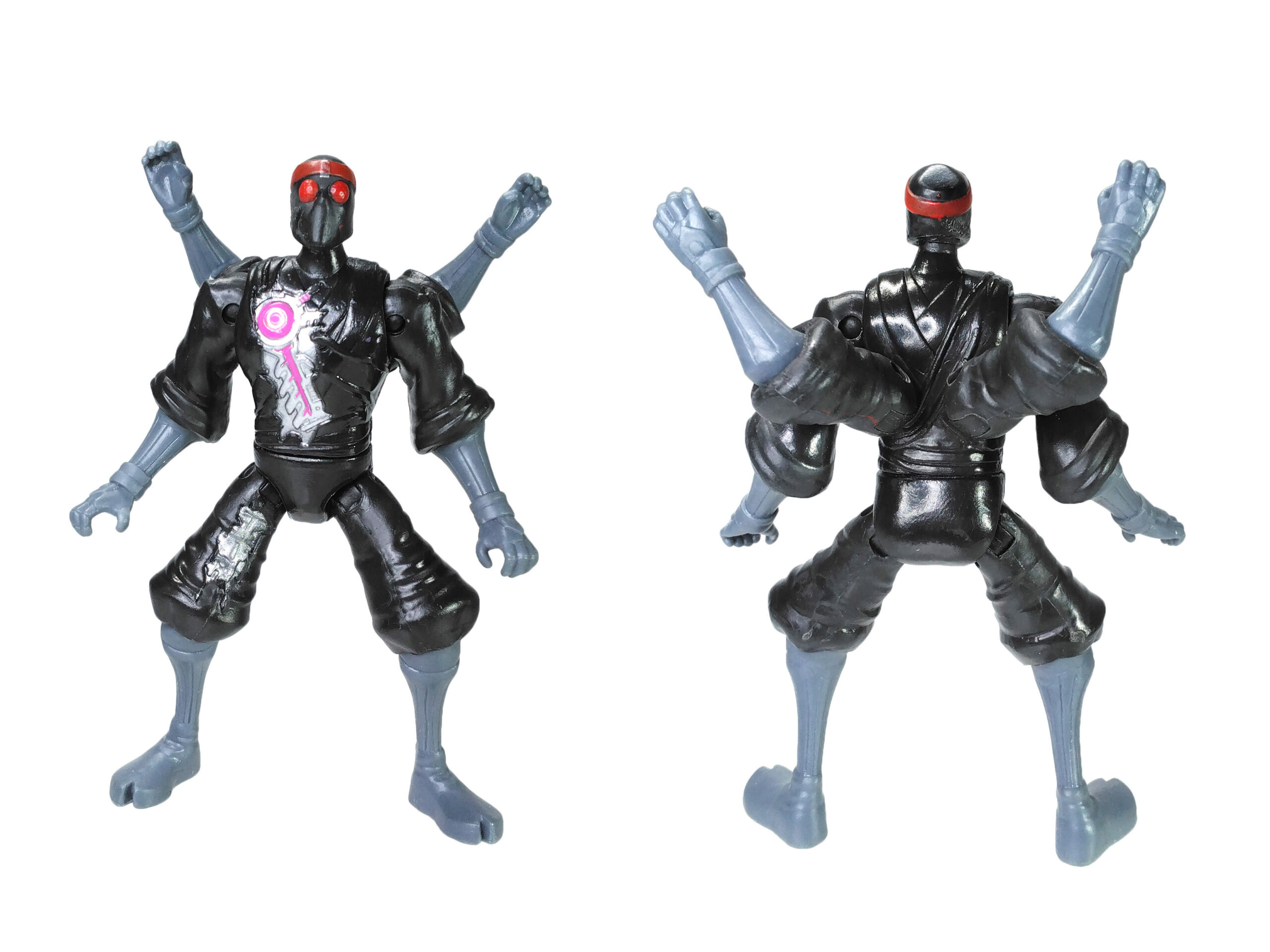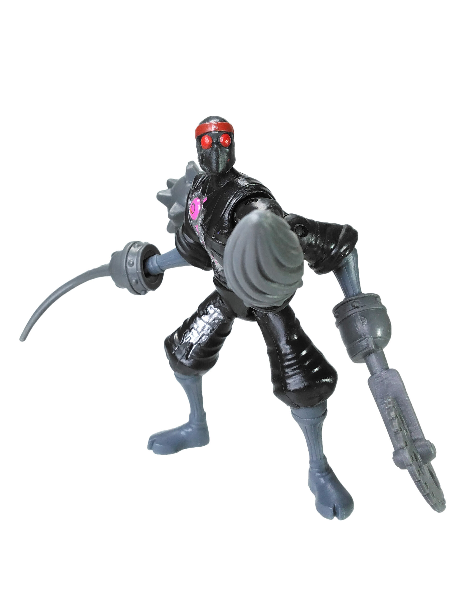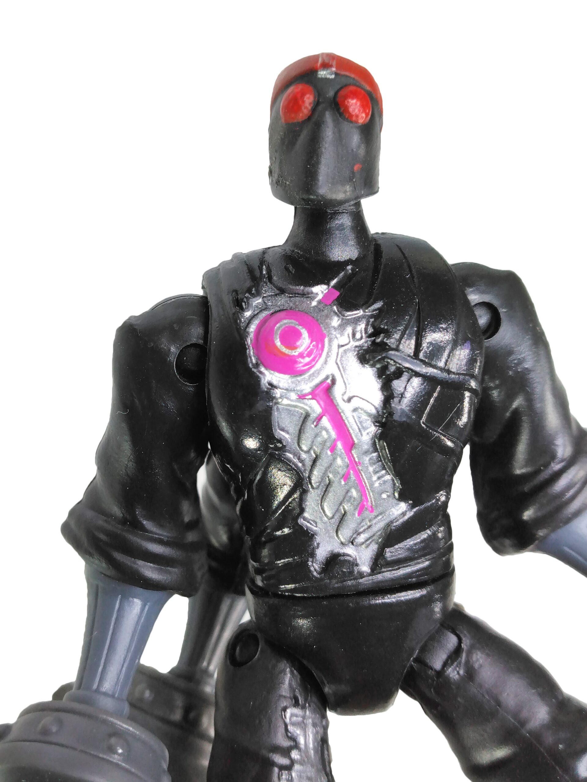 Nous retrouvons des jambes et des bras du même gris que les armes et surtout une tête avec des yeux totalement rouge, pour renvoyer à la couleur des yeux brillants de ces machines à tuer. Enfin, une coloration métallisée a été apposée pour les parties visibles du robot avec l’ajout de rose pour rappeler qu’ils sont de conception kraang. L’épaisseur du disque rose sur la poitrine varie et le petit cercle est souvent mal ajusté, présentant soit un forme centrée (ci-contre) soit excentré donnant une impression de croissant de lune.