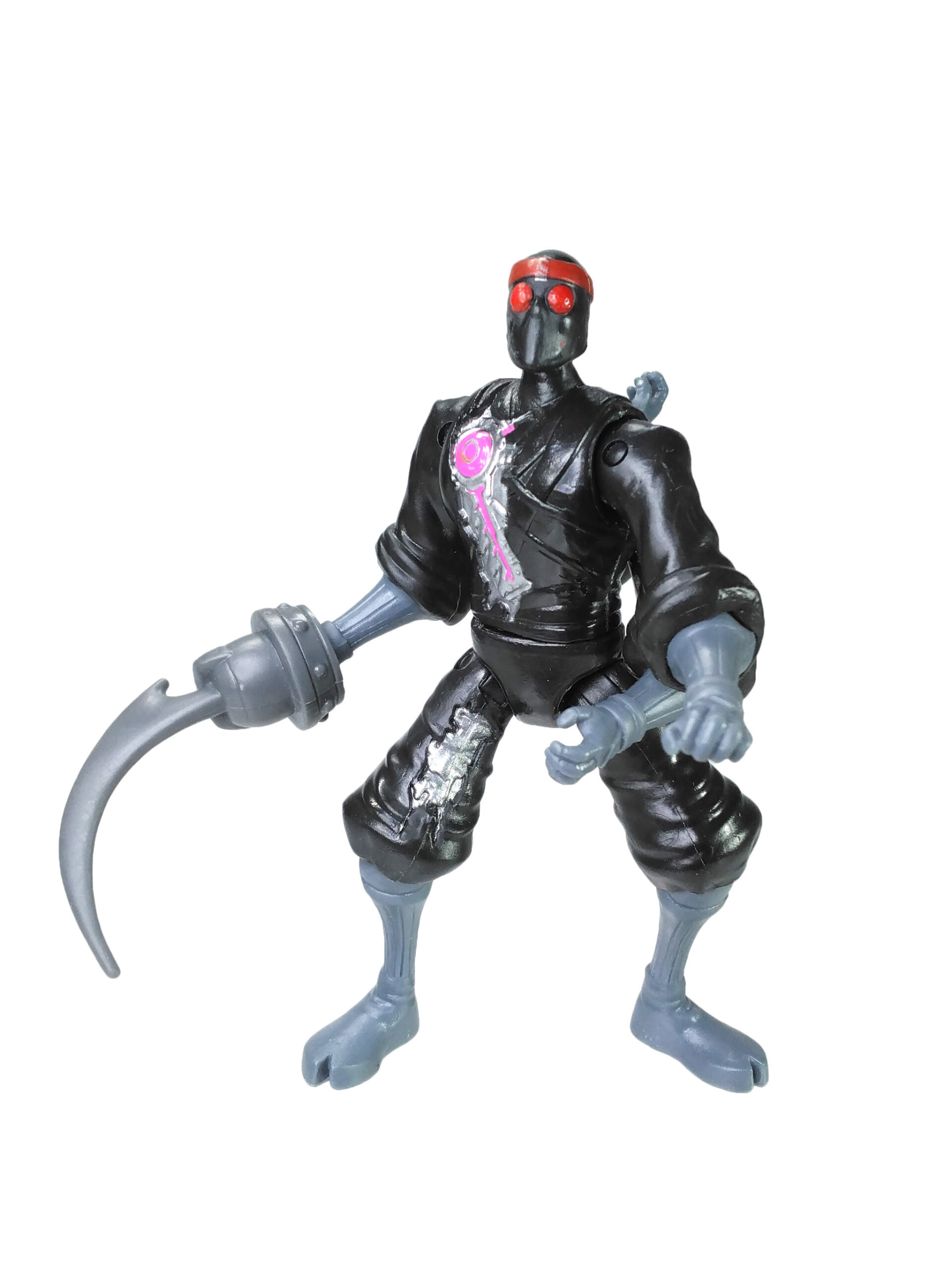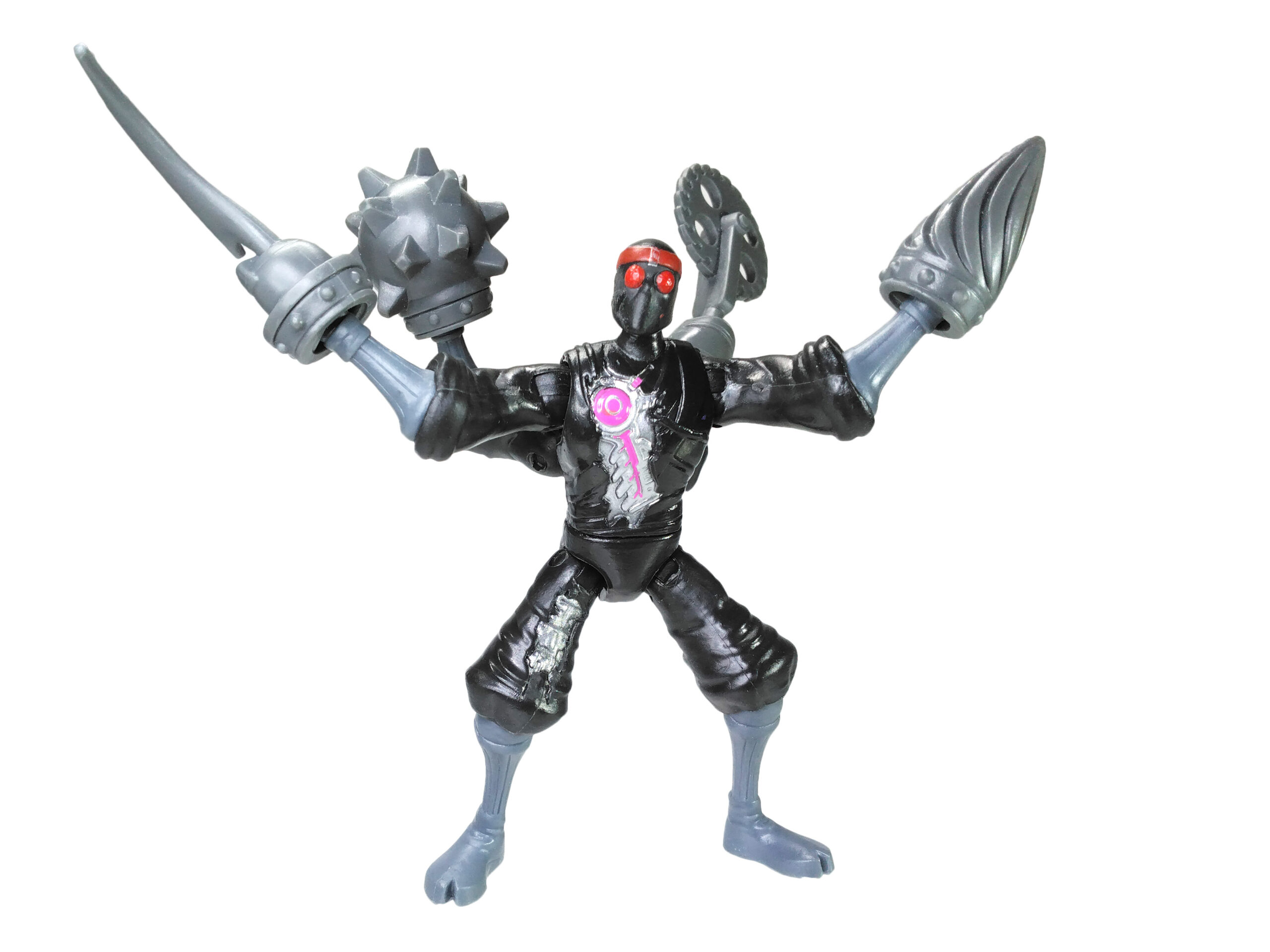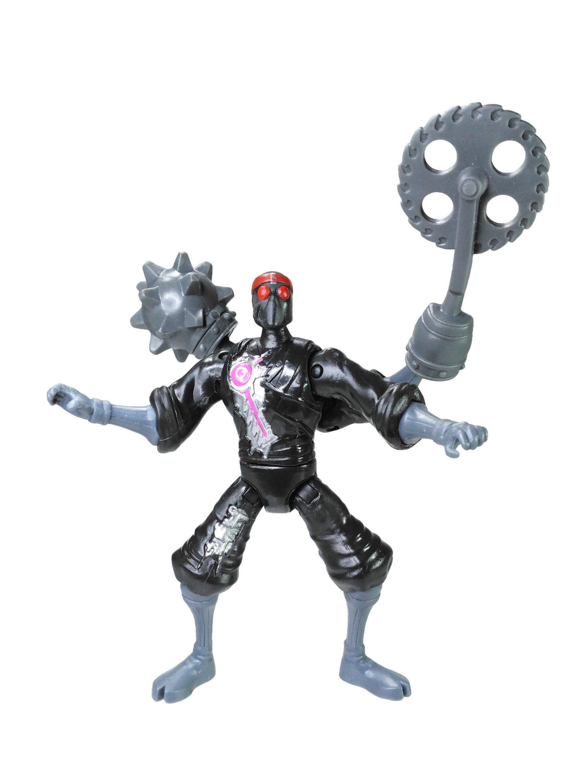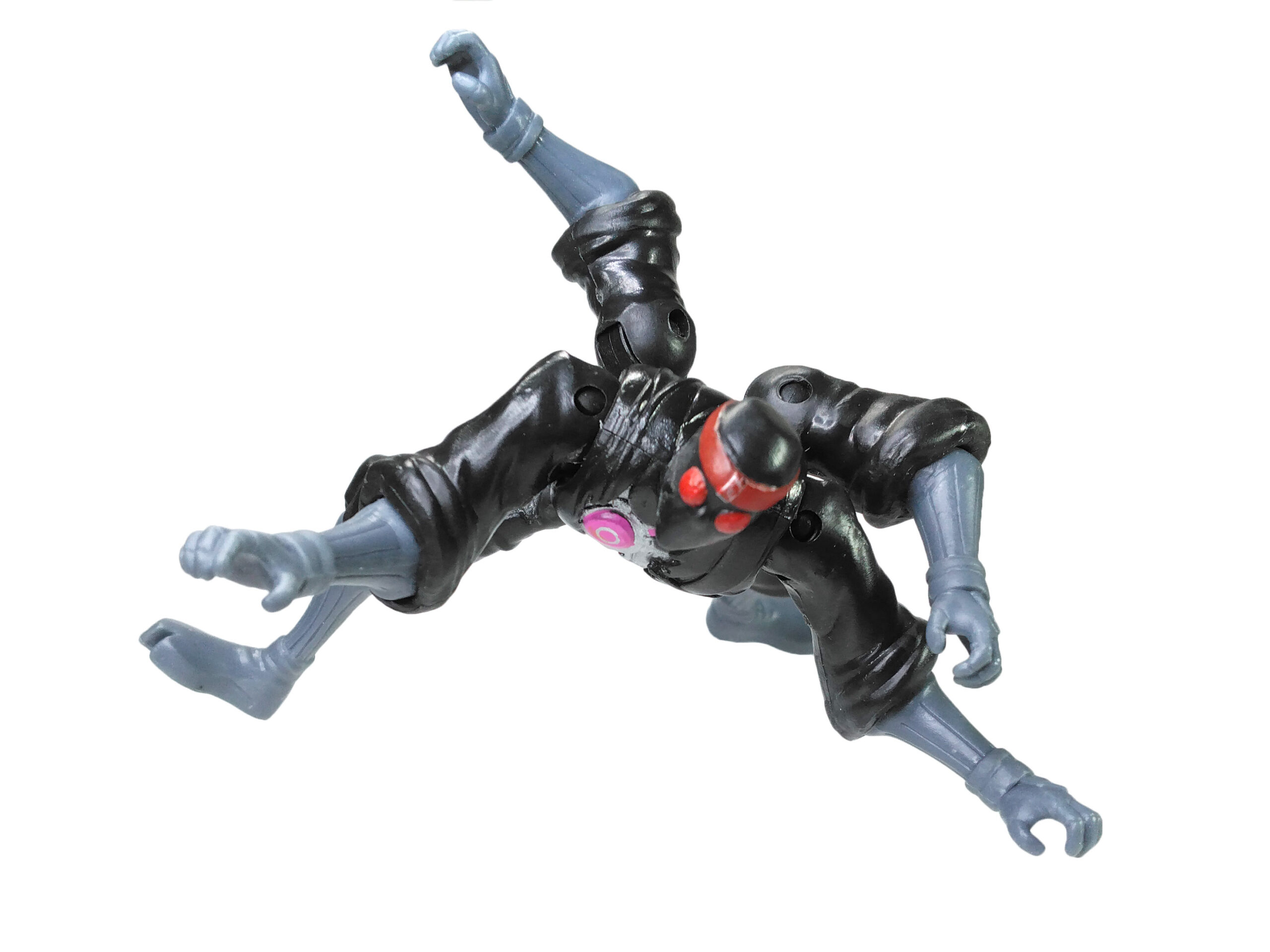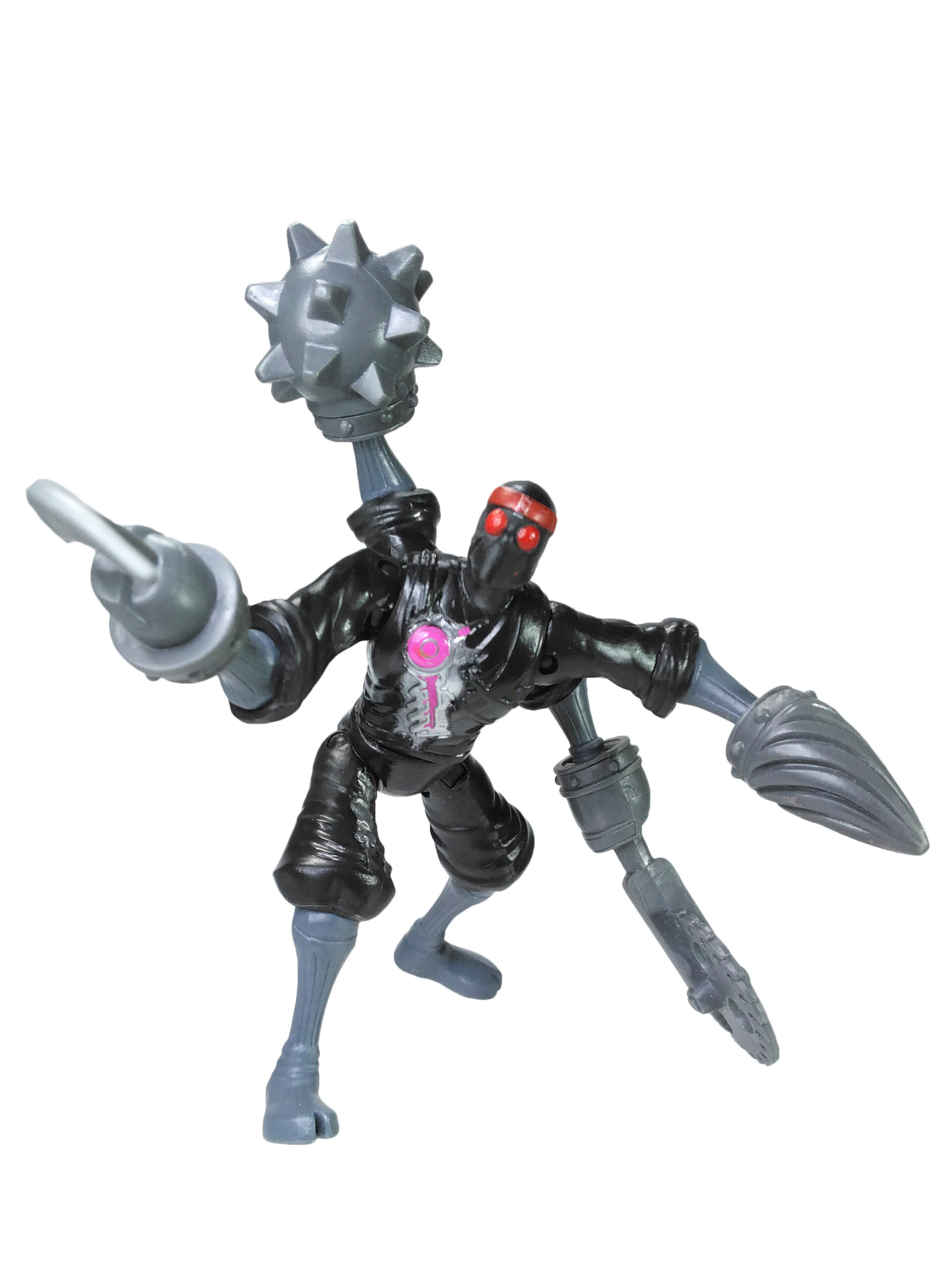 Nous retrouvons des jambes et des bras du même gris que les armes et surtout une tête avec des yeux totalement rouge, pour renvoyer à la couleur des yeux brillants de ces machines à tuer. Enfin, une coloration métallisée a été apposée pour les parties visibles du robot avec l’ajout de rose pour rappeler qu’ils sont de conception kraang. L’épaisseur du disque rose sur la poitrine varie et le petit cercle est souvent mal ajusté, présentant soit un forme centrée (ci-contre) soit excentré donnant une impression de croissant de lune.