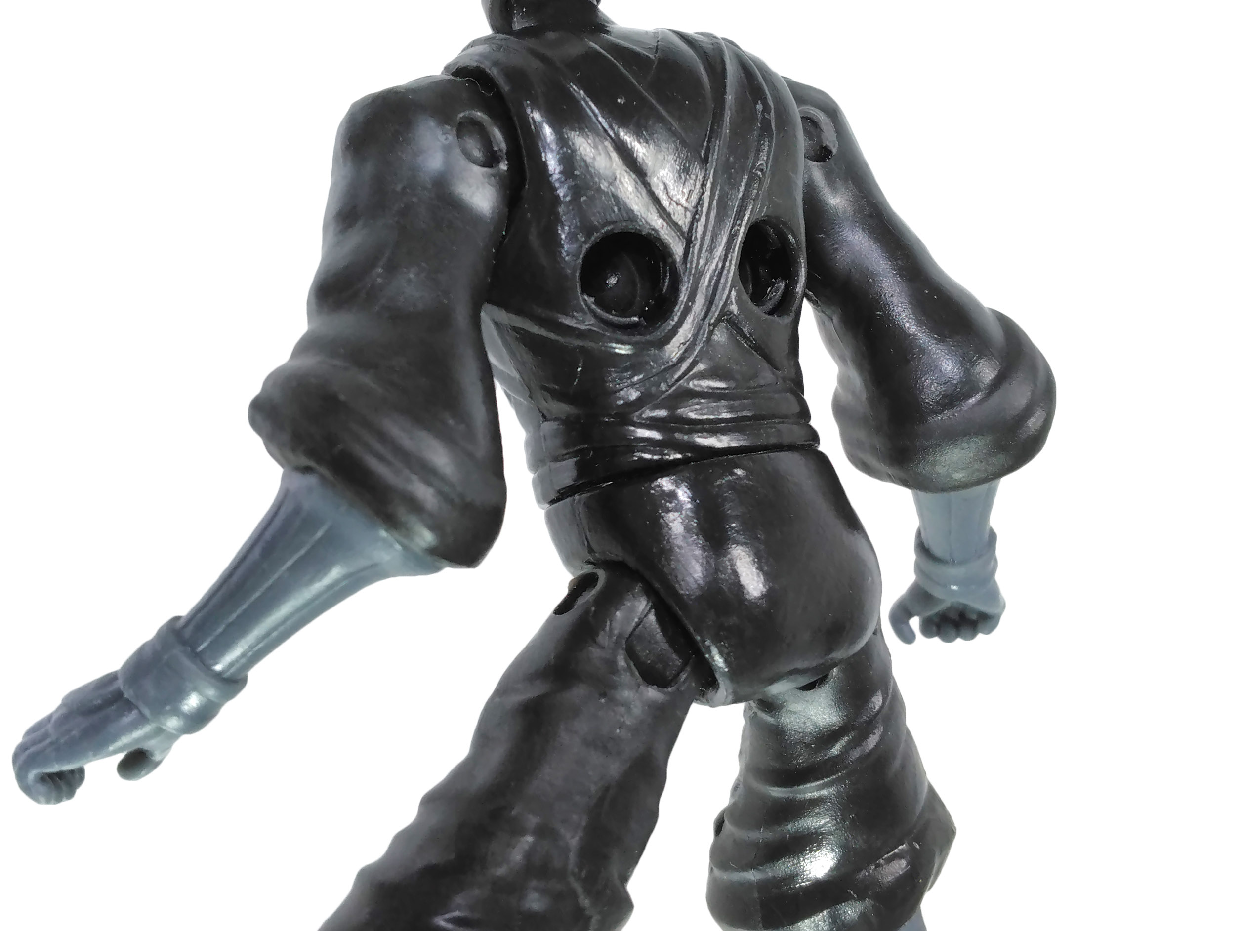 Enfin, pour distinguer réellement le Footbot d’un ninja classique, Playmates a intégré des éléments distinctifs en lien avec son côté robotique. À commencer par quatre bras ! Il s’agit de deux paires identiques, l’une fixée normalement au niveau des épaules et l’autre dans le dos. Vous pouvez d’ailleurs retirer ces bras supplémentaires, laissant apparaître deux trous pour l’insertion des rotules. L’autre élément est la marque du combat. Deux cicatrices de guerre qui laissent apparaître le corps de métal du personnage avec des vêtements déchirés sur la poitrine et la cuisse droite.