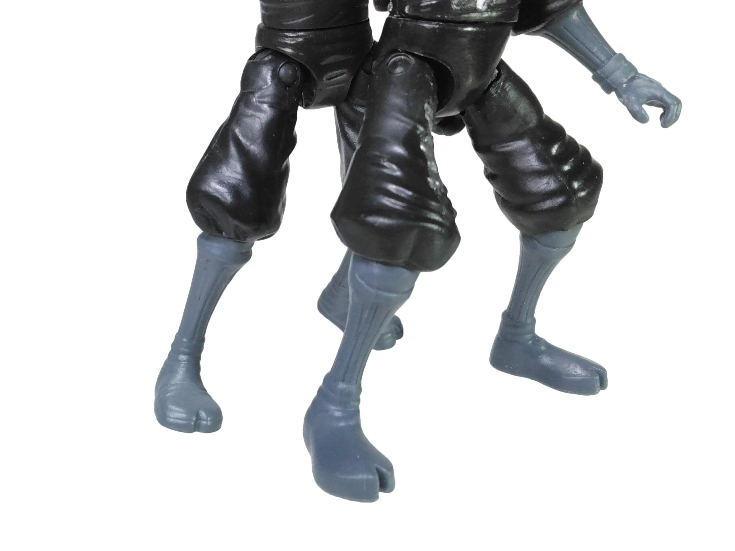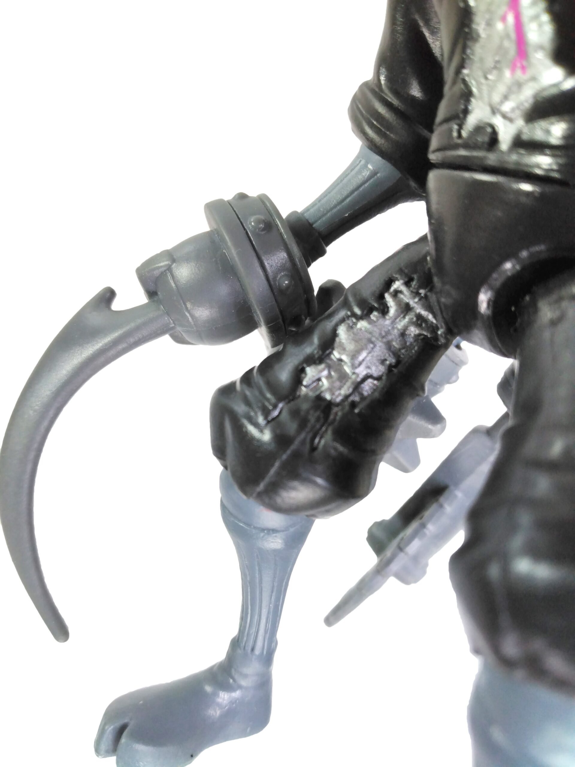 La figurine a rencontré quelques modifications au cours de sa production. En effet, les usines responsables de sa fabrication n’ont pas utilisé les mêmes procédés. Ainsi, dès la première édition de cette figurine, nous retrouvons des versions à la sculpture plutôt mat, avec un gris utilisé pour les bras/jambes et les armes alternant entre le clair et le sombre. Par ailleurs, le trou d’insertion de ces armes a été, au début, circulaire. Les accessoires tenaient très mal entre les mains de la figurine. En réponse, Playmates Toys a veillé à y apporter une modification majeure, probablement à la fin de l’année 2014, avec une insertion rectangulaire (Fig. 2). Ainsi, les armes demeuraient bien plus stables au bout des bras. Lors de ces rééditions, la figurine a également vu sa production s’homogénéiser, avec un gris plus sombre et constant, notamment à partir de 2015.