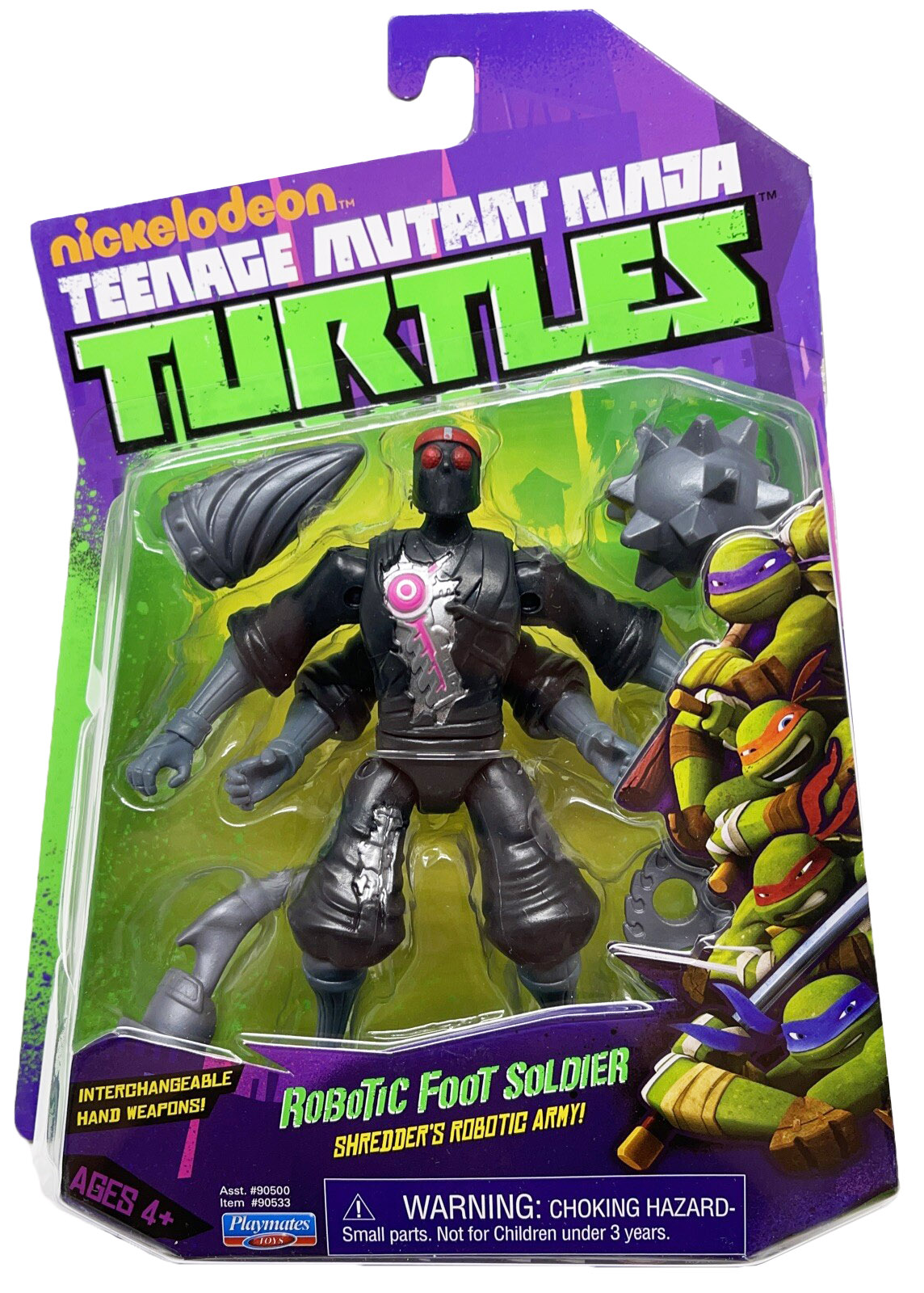 Plus ou moins au même moment, les Footbots étaient réédités avec un sticker circulaire violet sur la bulle avec des codes pour promouvoir le jeu-vidéo Danger of the ooze, sorti le 28 octobre 2014. Nous retrouvons encore des figurines avec des armes claires ou foncées. Celles observées possédaient une insertion rectangulaire pour une meilleure fixation.