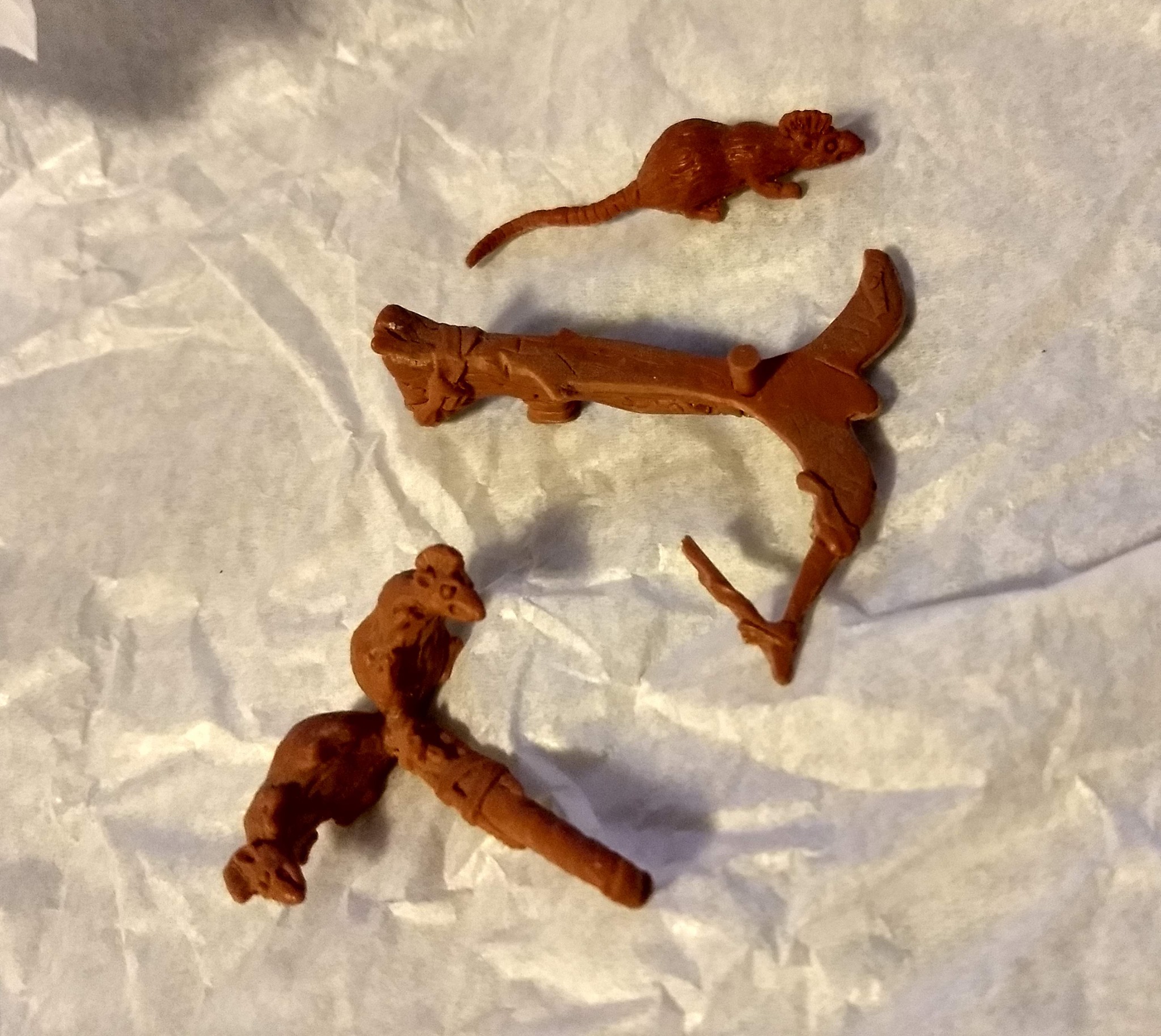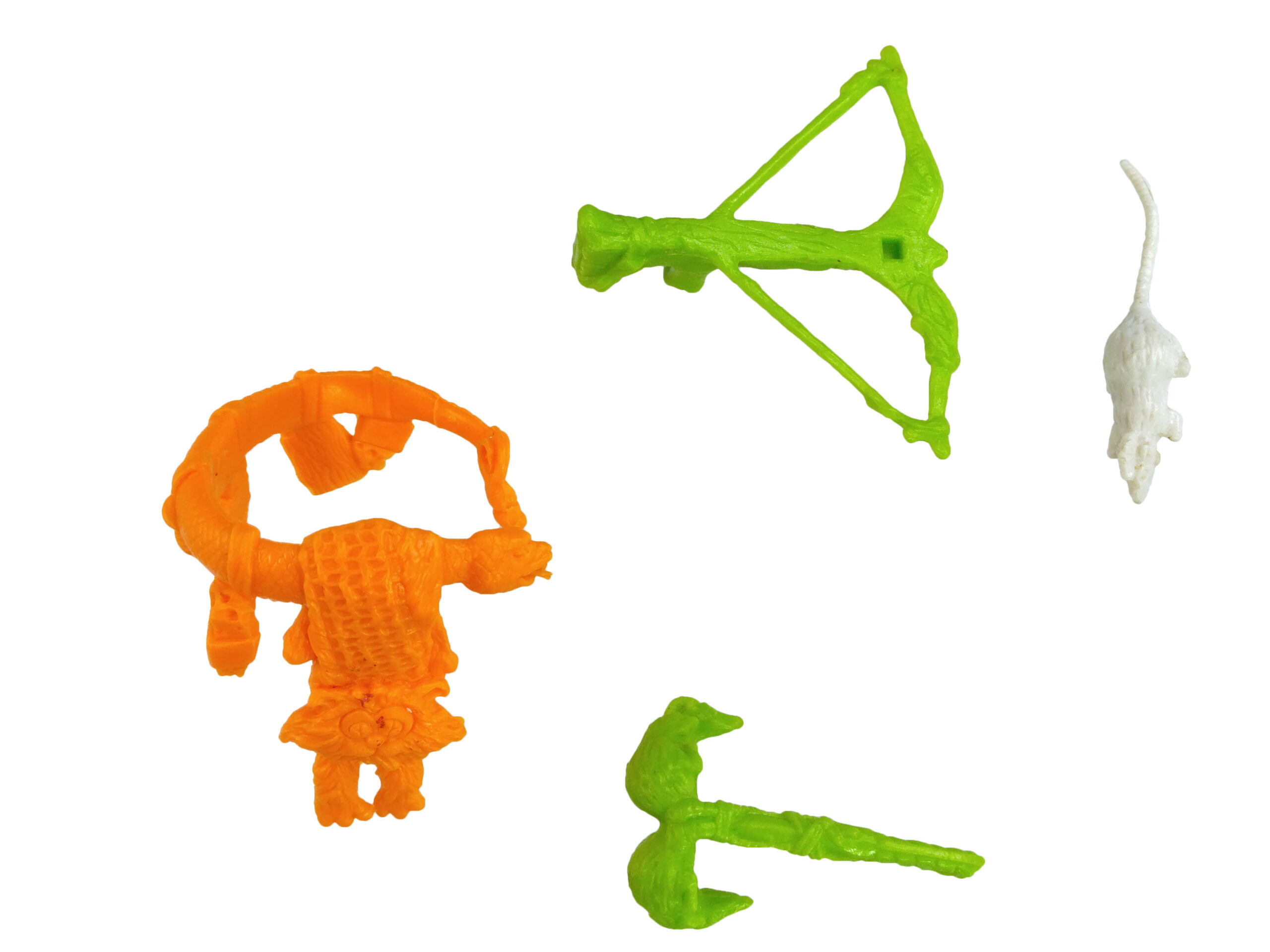 Son arme principale, une arbalète, possède un rat à fixer à la place du carreau classique. Curieusement, ce rat possède un mohawk ! Il se fixe depuis un petit peg à insérer dans l’arme. Le rendu de l’arbalète est quant à lui assez peu détaillé, ce qui tranche avec les armes classiques. Entièrement moulée dans un plastique vert clair, on distingue très mal ses reliefs, comme des bandelettes au niveau de la poignée, pourtant bien visibles sur le prototype (Fig. 4, en fin de review).