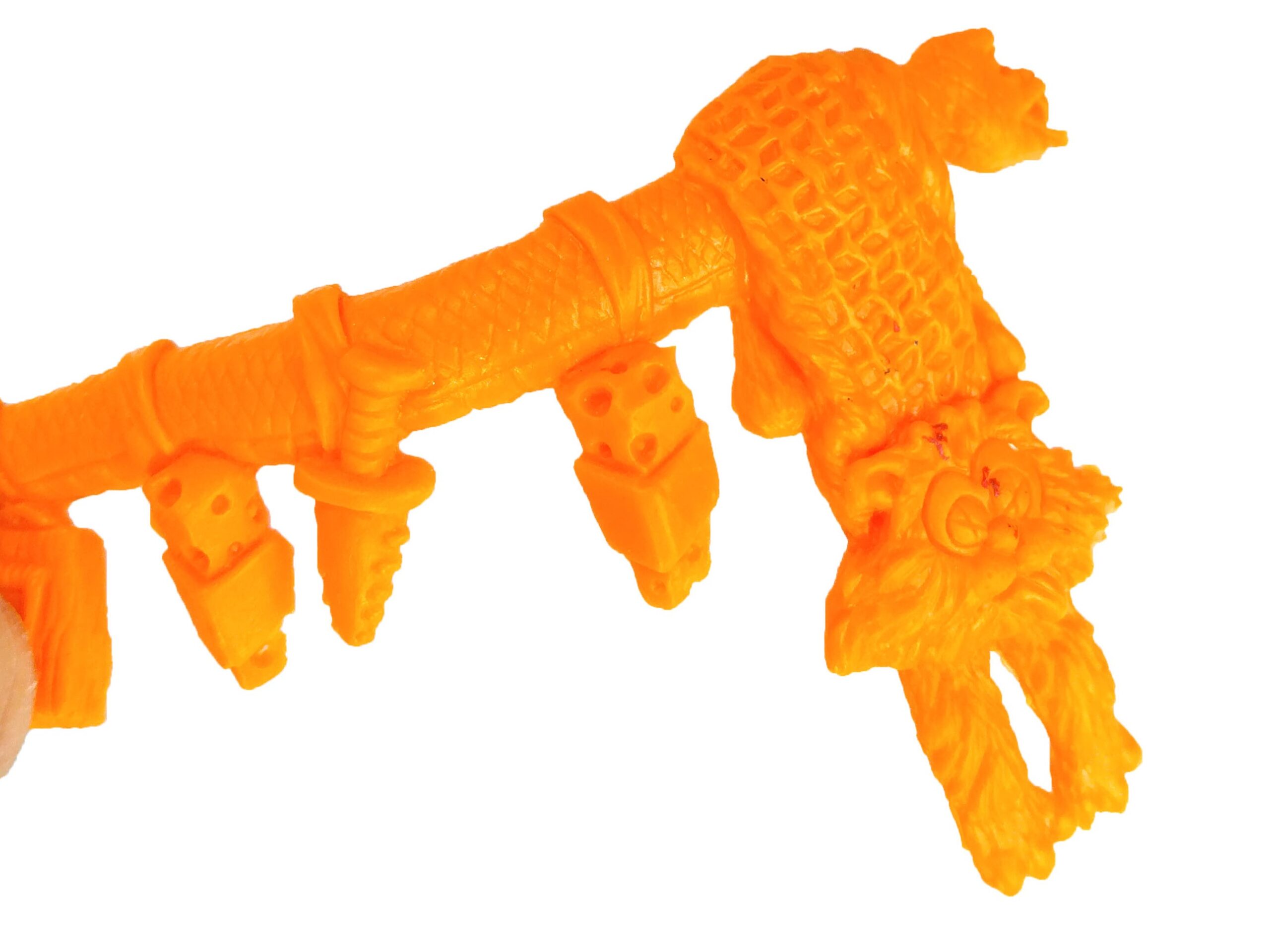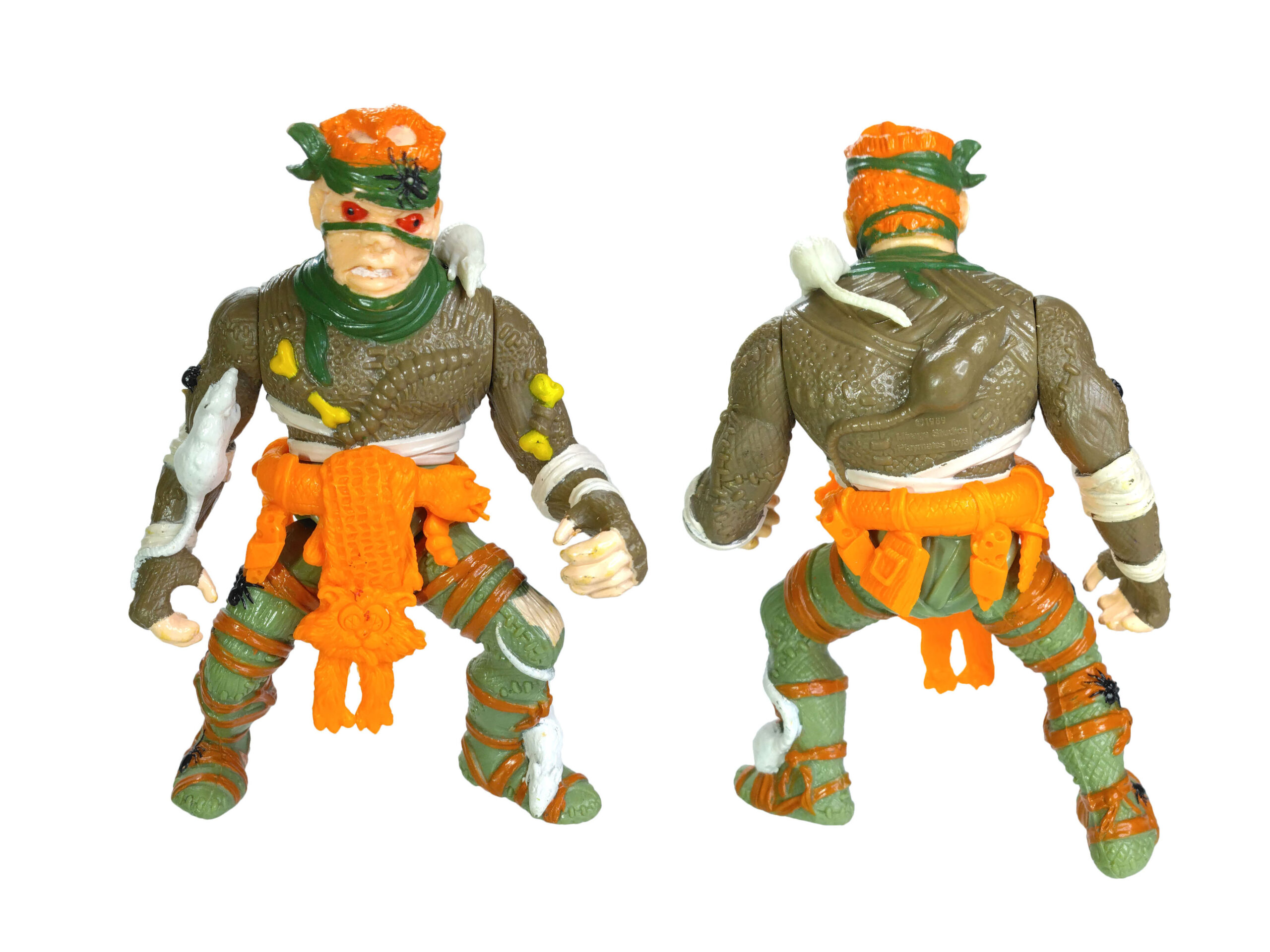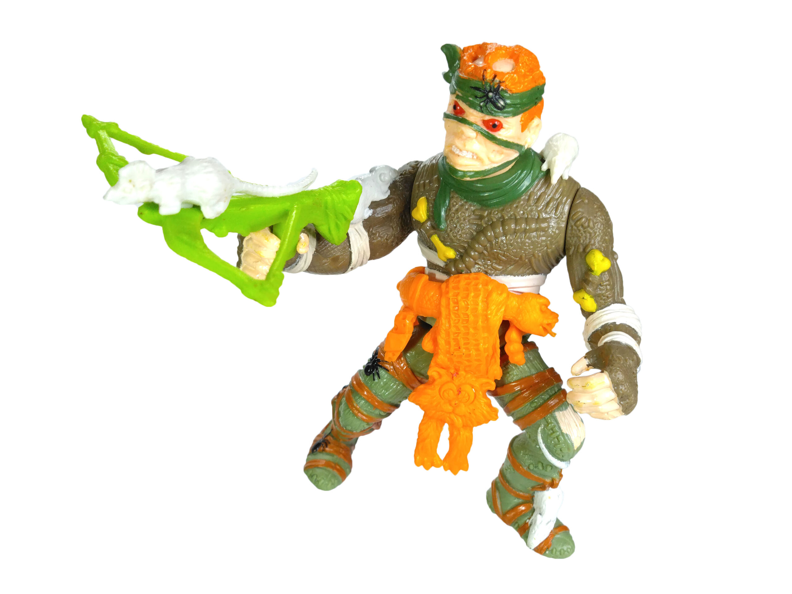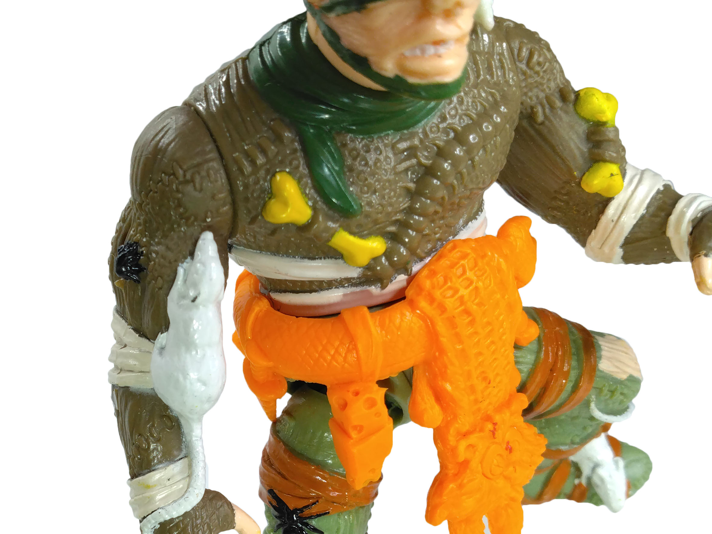 Enfin, la ceinture de la figurine est probablement une des plus détaillée jamais proposée par Playmates Toys. Elle est composée d’un serpent autour duquel sont attachés toutes sortes d’accessoires, comme du fromage, des pièges à souris, des petits couteaux. C’est surtout le « pagne » fait d’un chat qui reste en mémoire tant cette idée est loufoque. Une marque de pneu est visible sur son dos, ses yeux sont incisés de croix et sa langue est tirée.