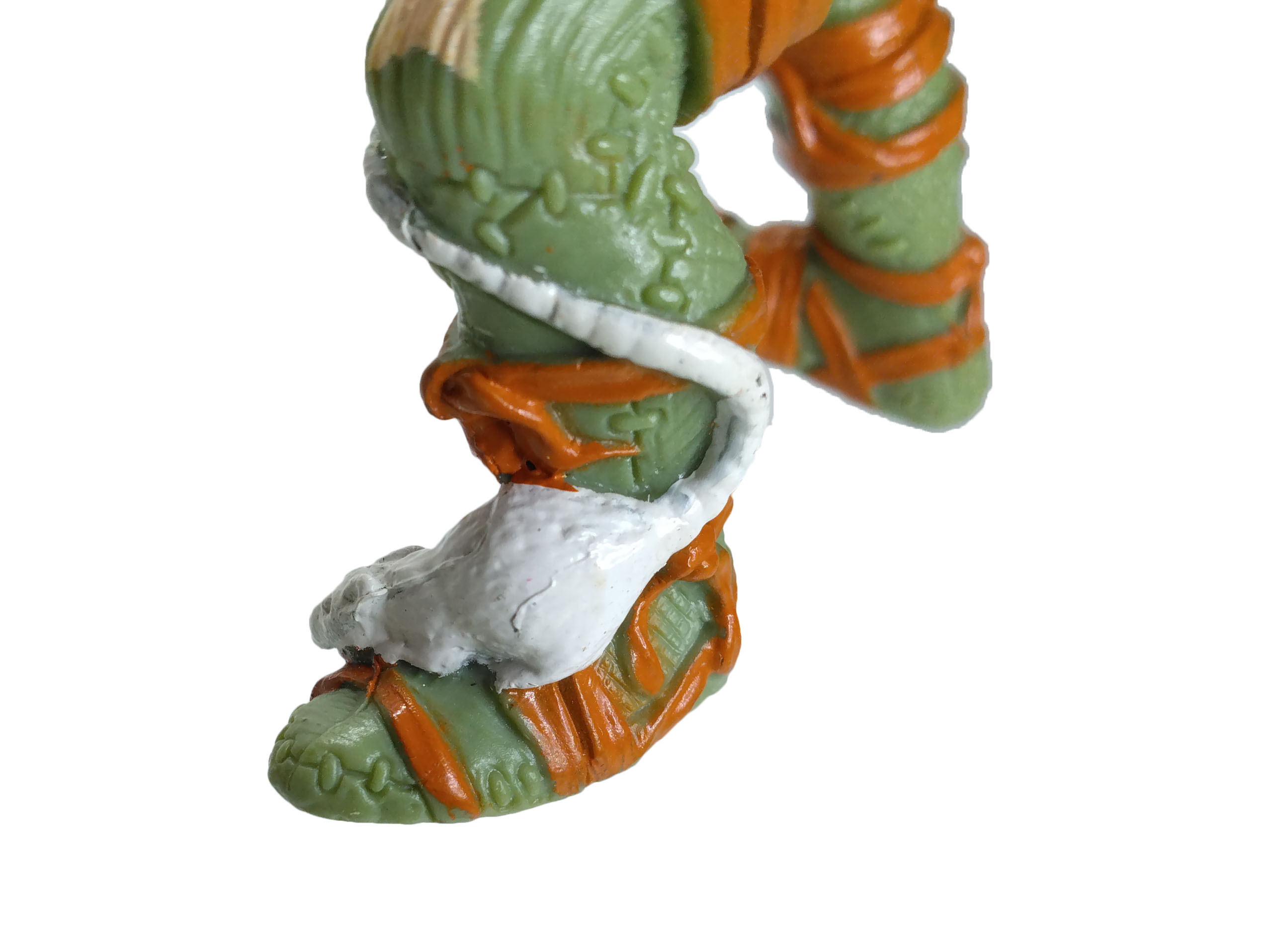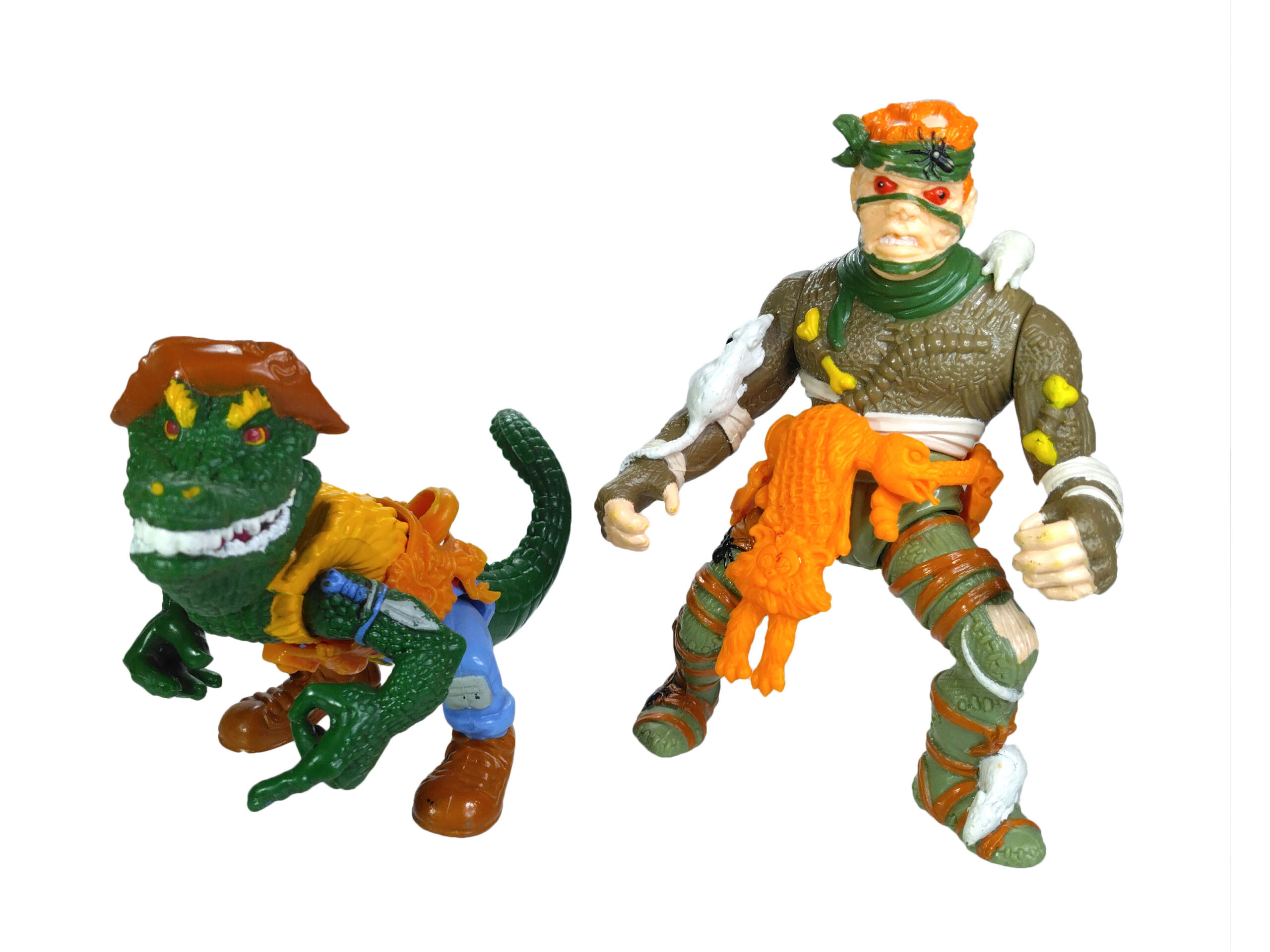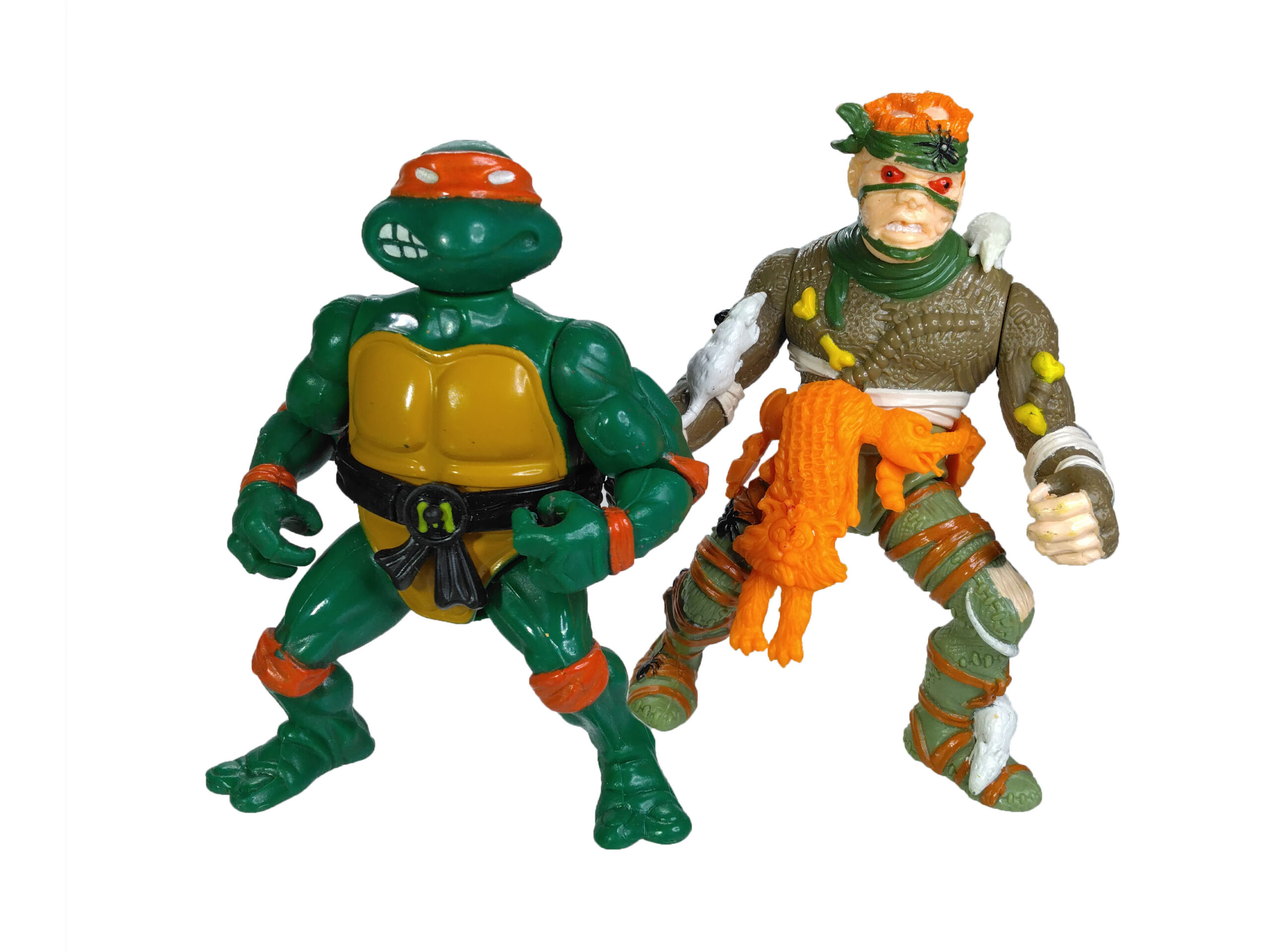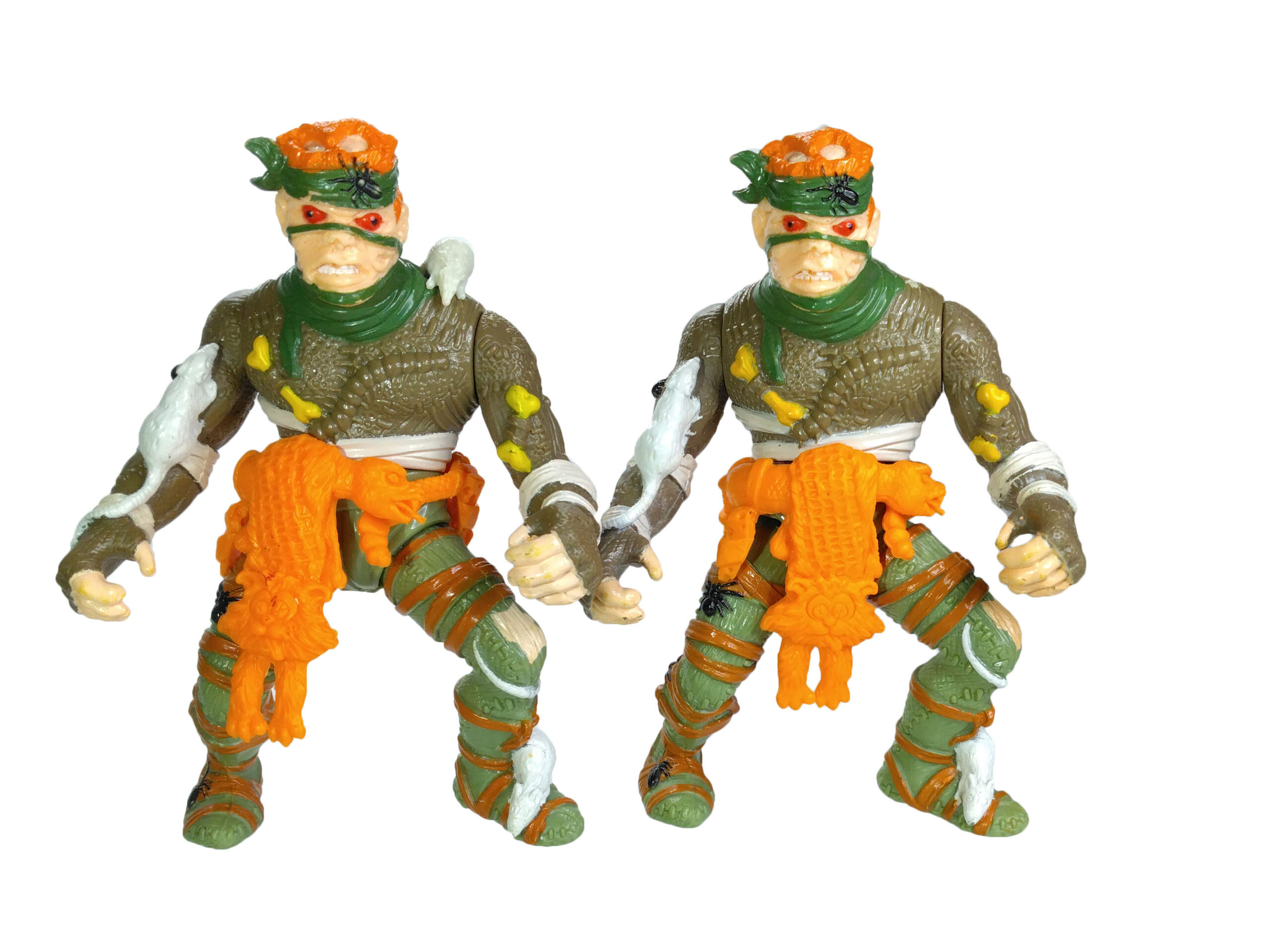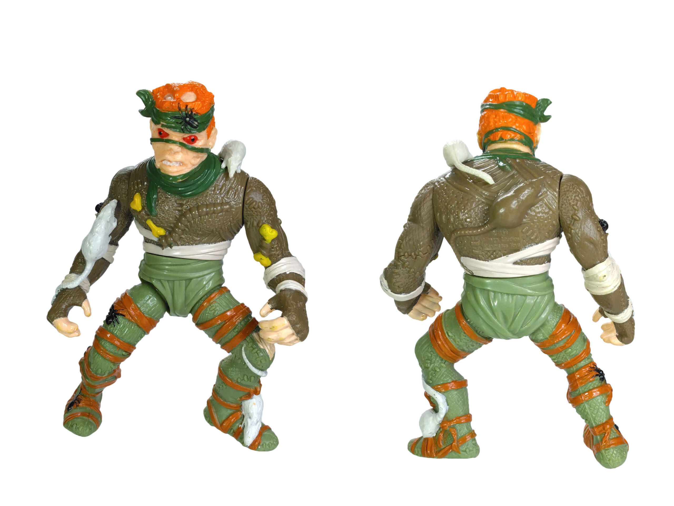 Enfin, la ceinture de la figurine est probablement une des plus détaillée jamais proposée par Playmates Toys. Elle est composée d’un serpent autour duquel sont attachés toutes sortes d’accessoires, comme du fromage, des pièges à souris, des petits couteaux. C’est surtout le « pagne » fait d’un chat qui reste en mémoire tant cette idée est loufoque. Une marque de pneu est visible sur son dos, ses yeux sont incisés de croix et sa langue est tirée.