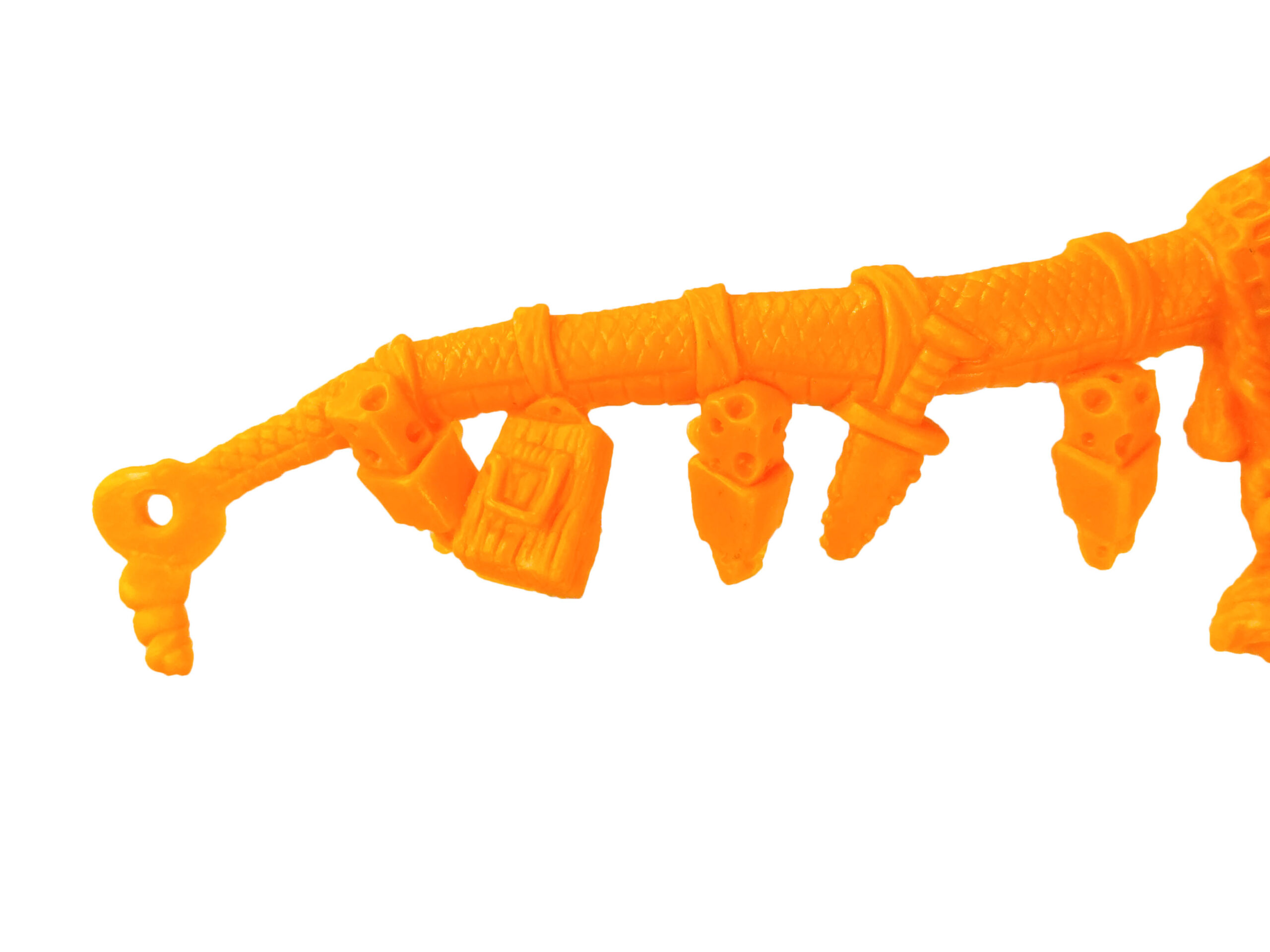 Le grappin est composé de deux rats dont la queue est nouée autour d’un manche. Un trou permet d’y glisser une cordelette. Playmates proposait une ficelle noire et plutôt courte.