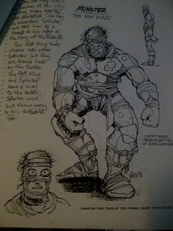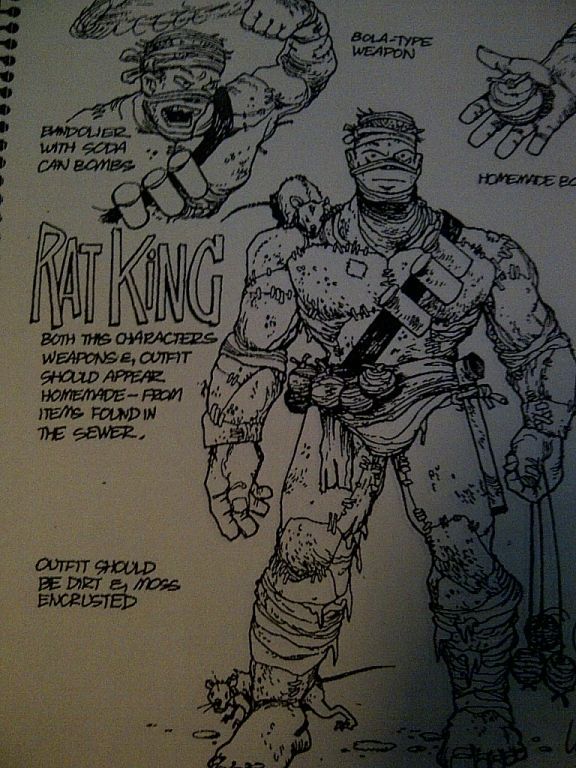 Nous connaissons très peu de détails quant à la conception de la figurine du Rat King. Celle-ci semble avoir été en grande partie inspirée du personnage du Monster du Tales of the TMNT (Vol. 1) #4, qui présente un personnage marginal, étrange, et proche des rats. Il reviendra par la suite dans l’arc City at war. Ces deux concept arts viennent de Jim Lawson, qui fait la transposition entre son personnage (Fig. 1) et la version destinée à Playmates Toys (Fig. 2). Sur ce deuxième dessin, il est possible de voir de nombreuses idées qui n’ont hélas pas été retenues, notamment du côté des accessoires, qui devaient être faits de matériaux trouvés dans les égouts (grenades de conserves, tuyau…). Le sculpteur de la version finale est inconnu. Du côté des accessoires, ceux-ci ont été finement sculptés, hélas le rendu final est loin de leur faire honneur.