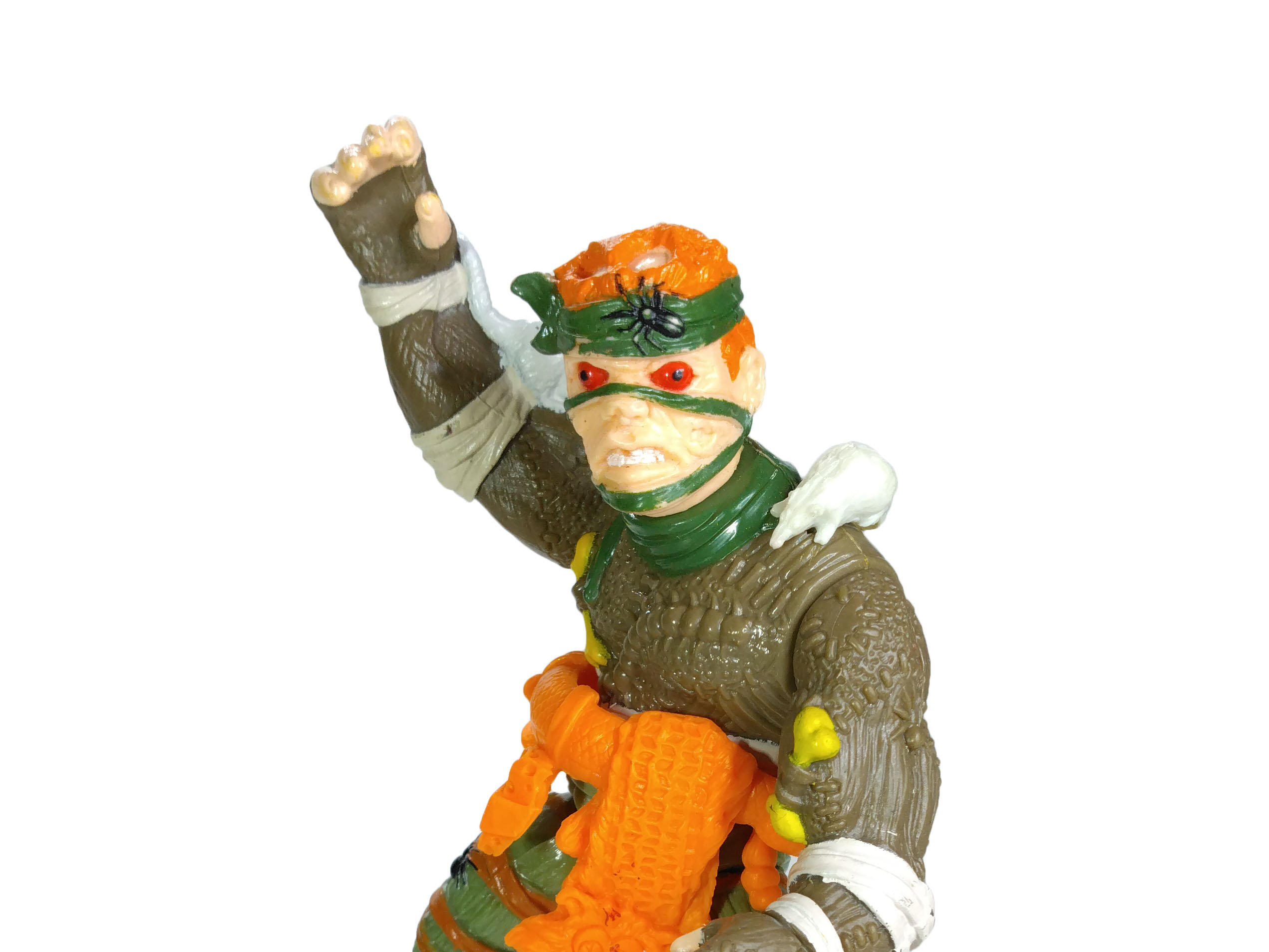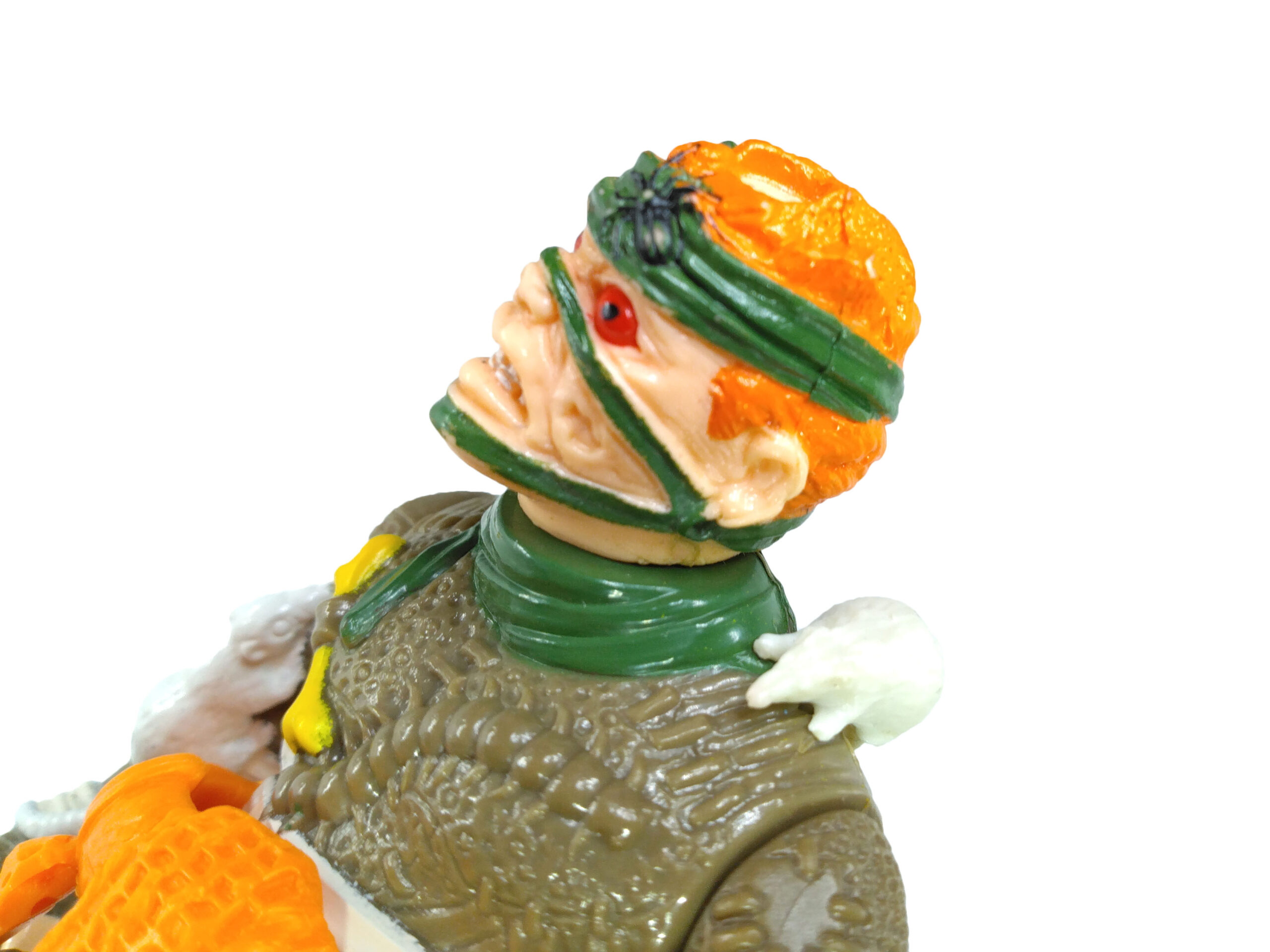 La figurine du Rat King est assez spéciale à plus d’un titre. Personnage humain, plutôt droit et avec des articulations peu courantes. Rajoutons à cela le côté morbide de sa tenue, entre animaux des égouts et une ceinture avec un chat écrasé. C’est clairement la figurine la plus glauque que Playmates ait sorti à ce moment (voire de toute la gamme ?).