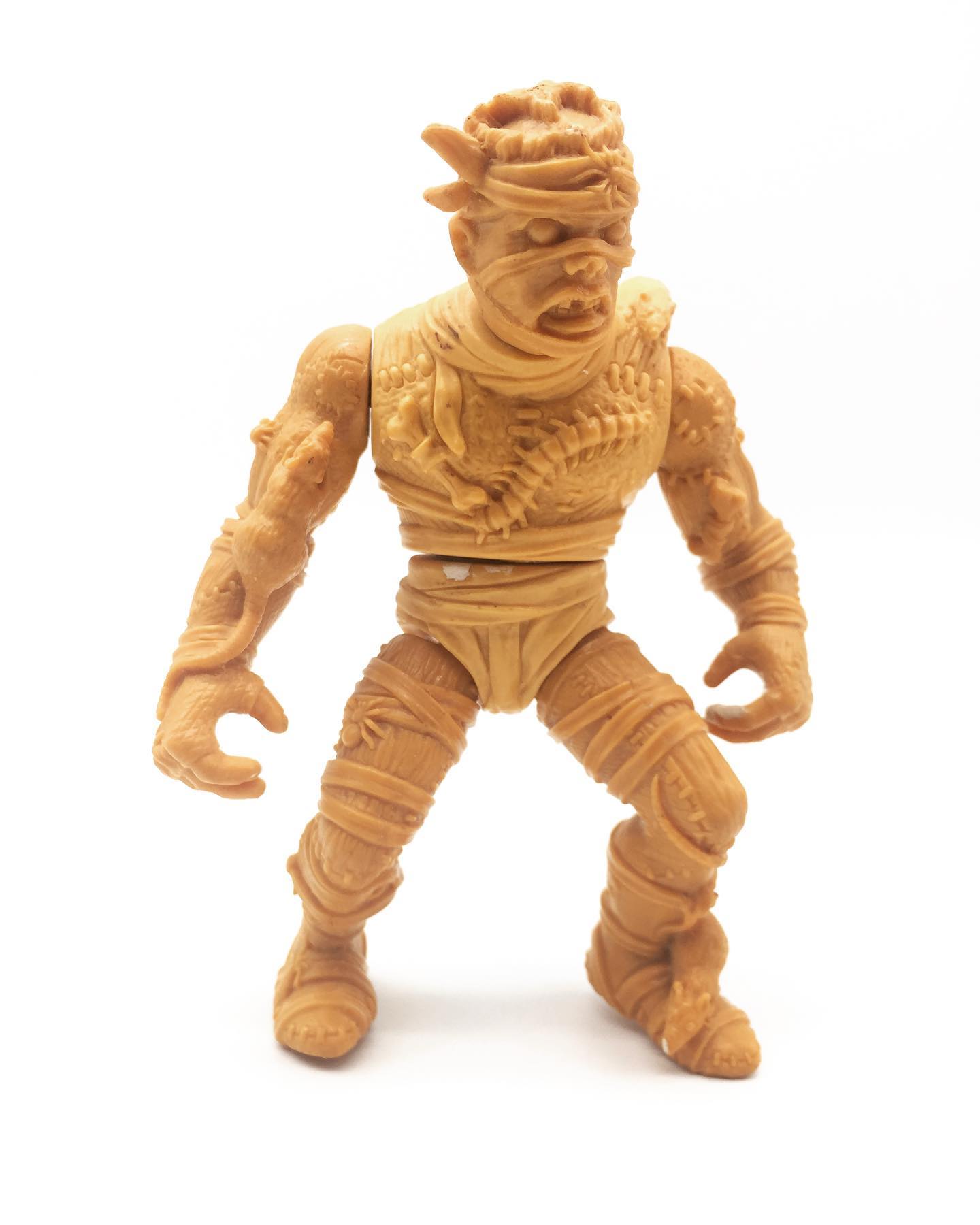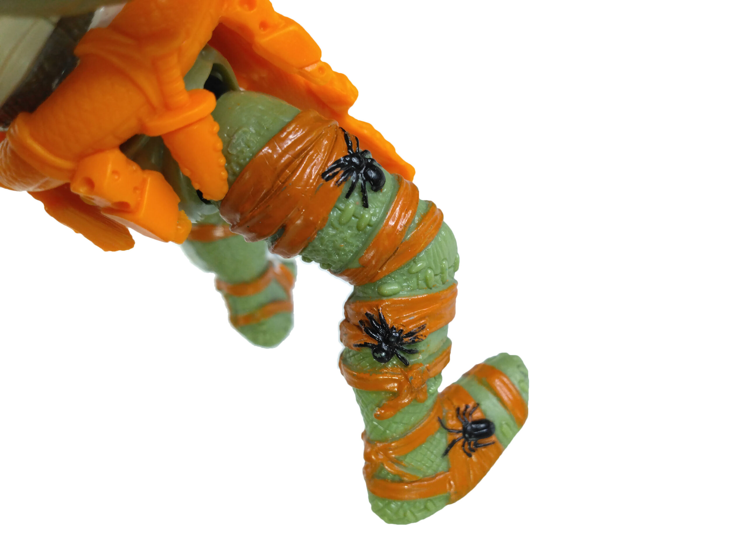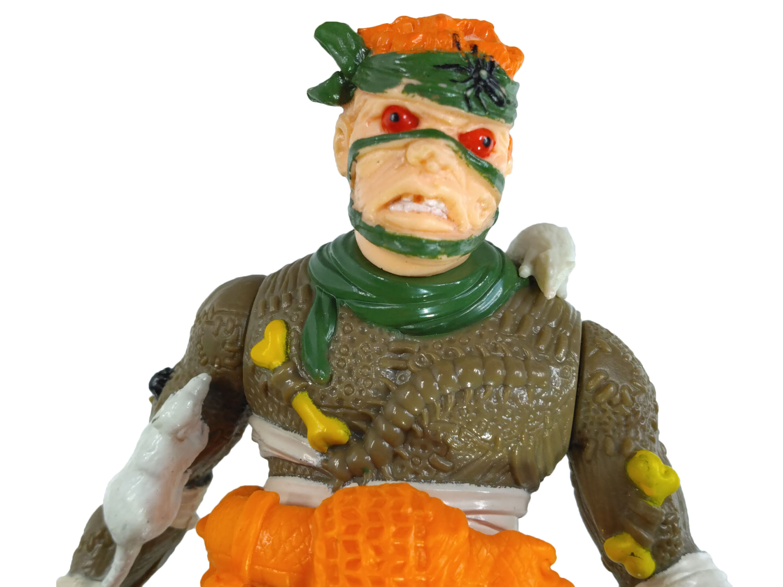 Le visage du personnage est plutôt effrayant. Il possède des trous dans ses cheveux et le visage, défiguré, masqué derrière des bandelettes, avec un regard vide, des yeux exorbités. J’aime particulièrement le quatrième rat sur la tenue, qui est une pièce de plastique rapportée, fixée au niveau de son épaule gauche. Du fait de sa fixation, il arrive hélas que celui-ci soit cassé sur les exemplaires vendus de nos jours. Il épouse très bien l’épaule du personnage, avec le bas du corps et sa queue qui pendent dans le dos.