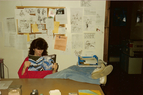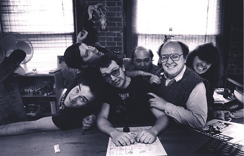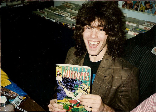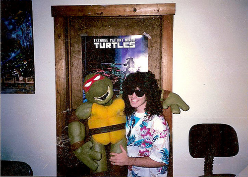 Il en profita avec son ami Berger pour leur faire un dessin et l’ancrage. En rentrant chez lui, il se rendit compte que la dédicace allait au-delà. Les deux artistes avaient beaucoup aimé le dessin qu’ils leur avaient fait et désiraient les rencontrer. Brown et Eastman communiquèrent par courrier, et le jeune artiste leur envoya d’autres de ses dessins. Très vite, il fut engagé pour encrer les dessins pour le deuxième livre de Palladium books, Eastman et Laird étant trop occupés avec leur comic principal. Les deux artistes n’avaient pas encore en vue d’agrandir leur équipe artistique. Il continua malgré tout ce travail, de temps en temps, jusqu’en 1988, lorsqu’il eut l’opportunité de travailler avec Steve Lavigne sur la création de produits TMNT. Les années passant, il put affirmer sa place au sein de Mirage et fit partie de la dream team artistique. Et s’il y en a bien un que l’on ne peut pas rater sur les photos, c’est bien Ryan Brown et son impressionnante chevelure !