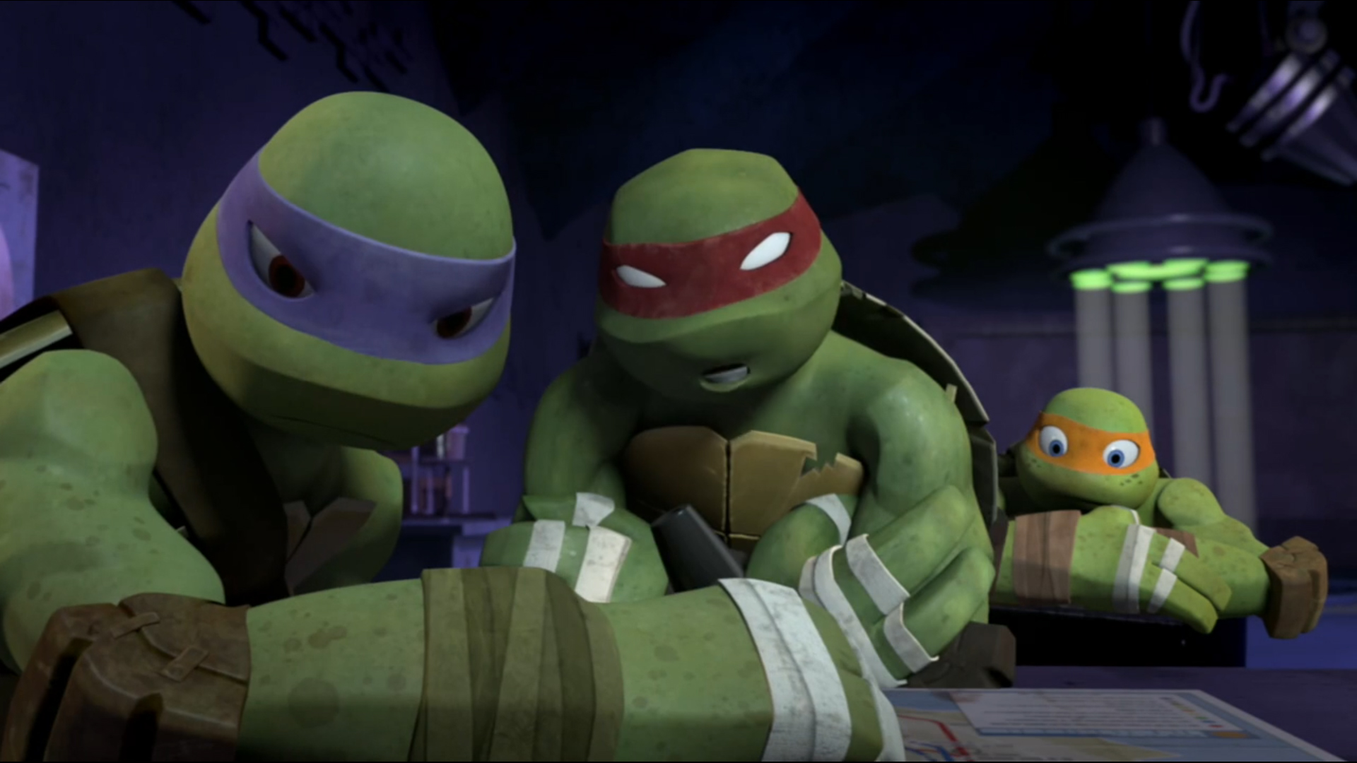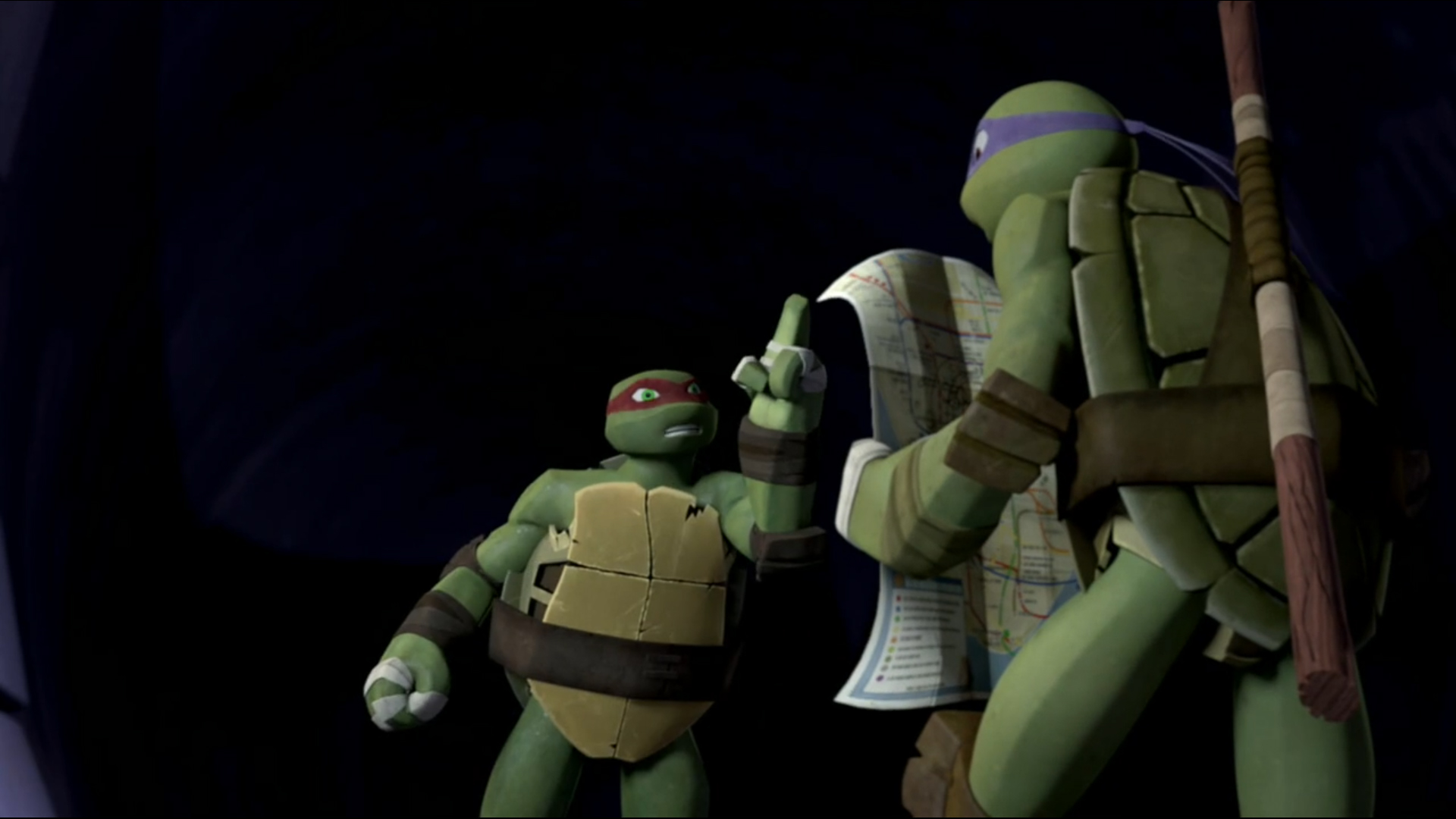 Les autres tortues étaient de retour dans leur repaire. Donatello travaillait sur un plan de métro pour essayer de retrouver Snakeweed. Le pauvre bricoleur essuyait les brimades d’un Raphael bien décidé à réparer leurs erreurs et sauver le livreur de pizza. Au même moment rentrait Leonardo, abattu. Michelangelo lui sautait dans les bras heureux de le revoir, mais son frère n’était pas d’humeur. Il avait été vaincu et ne voulait pas en parler. Ses yeux étaient encore rouges de l’irritation de la poussière de son ennemie. Michelangelo essayait de le réconcilier avec Raphael, rien n’y faisait. Finalement, Donatello était parvenu à dresser une zone où se trouvait potentiellement la cachette de Snakeweed à partir des points où il avait été repéré ces derniers temps.