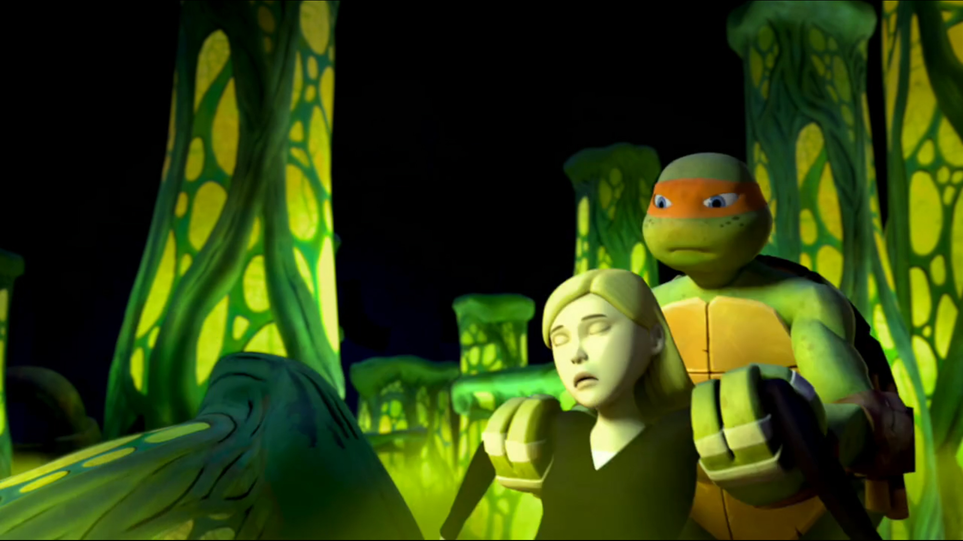 Totalement perdu, Leonardo venait frapper aux carreaux d’April pour lui demander conseils. La jeune femme, apprenant qu’il avait rencontré une femme, était aux anges et l’écoutait. Devenait-il amoureux ? Elle était belle et pratiquait les arts martiaux. Mais entendant qu’elle appartenait au Foot Clan, sa main partait à la figure du mutant. Aucun prétexte de la tortue n’était valable. Peut-être était-elle intelligente ou amusante. Il ne fallait pas lui faire confiance ! Mais le ninja sentait du bon en elle. April préférait lui claquer la fenêtre au nez, elle en avait trop entendu.