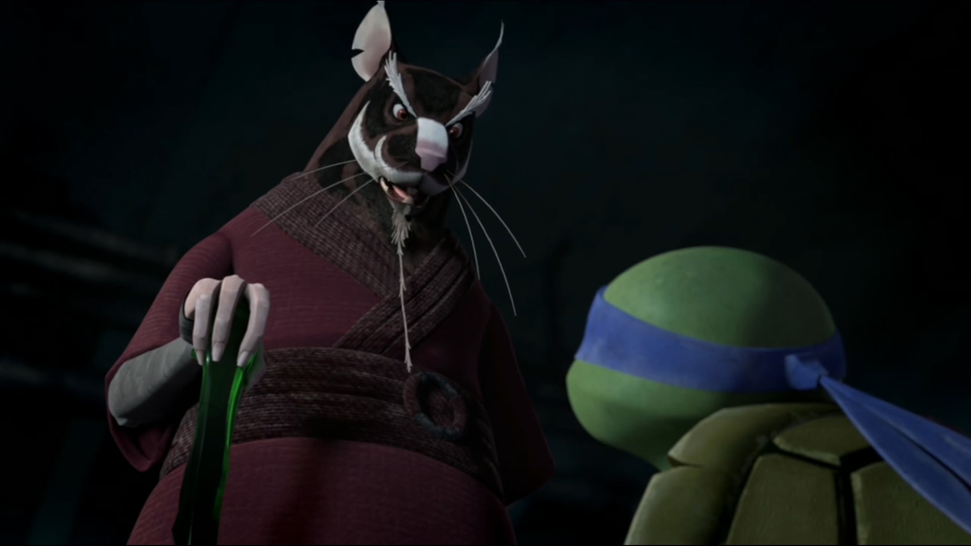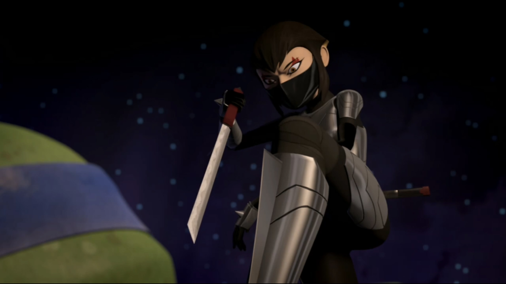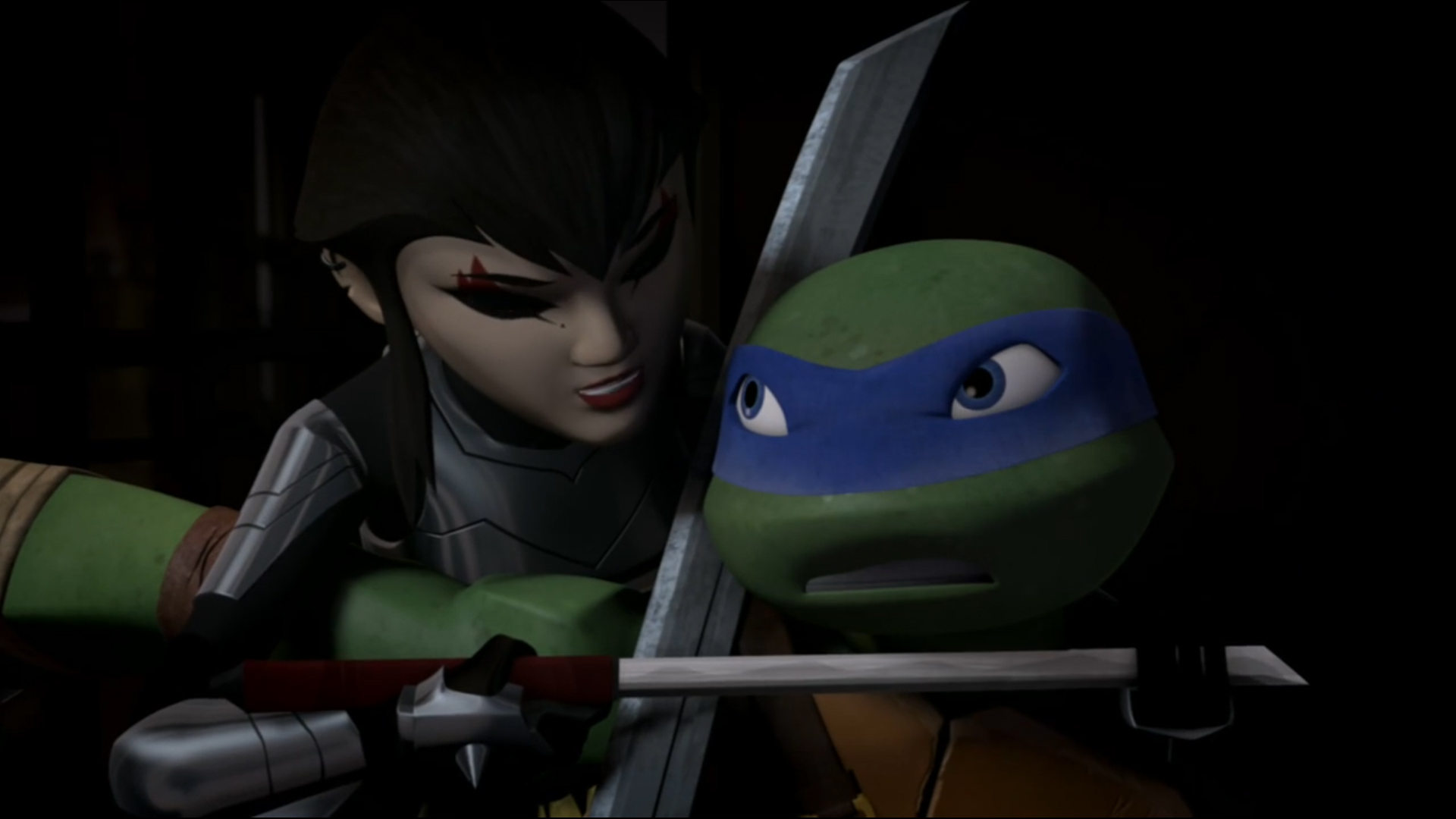 Au sommet de l’immeuble, Karai s’impatientait de la venue de Leonardo. Une fois la tortue arrivée, elle lui donnait des jumelles pour qu’elle regarde vers une fenêtre. S’y trouvait exposé dans une vitrine le sabre du grand Miyamoto Musashi, le plus grand épéiste du Japon. Elle voulait que le ninja le dérobe pour lui-même. Il en était hors de question pour Leonardo. La main de Karai glissait vers la poignée de son tantō, puis elle renversait la tortue au sol.