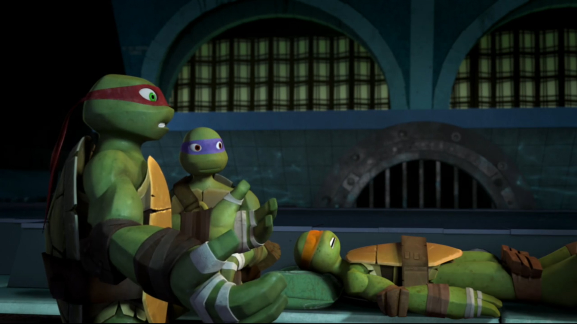 Raphael et Donatello accouraient dans le repaire en portant Michelangelo. Splinter était très inquiet. Le chef de l’équipe ne savait pas où était Leonardo et se sentait totalement démuni. Il comprenait le poids du rôle qui incombait à son frère. Soudain, Donatello recevait un message d’April.