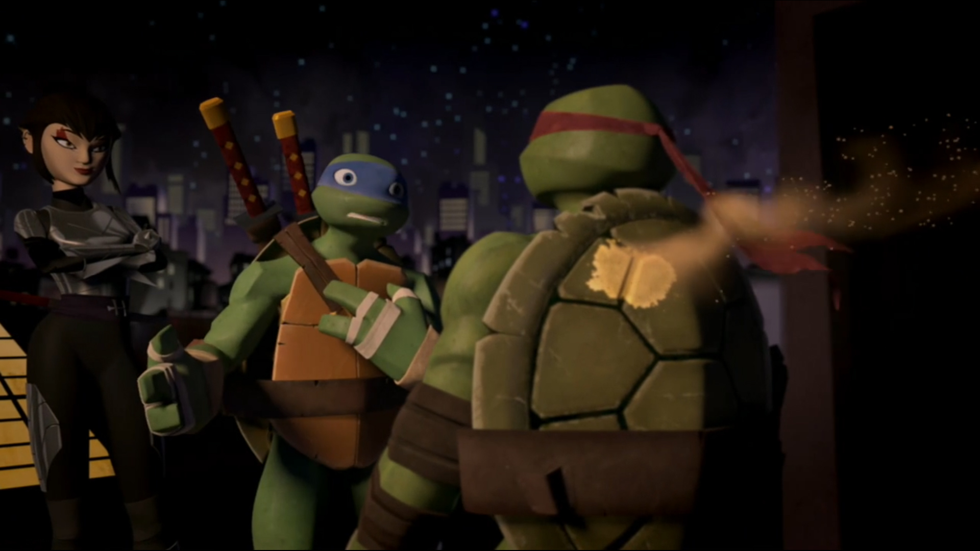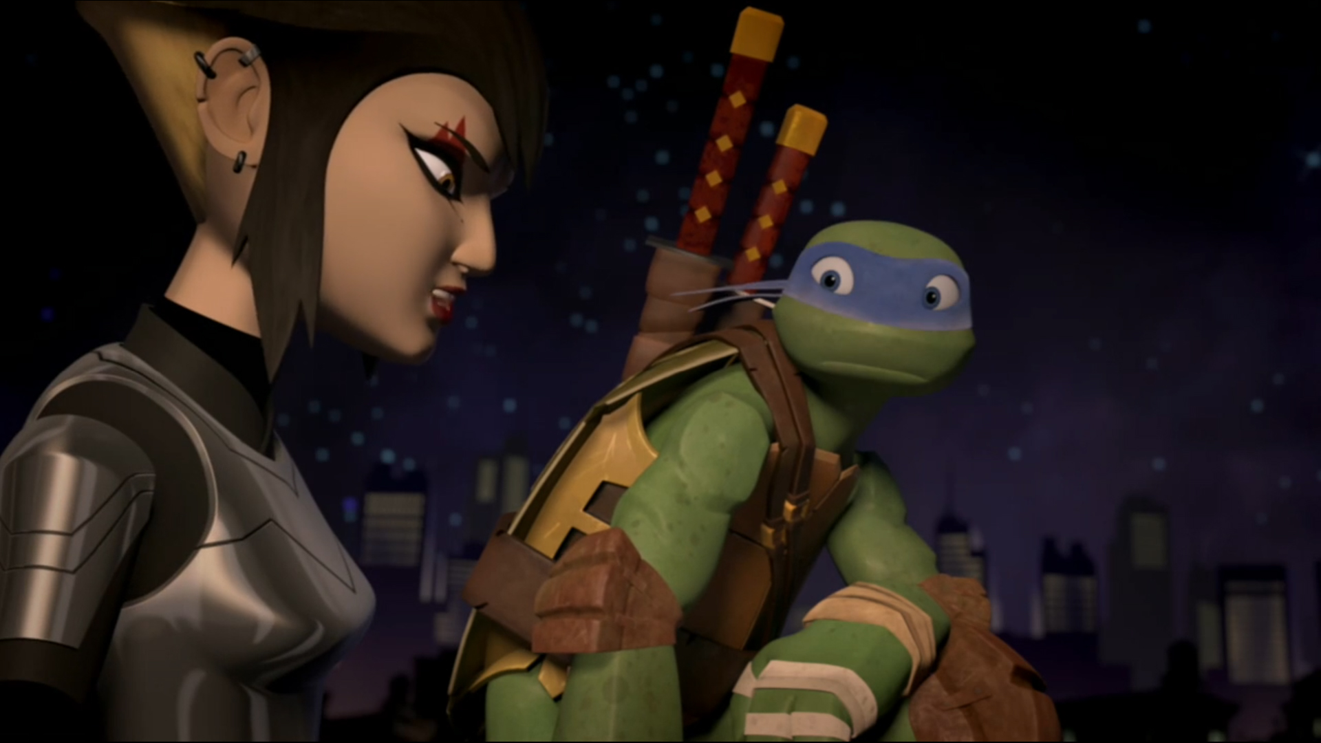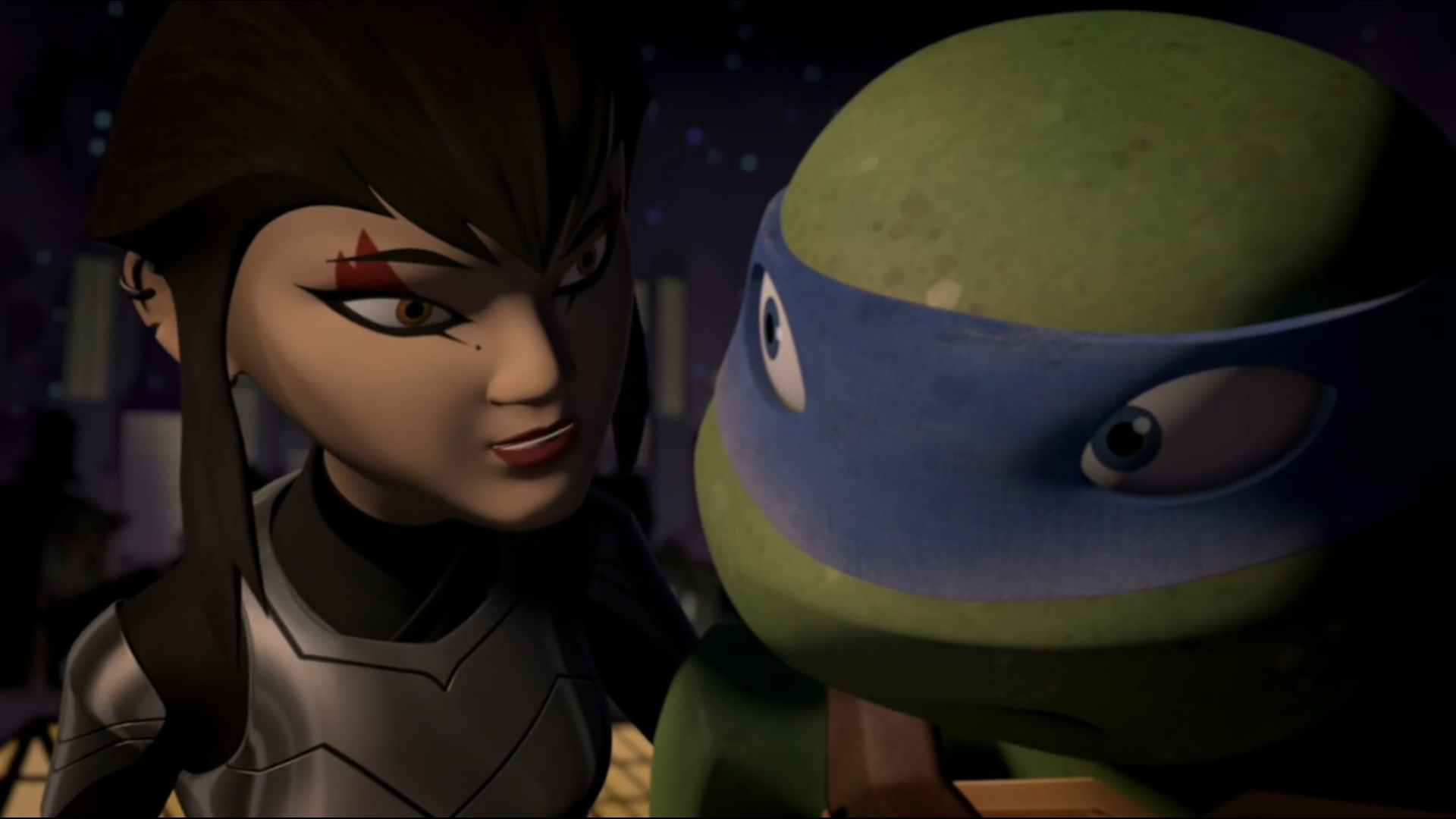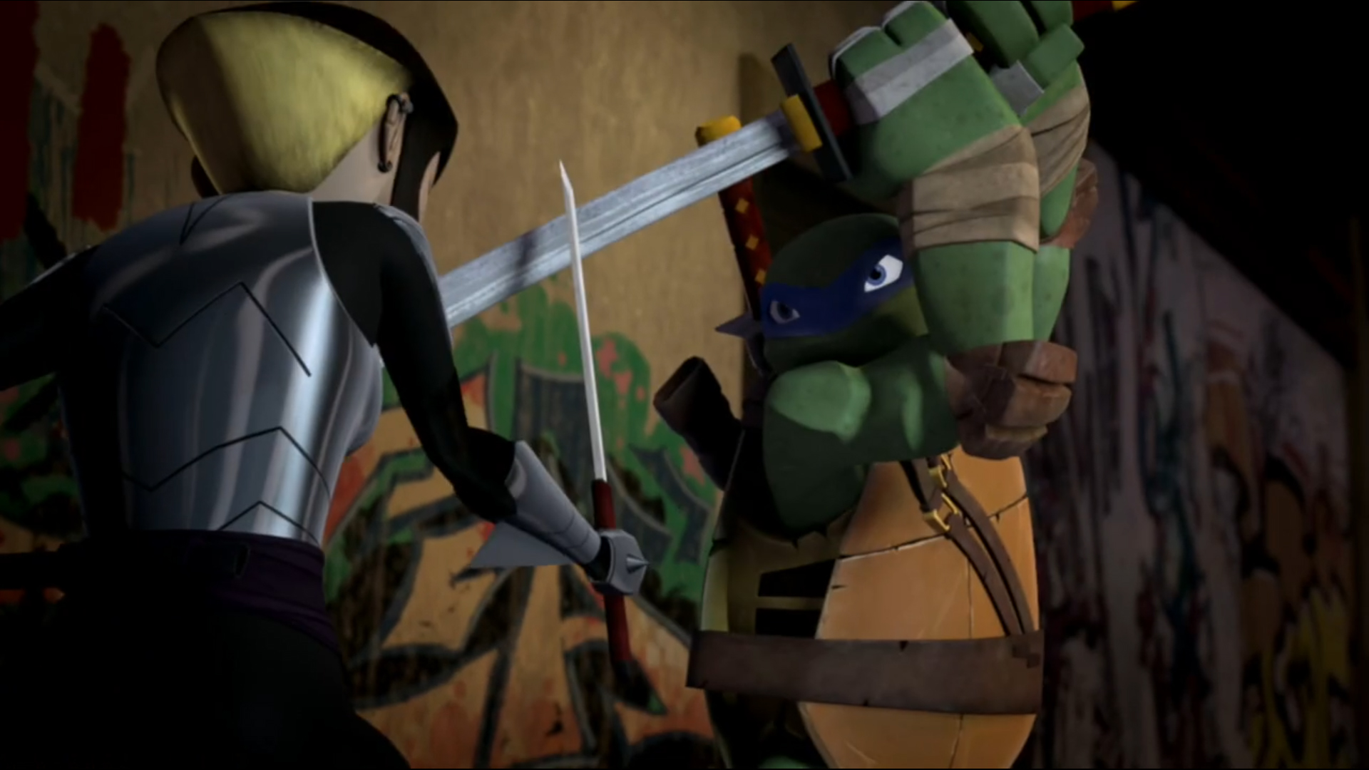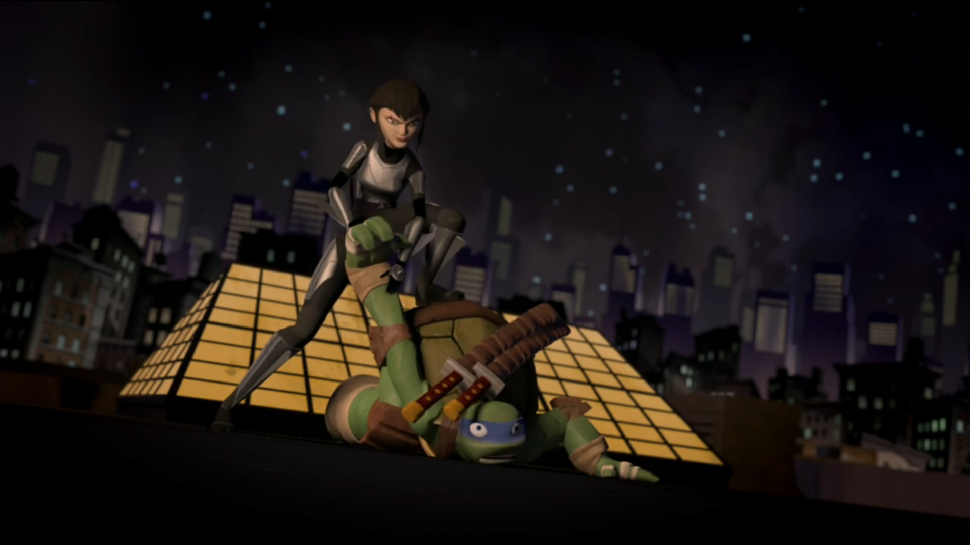 Cette nouvelle dispute avait mise Leonardo hors de lui. La tortue commençait à donner des coups dans les bouches d’aérations sur le toit d’un immeuble. Soudain, des ninjas Foot déferlaient sur lui. La poignée de malheureux mordait la poussière en quelques instants. Mais la tortue percevait quelque chose d’étrange non loin. Une jeune femme au visage masqué. Celle-ci s’avançait face au mutant qui se tenait sur ses gardes. Soudain, elle dégainait une lame cachée dans son dos ; à la sortie de son tantō, un nuage de poussière volait au visage du mutant qui étouffait. Il était immédiatement renversé par la femme qui se nommait Karai. Elle lui disait simplement à bientôt puis disparaissait dans la nuit.