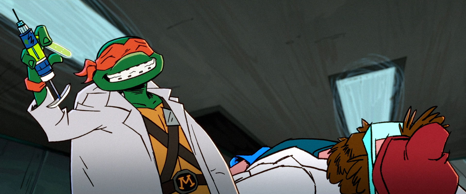 Le courant était rétabli en quelques minutes par les gardes. Les caméras de nouveau rétablies, ceux-ci voyaient les deux intrus évoluer dans le zoo à travers les caméras de surveillance. Sans perdre de temps, Michelangelo et Rod parvenaient à l’infirmerie du zoo. La tortue prenait une seringue et prélevait de son propre sang pour le donner à son nouvel ami. Ce dernier se faisait une joie à l’idée de devenir enfin un mutant. Il se cherchait déjà un nouveau nom. À l’entendre, Michelangelo doutait réellement que ce soit une bonne idée. Alors que la tortue s’apprêtait à lui injecter son sang, les gardiens du zoo pénétraient dans l’infirmerie.