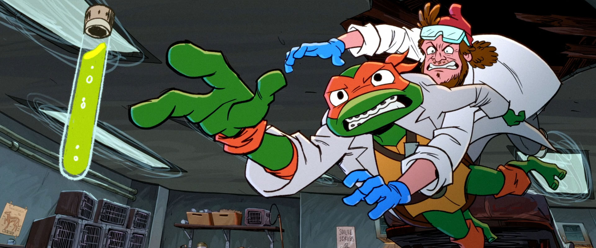 Sans perdre de temps, Rod pressait Michelangelo pour qu’il lui fasse l’injection de son sang. Le scientifique quelque peu étrange était persuadé qu’il deviendrait un féroce mutant capable de les sauver. La tortue s’exécutait à contre cœur. Une fois l’injection effectuée, son nouvel ami sautait au milieu de la salle en poussant d’énormes cris… De souffrance ? D’agressivité ? Rod était-il devenu une redoutable créature ? Rien ne se passait. Il ne s’était pas transformé. Face à cet échec, Rod regardait à la ceinture de la tortue. Se trouvait un petit bocal avec son sang. Il n’avait pas fait l’injection de son sang mais l’avait remplacé pour le leurrer.