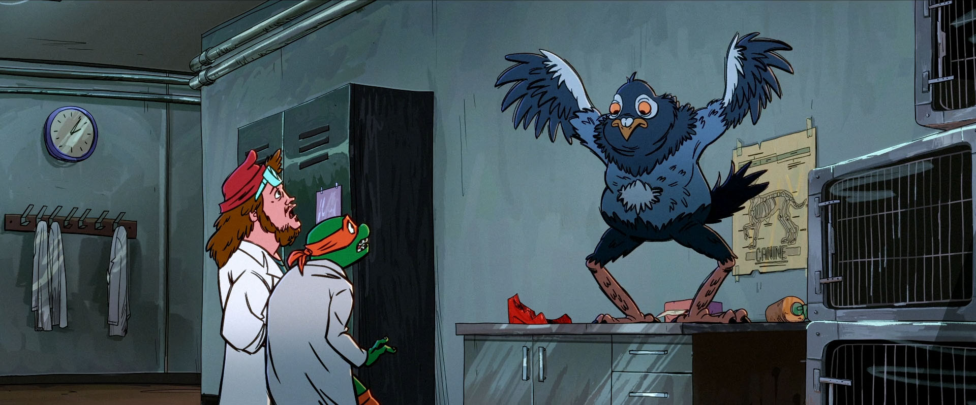 Au même moment, le plafond cédait sous le poids du Mechazoid. Rod se jetait sur le flacon contenant le sang de Michelangelo. Celui-ci tombait au sol et rebondissait jusqu’à une poubelle pour se déverser dans d’autres produits chimiques. Un pigeon qui passait par là entrait dans la poubelle pour en ingérer la substance. Soudain, il se transformait en mutant et s’agitait dans tous les sens.