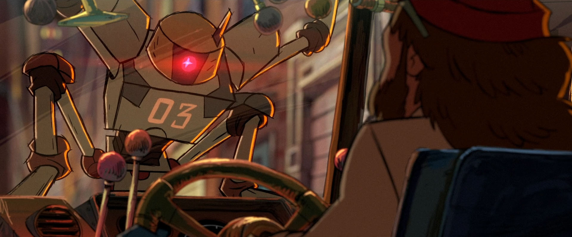 Le Mechazoid 03 était aux trousses de Michelangelo. La tortue était montée à bord d’un camion poubelle. Le chauffeur, Rod, filait à vive allure à travers les rues pour échapper à la machine. Mais bientôt, le robot tueur montait à l’arrière du véhicule. Les deux cibles ne savaient plus quoi faire. Soudain, le Mechazoid bondissait sur le parebrise. Le camion immobilisé, Rod paniquait, expliquant en vain à la machine qu’il n’était que l’otage de la tortue et qu’il travaillait pour Bishop. Ils étaient dans le même camp !! Tout était bon pour survivre. Sans perdre de temps, Michelangelo activait le bras élévateur du camion, précipitant le Mechazoid dans la benne à ordure. Le temps leur était compté. Le mutant saisissait Rod et tous deux filaient à travers les ruelles de la ville.
