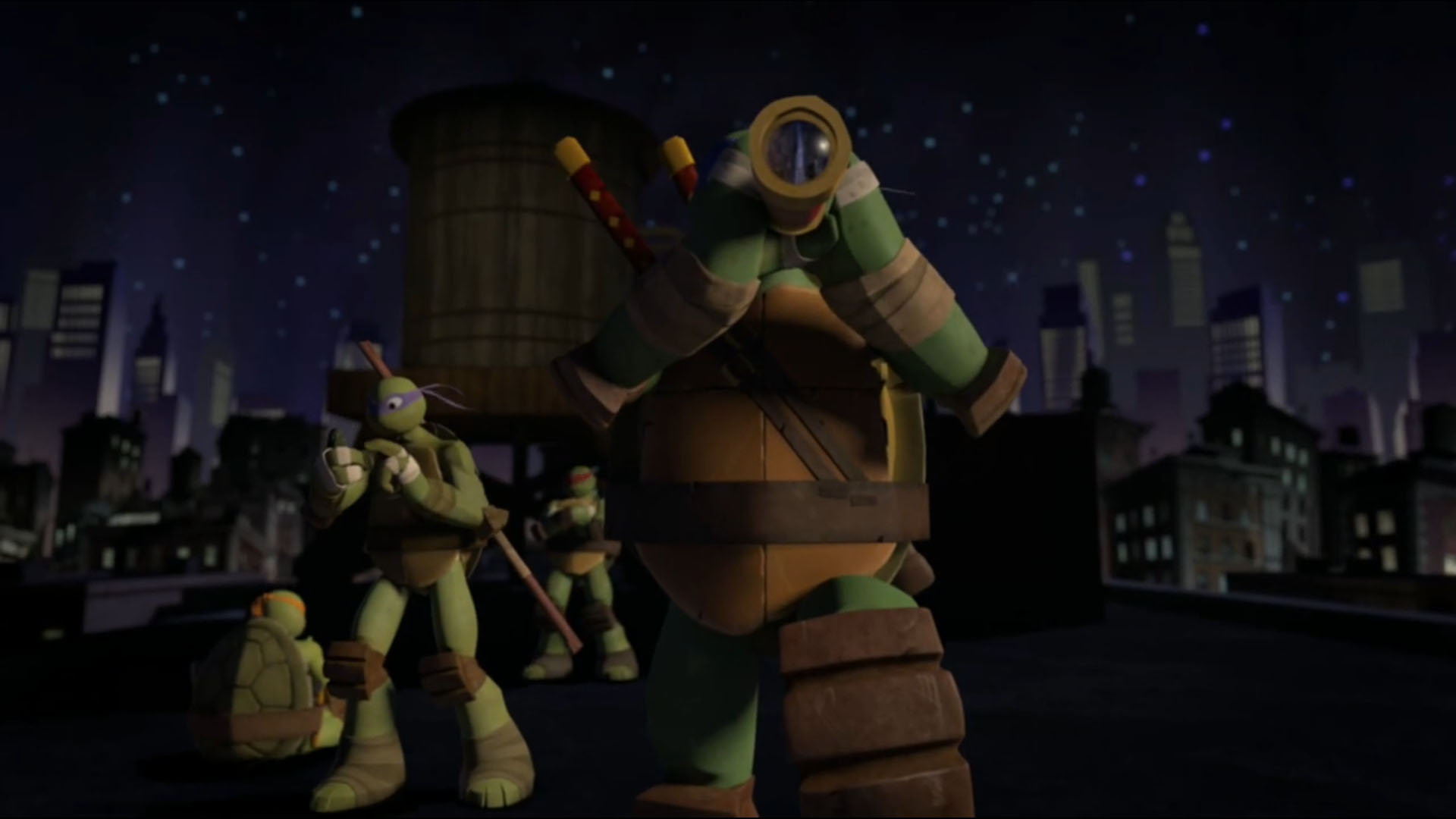 Les tortues étaient aux aguets. Leonardo et Donatello surveillaient la tour du T.C.R.I. depuis le sommet d’un bâtiment. D’après la puce que Donatello avait décryptée, un vaisseau devrait traverser le portail des kraangs dans la nuit. Au même moment, Karai intervenait pour semer le trouble dans l’équipe. Elle prenait Leonardo au combat avant de devoir se séparer des trois autres tortues qui lui sautaient dessus. Impossible pour la jeune femme de les prendre au sérieux jusqu’à ce qu’elle entende parler d’une invasion extraterrestre.