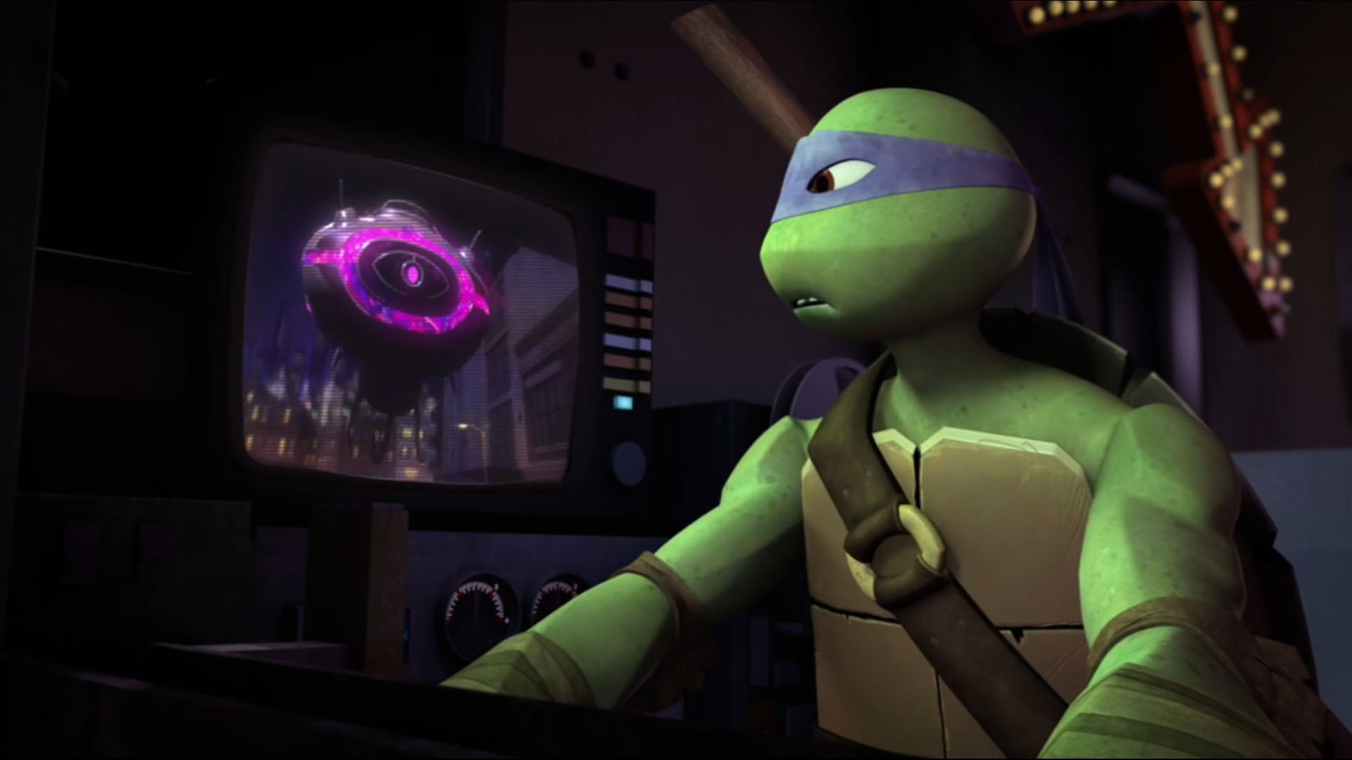 Les tortues étaient également très inquiètes par ce qu’elles venaient de voir. Le vaisseau était très puissant, le combat serait rude. Si Leonardo voulait établir comme toujours un plan, Raphael voulait simplement défoncer cet appareil et suggérait pour cela qu’ils utilisent le Shellraiser et de tirer dans les airs jusqu’à le toucher, même s’il était invisible. Donatello ne trouvait pas cette idée si farfelue. Il proposait qu’ils disposent des radars sur les toits des immeubles, ce qui les aiderait à détecter la présence de l’appareil. Ils n’auraient alors plus qu’à le neutraliser.