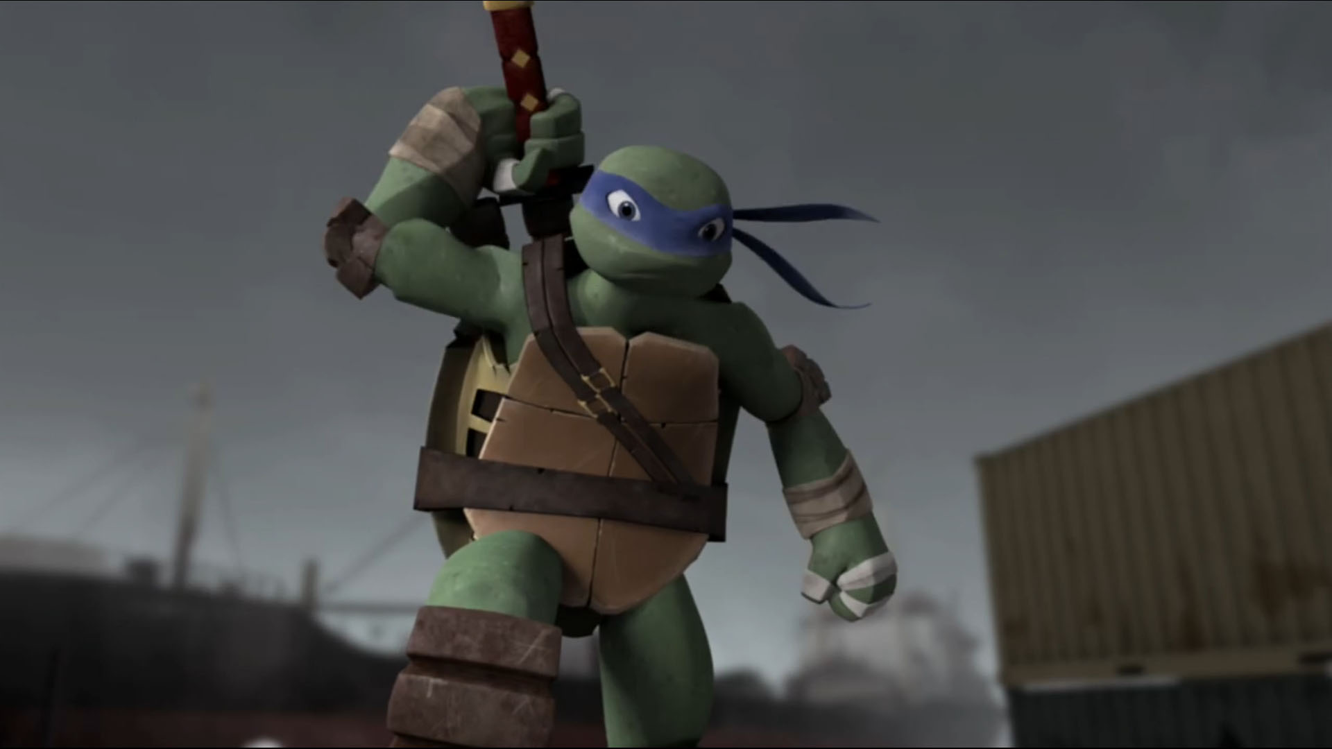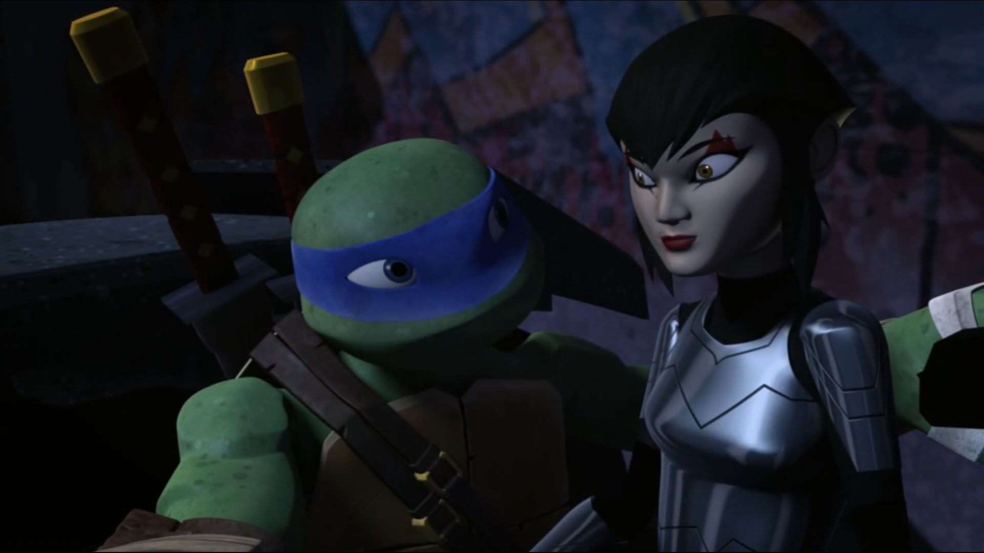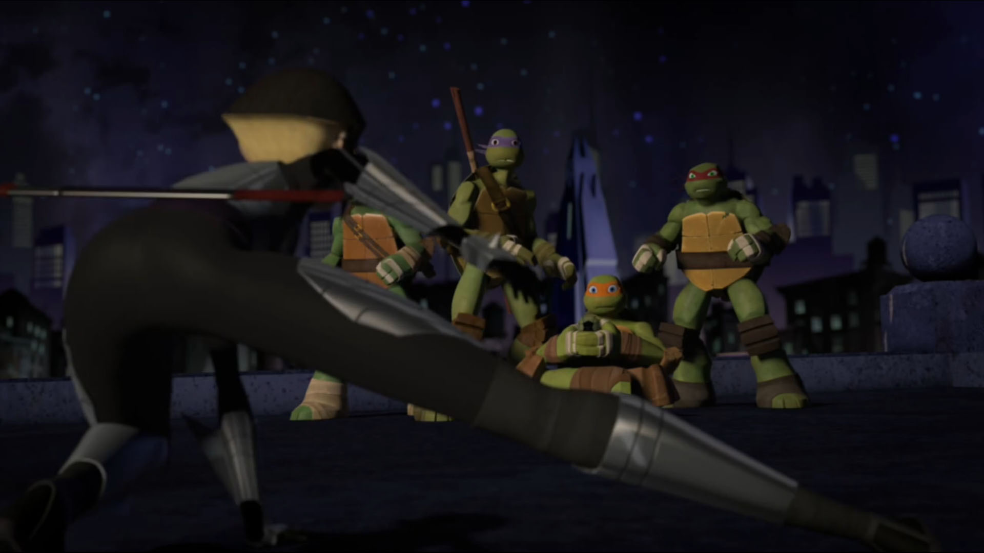 La course de Leonardo était interrompue par Karai, qui s’interposait. La jeune femme était terriblement déçue de la trahison de la tortue, qu’elle pensait être son amie. Finalement, il n’était pas si différent de Shredder, ce qui la rendait folle. Le mutant lui demandait pourquoi s’obstiner à le défendre si elle reconnaissait elle-même qu’il était si mauvais. Karai lui avouait alors que Shredder était son père. La discussion tournait court avec une nouvelle attaque du vaisseau des kraangs. Mais les deux rivaux n’en avaient pas terminés et engageaient un nouveau combat. Celui-ci se terminait très vite, une fois encore interrompu par les tirs extraterrestres. Leonardo filait en direction des voitures stationnées en bordure pour s’emparer du lance-roquette. Placé sur le toit d’un bâtiment, il tirait sur le vaisseau et le touchait.