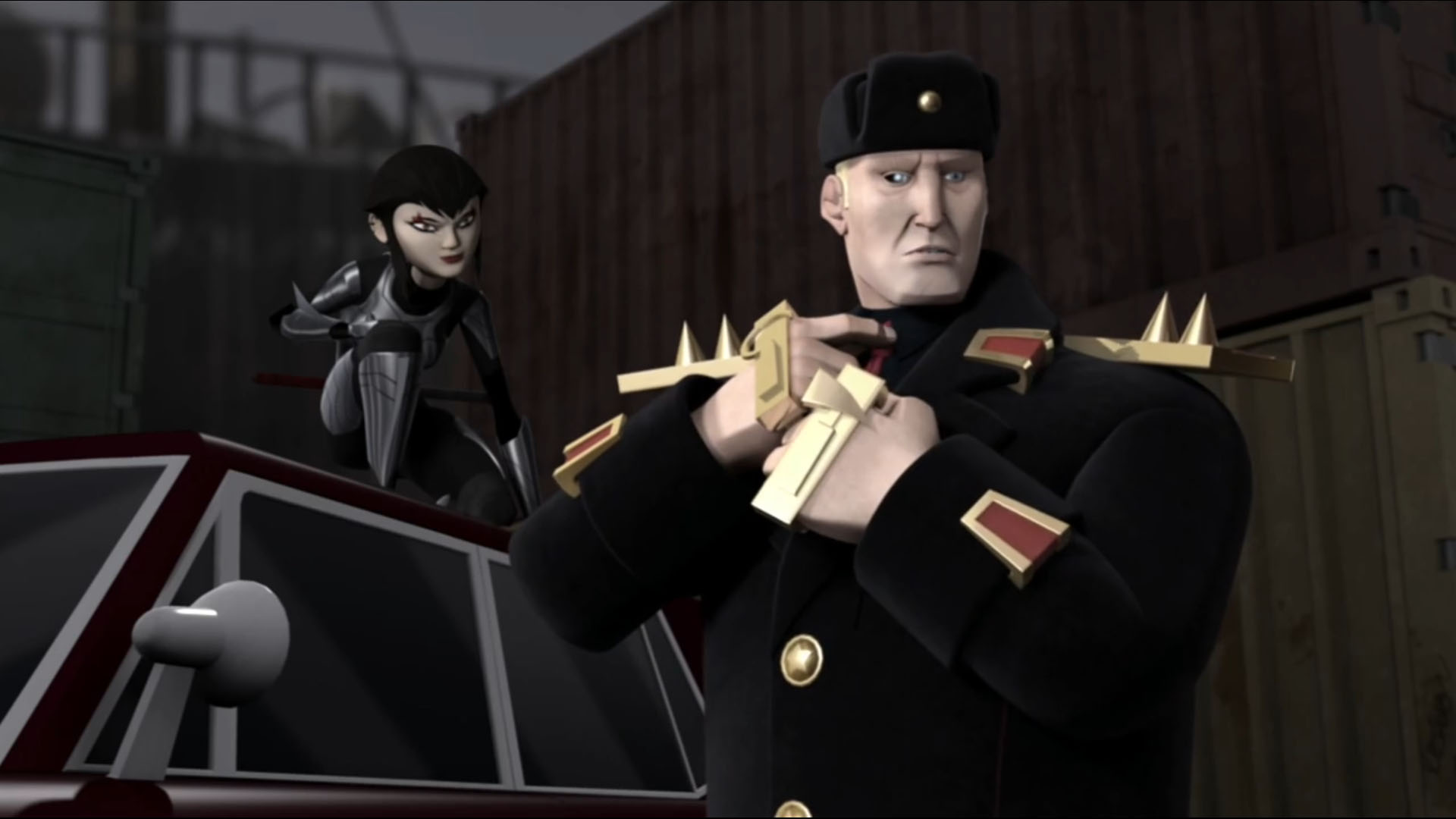 un russe à la carrure imposante attendait sur les docks la venue du Foot Clan. Karai était la première à apparaître, puis son père et une escorte de ninjas Foot faisaient leur entrée. Le contenu de ce qu’il avait apporté était vérifié par Karai, tandis que le russe semblait quelque peu déçu que sa vieille connaissance refuse de lui faire confiance.