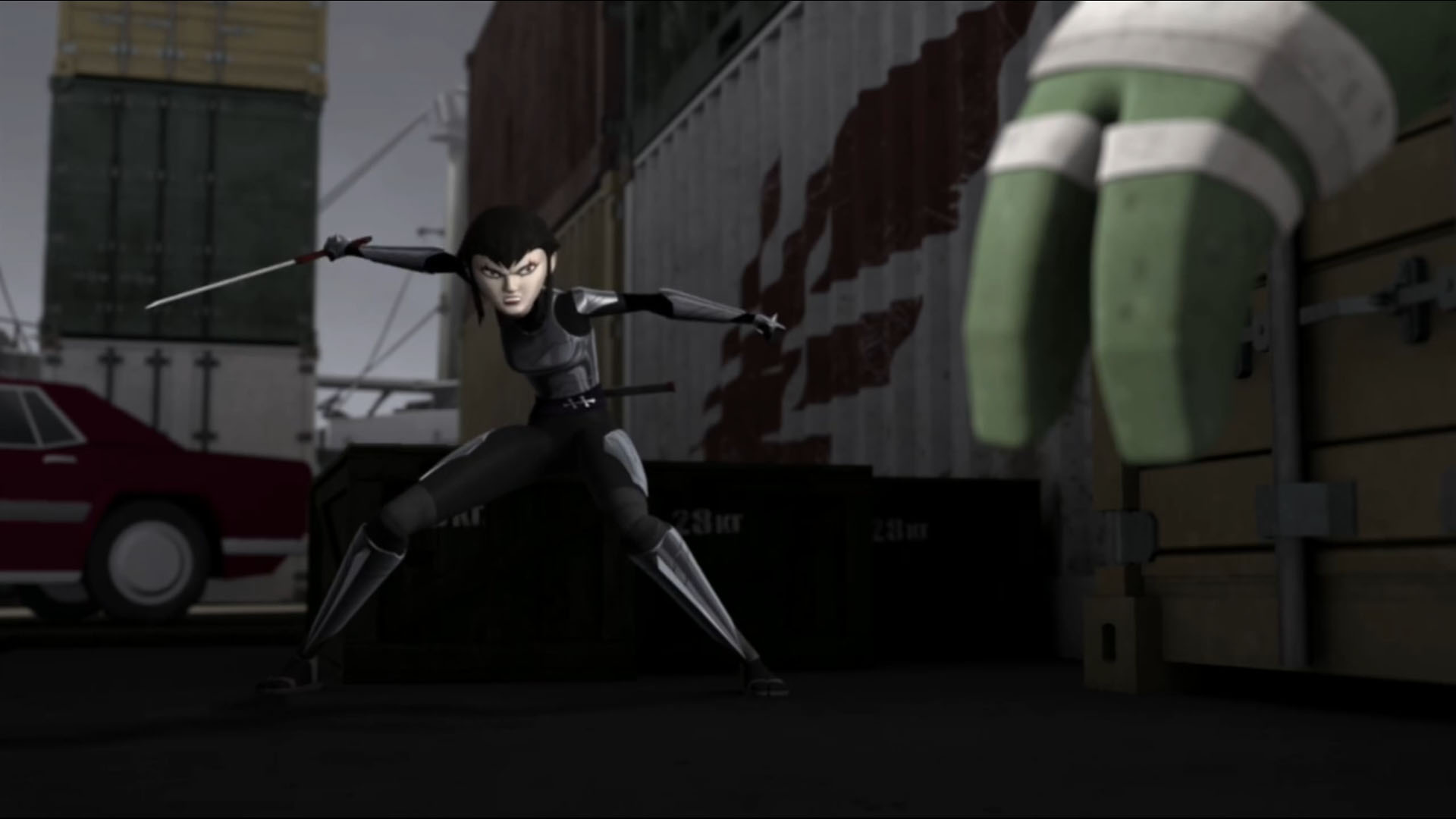 Shredder filait à leurs trousses, bien décidé à tuer ses adversaires. Finalement, ses ennemis se retrouvaient bloqués dans un cul de sac formé par des containers. L’homme en armure leur ordonnait de leur dire où se trouvait Splinter. Soudain, le vaisseau kraang tirait une salve qui les séparait tous. Shredder s’était réfugié dans un container que Leonardo s’empressait de refermer avant de filer aux trousses de sa fille. Hélas pour les autres tortues, à la traine, elles voyaient leur ennemi fendre le métal du caisson de ses lames, comme si de rien n’était.