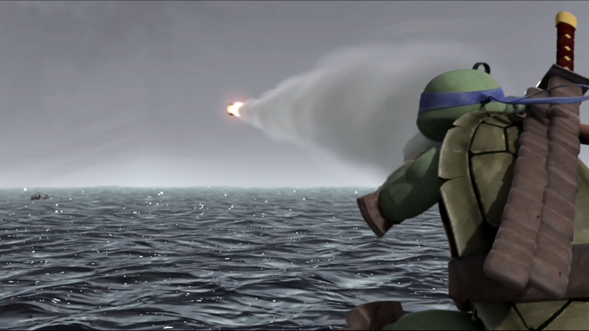 Pendant ce temps, les autres tortues avaient fort à faire contre Shredder, qui menait sa seconde bataille contre les élèves de Yoshi. Un combat là encore interrompu, puisque Shredder se faisait pousser à l’eau par le vaisseau qui le percutait en chutant. Karai sautait dans la mer pour le retrouver. Les tortues filaient au plus vite.