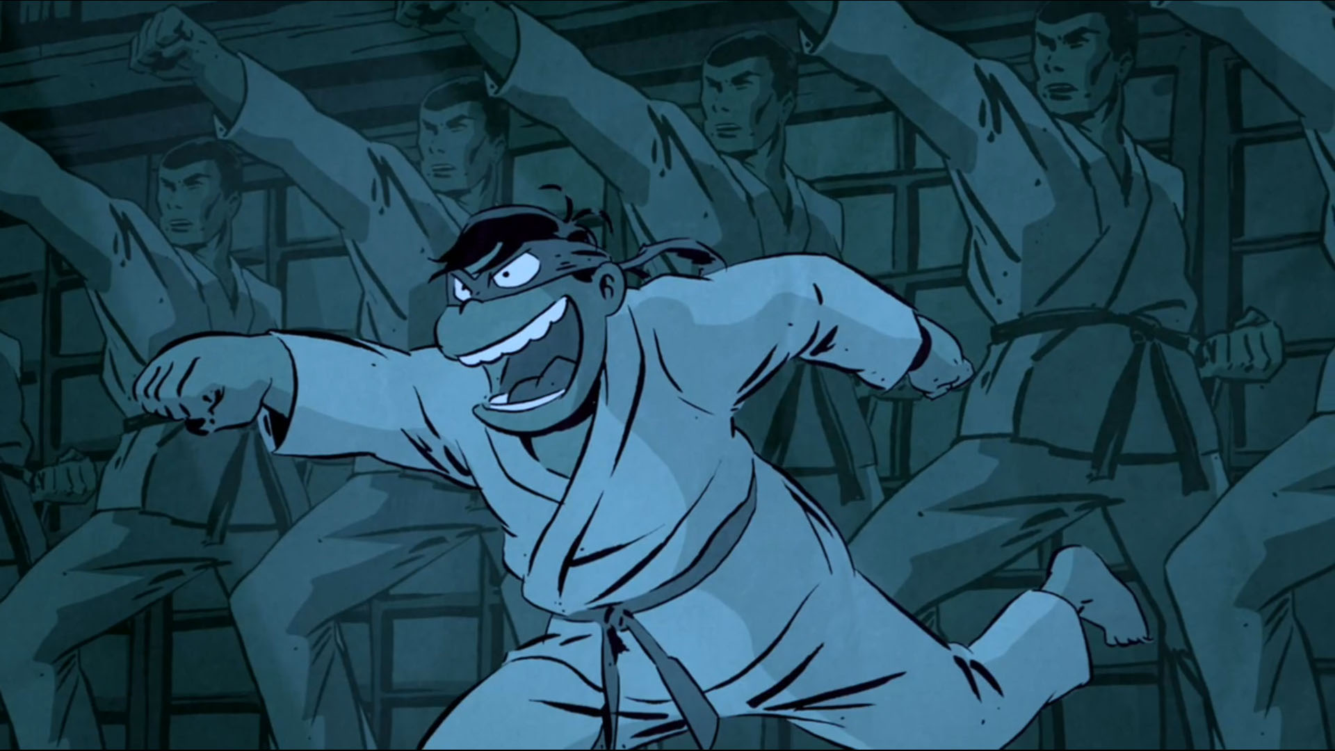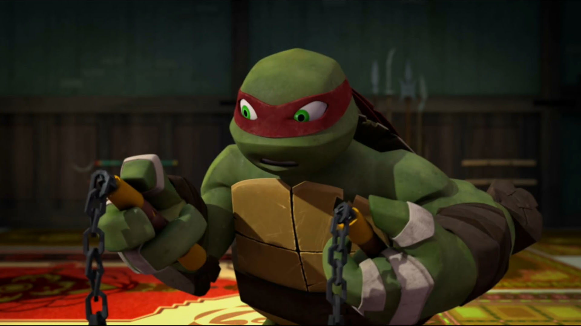 La facilité avec laquelle les tortues s’étaient défaites de leurs ennemis dernièrement était indéniable. Pour Splinter, il était temps que ses élèves apprennent à se battre sans leurs armes. Ou plutôt, que tout ce qu’elles trouvent devienne une arme entre leurs mains. Ainsi, il leur demandait de s’échanger les armes. Michelangelo prenait les sabres, Raphael les nunchakus, Donatello les saïs et Leonardo le bâton. La tortue au bandeau orange ne pouvait d’ailleurs se fendre d’une imitation cinglante de son frère en tant que chef. Puis Splinter demandait à ses élèves de s’affronter avec leurs nouvelles armes. En prenant position, les quatre frères étaient très mal à l’aise avec ces nouveaux objets qui ne correspondaient pas à leurs habitudes. Raphael s’assommait, Leonardo trébuchait sur le bâton, Michelangelo manquait de se faire tuer par les sabres qui lui tombaient dessus et Donatello se piquait sur les saïs. La démonstration était pitoyable, Splinter exigeait qu’ils s’arrêtent là pour le moment. Ils ne vivraient plus qu’avec ces nouvelles armes pour améliorer leurs compétences.