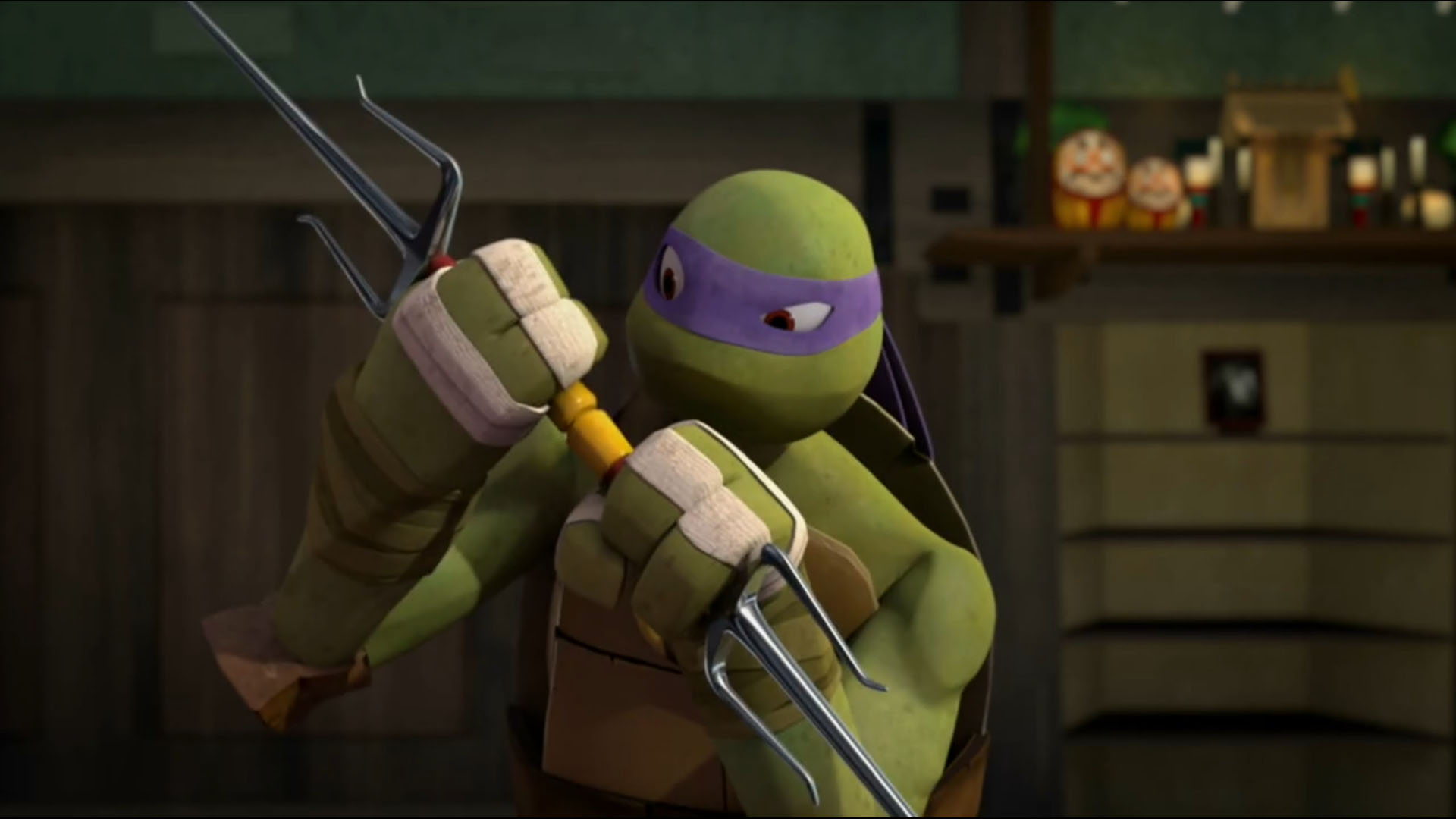 - Les armes confiées à Donatello sont les saïs. Peut-être un clin d’œil à Rob Paulsen, qui prête sa voix au ninja dans la version originale, et qui était déjà celle de Raphael dans le dessin animé de 1987.