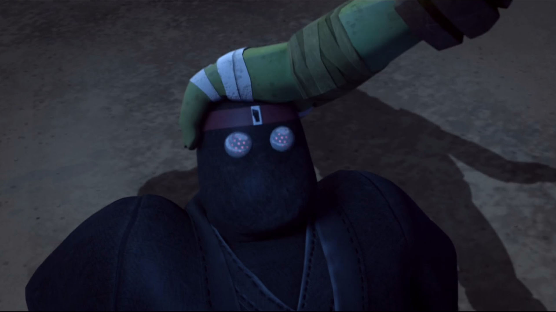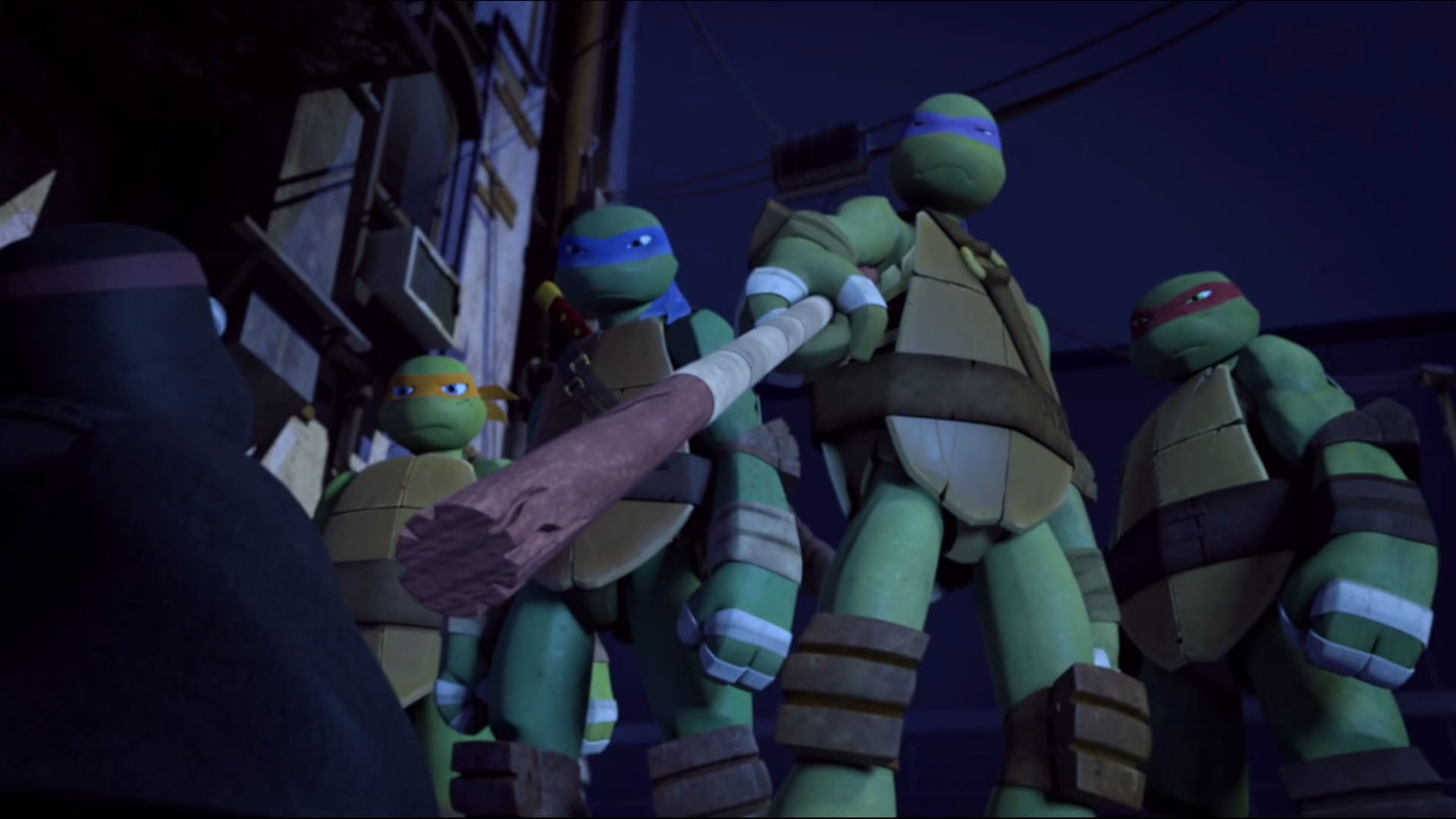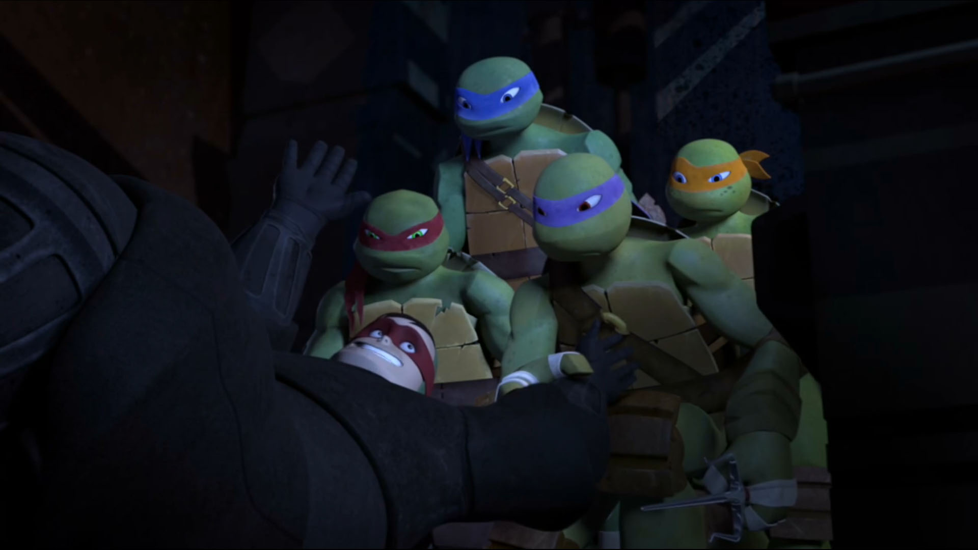 La soirée ne faisait que commencer pour les tortues, qui s’étaient dirigées vers la tour du T.C.R.I. pour surveiller les kraangs. Mais rien ne se passait et Raphael commençait à s’impatienter. Finalement, après quelques instants, Leonardo voyait un homme en noir s’approcher de la tour et essayer d’y entrer depuis un conduit d’aération. Il faisait peine à voir, mais les tortues étaient d’avis de le surprendre. À peine étaient-elles arrivées au sol qu’elles tombaient dans une embuscade du Foot Clan. En quelques instants, une fois encore, les hommes se faisaient balayer par les quatre frères mutants. Il ne restait bientôt plus que le lourdaud malhabile, qui n’avait pas vu les siens prendre la poudre d’escampette. Soudain, il voyait les tortues et les suppliait de l’épargner. Il semblait même les connaître ! Donatello retirait sa cagoule et se rendait compte qu’il s’agissait du Pulverizer ! Les tortues n’étaient clairement pas aussi contentes de le revoir que lui. Et surtout, que faisait-il avec le Foot Clan ?