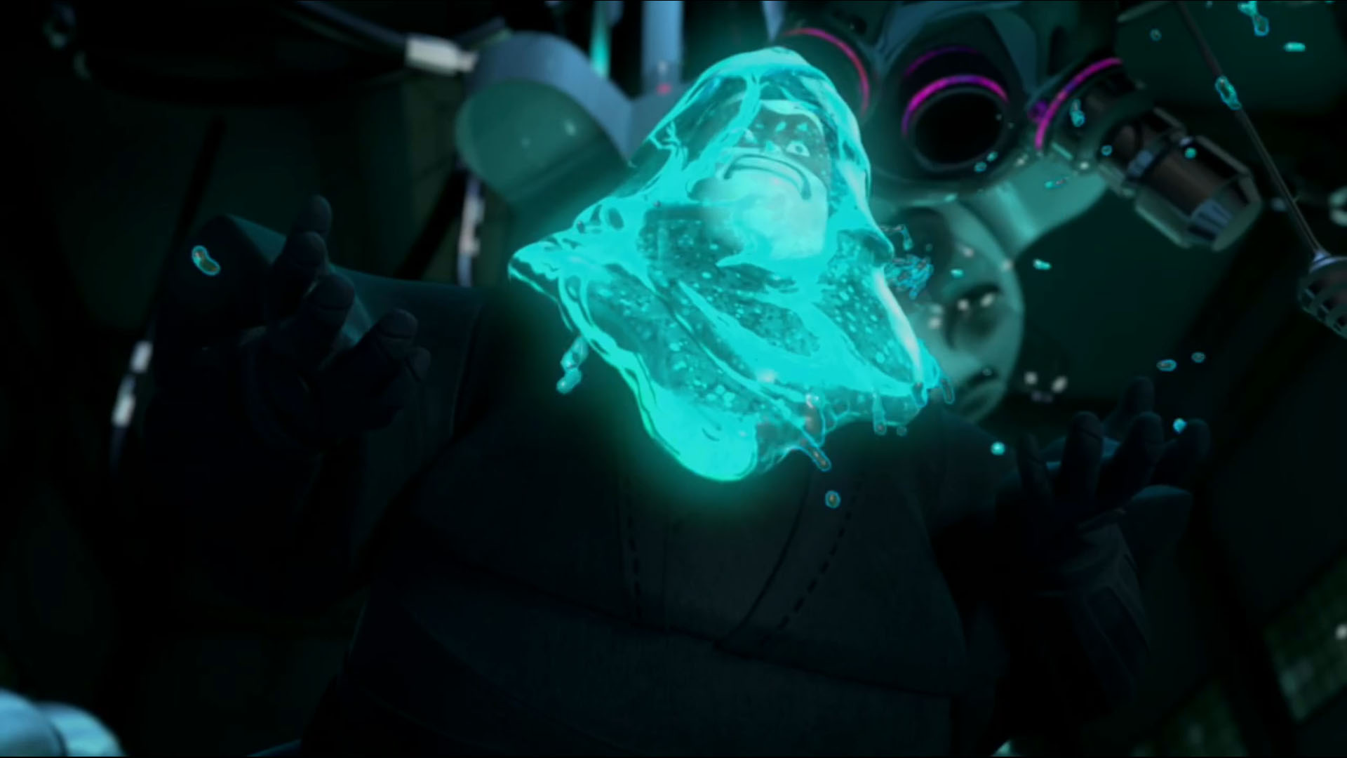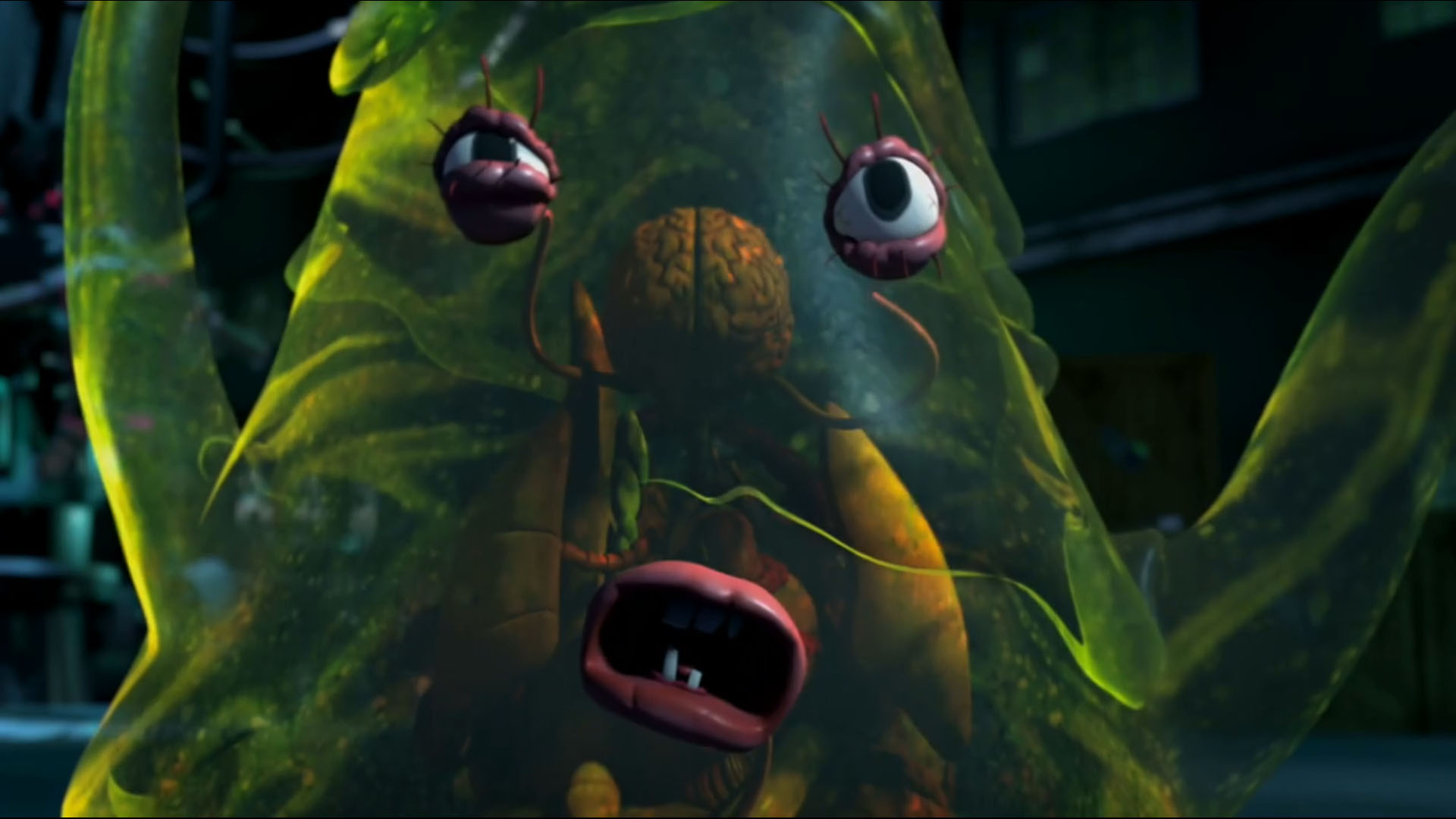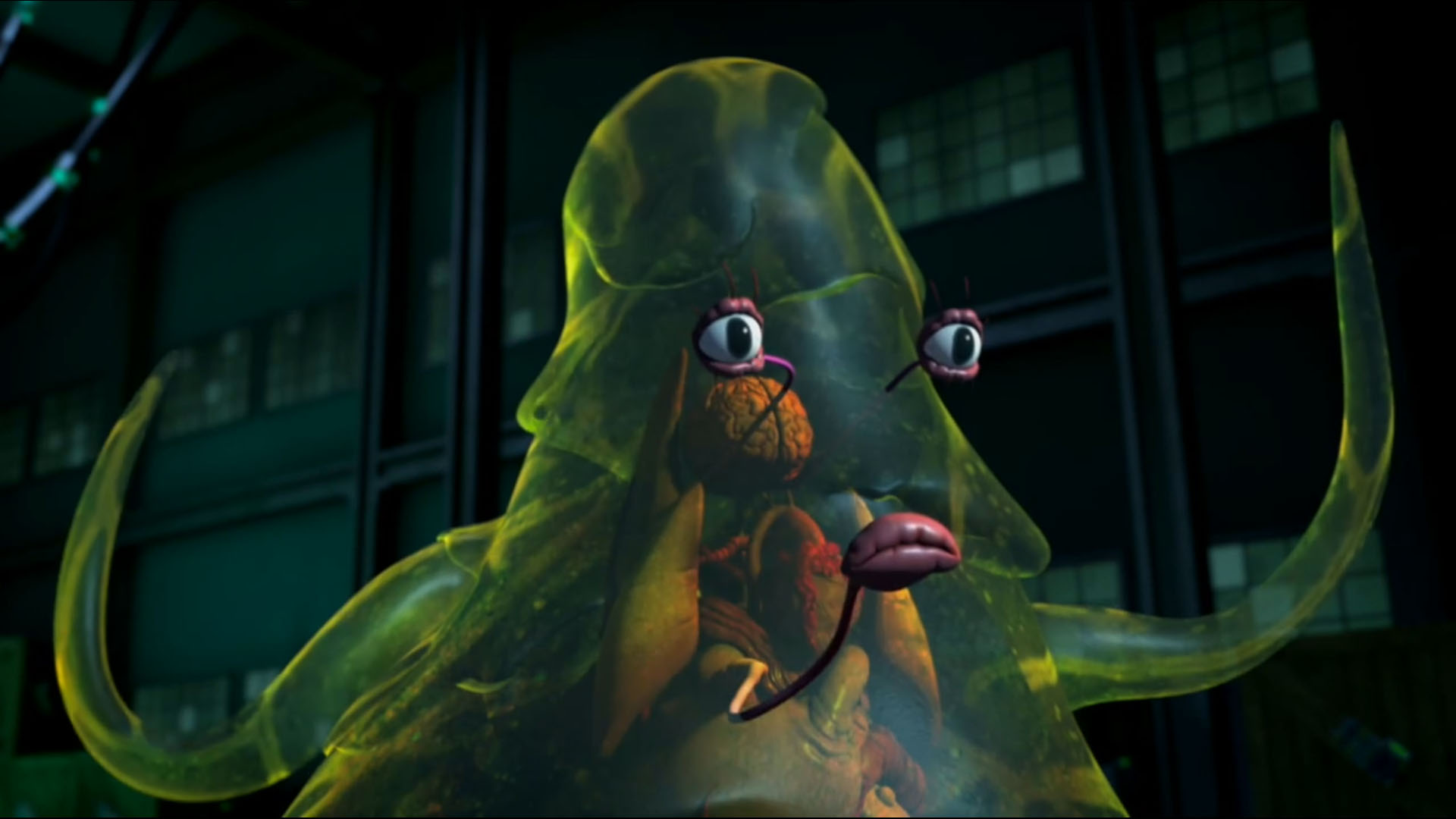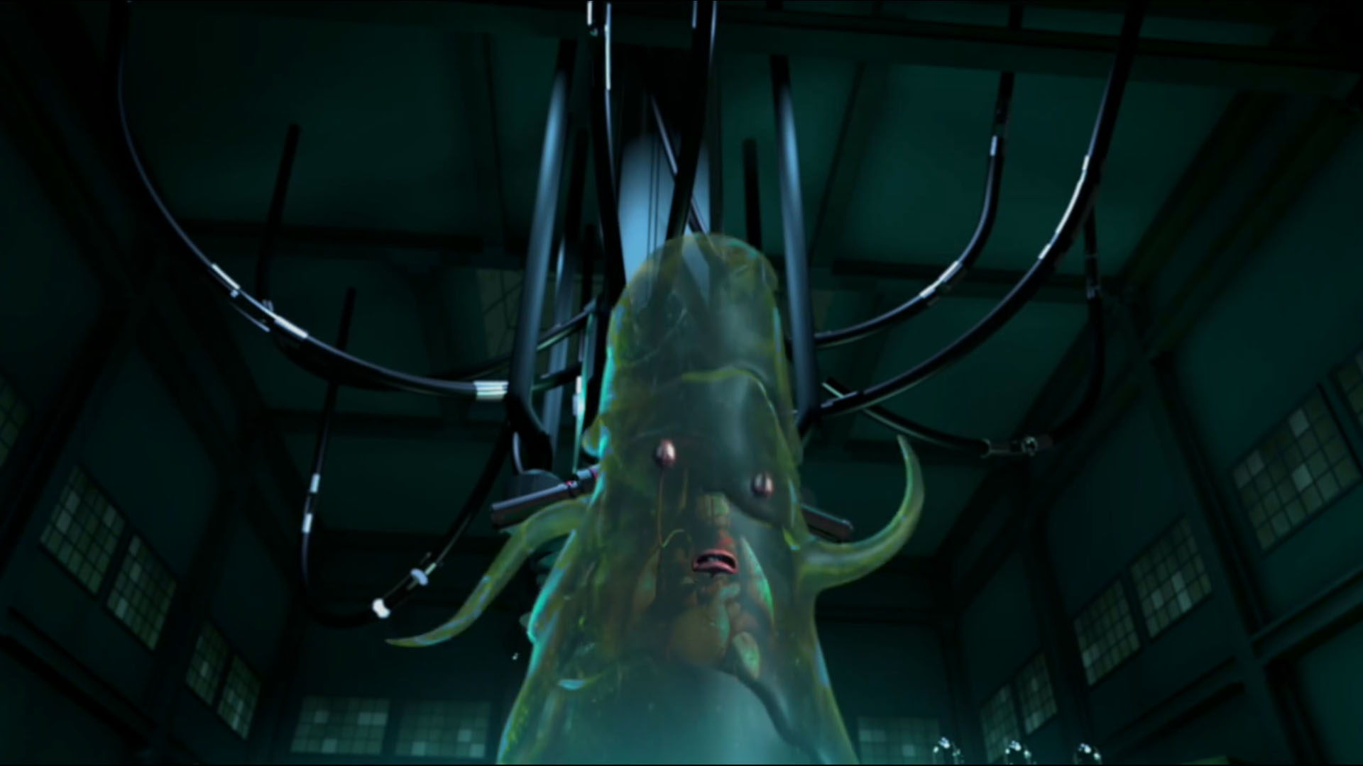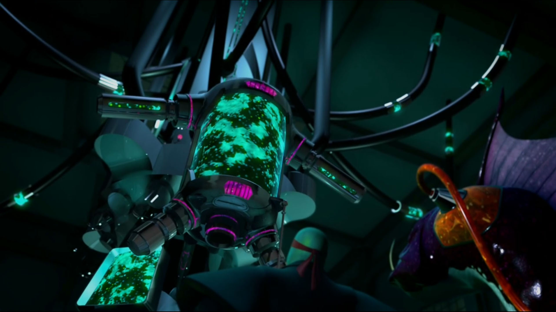 Dogpound se relevait et se dirigeait vers Timothy, qui courait vers le mutagène. Une flaque lui tombait sur le visage. Dans des cris de souffrance, le jeune homme faisait fuir tous les ninjas alentour. Il devenait une sorte de flaque visqueuse. Le sol à son contact fondait. Dogpound piégeait l’entrepôt avant de s’enfuir avec les siens. Timothy était devenu incontrôlable et s’attaquait même aux tortues, qui lui envoyaient leurs armes de fortune en réponse. La chose détruisait ces objets de son corps gluant. Donatello cherchait à le raisonner, en vain. Donatello avait alors une idée et demandait à ses frères de distraire le mutant. Michelangelo l’attirait en-dessous de la cuve de mutagène vide. Leonardo tranchait les attaches pour la faire tomber sur le mutant. La créature difforme se retrouvait prisonnière à l’intérieur. Raphael, remonté à bord du Stealth bike, défonçait la porte de l’entrepôt pour leur permettre de s’enfuir. Timothy se retrouvait prisonnier dans ce bocal et ramené au repaire.
