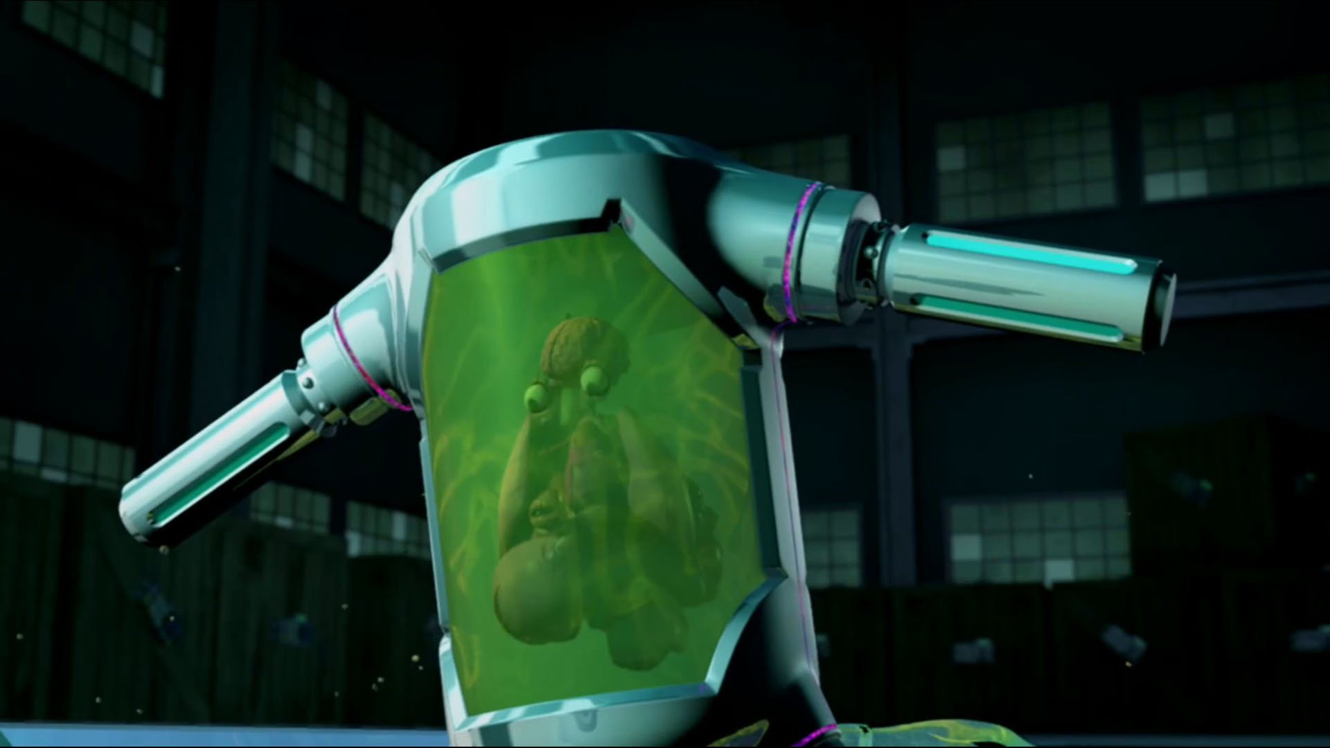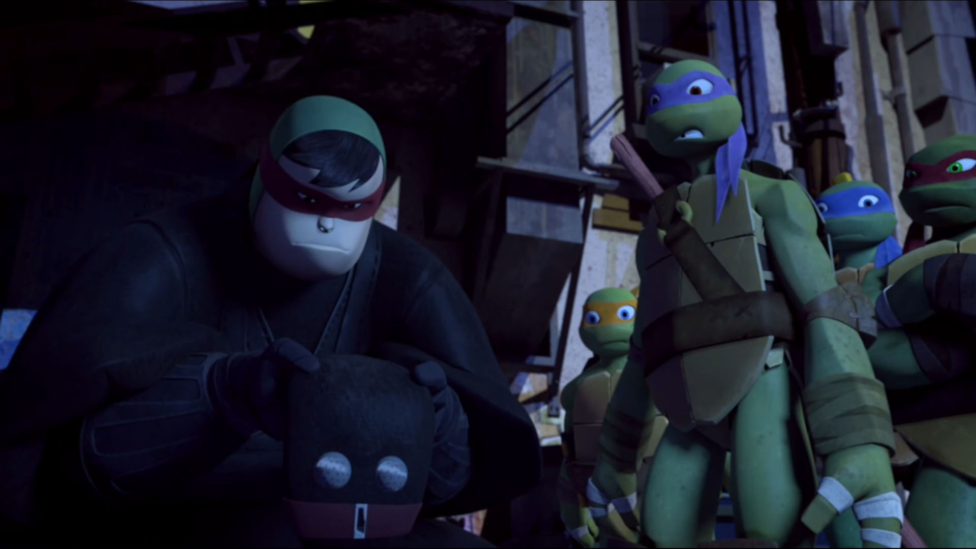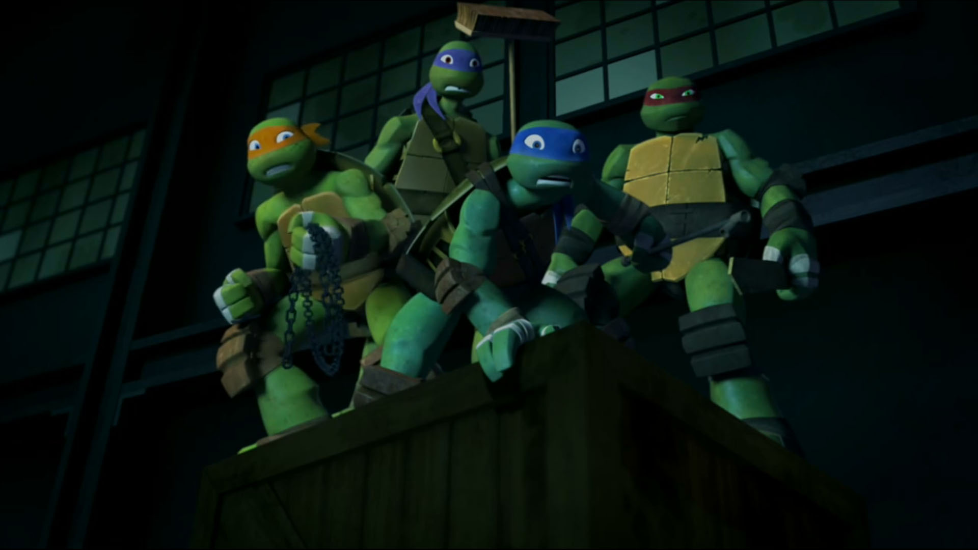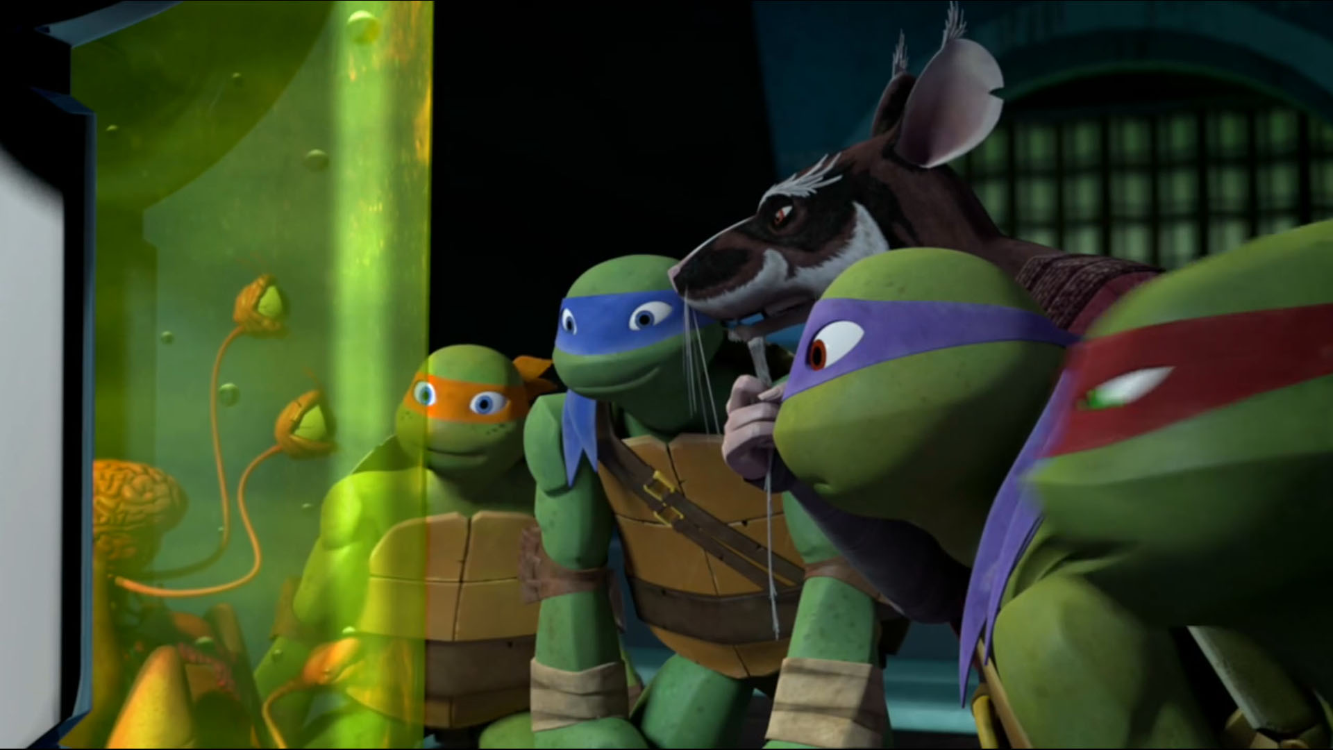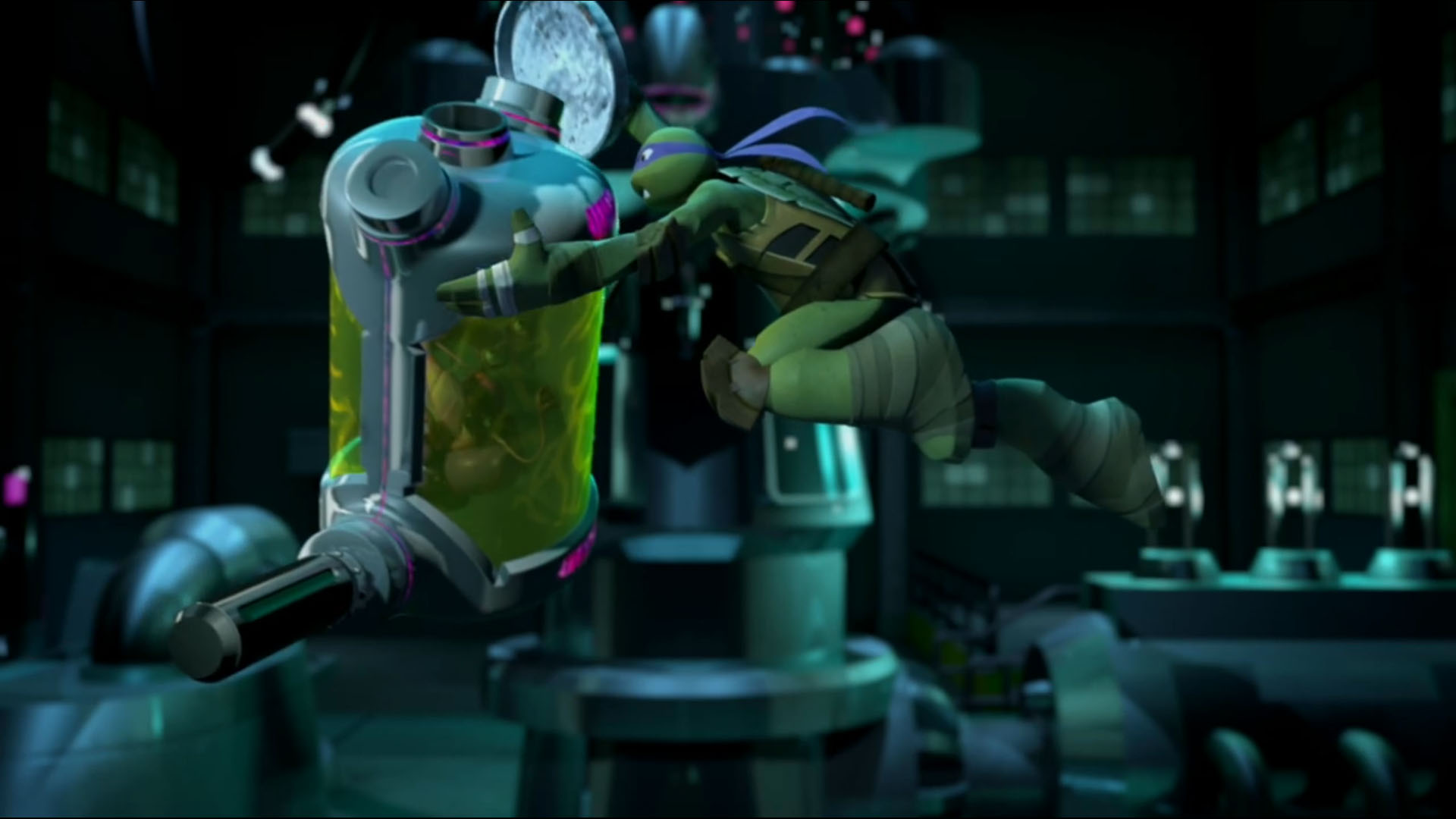 Une fois arrivés dans l’entrepôt, Dogpound ordonnait que Timothy soit placé dans le mutagène. Toute une structure de verre avait été dressée pour accueillir le volontaire. Au même moment, entrait Donatello avec fracas. Les ninjas Foot se faisaient balayer par le véhicule. La tortue s’emparait d’un balai pour se battre et repoussait les ennemis. Une fois fait, il se précipitait vers Timothy, qui tirait sur cordelette pour déverser le mutagène sur son corps. La tortue le repoussait à temps et cherchait à lui faire comprendre que ce n’était pas une bonne idée. Dogpound prenait la suite du combat, secondé de Fishface. Pendant ce temps, Timothy continuait d’essayer de se faire transformer. Au même moment, entraient les trois autres tortues. Elles partaient à la recherche de n’importe quel objet pouvant leur servir d’arme, comme une planche, une chaîne ou encore une tige de fer.
