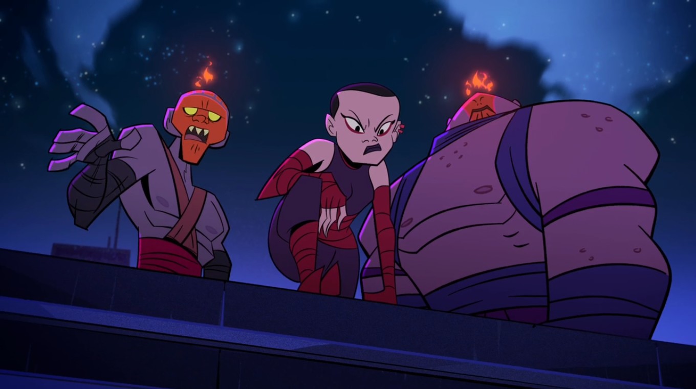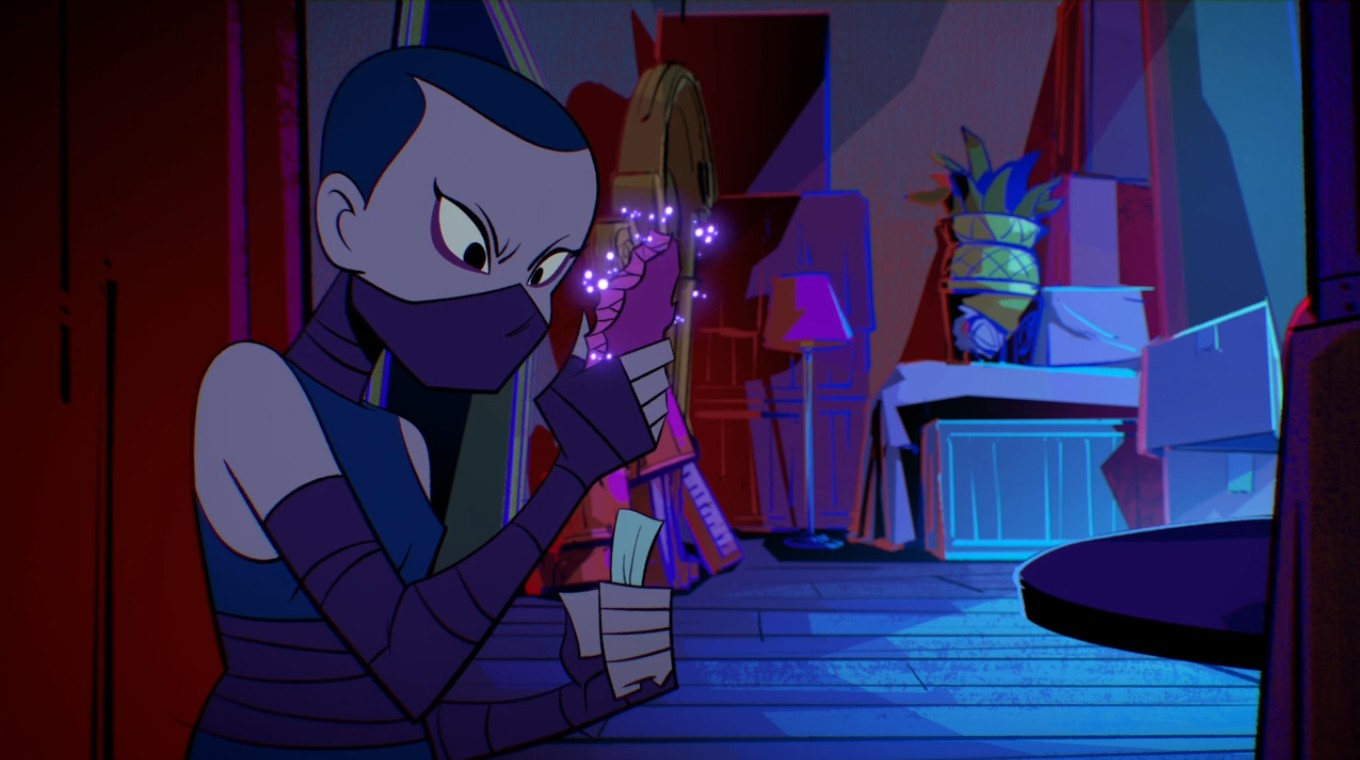 Entrant dans le bâtiment, Michelangelo et la nouvelle recrue ne tardèrent pas à se rencontrer. La tortue prit la jeune femme pour un vigile et lui expliqua qu’il venait juste retirer le jeu de Lou Jitsu. Comme programmée, l’élève commença à tiquer sur le nom et vouloir tuer la tortue pour prendre son bien. Elle s’empara de son bon avant de prévenir ses supérieurs que les tortues étaient sur l’affaire aussi. Elle avait carte blanche pour se débarrasser du mutant.
