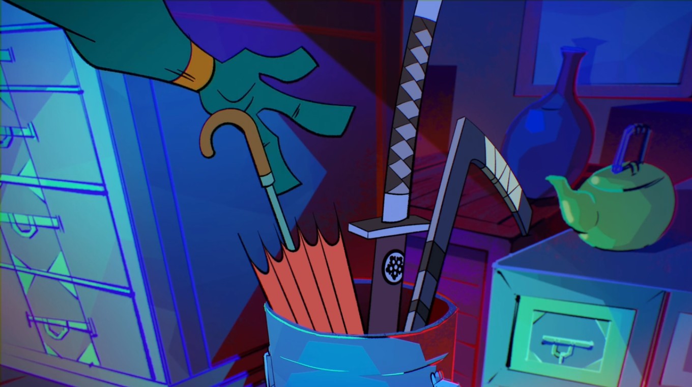 • Lors de son combat contre la recrue, Michelangelo saisit un parapluie. À côté de celui-ci, se trouvait un sabre avec l’écusson du Clan Hamato du dessin animé de 2012 (et une crosse de hockey en référence à Casey Jones). Dans la séquence suivante, il trouve une statue d’Ice cream kitty, la chatte mutante glacée de Michelangelo de cet univers.