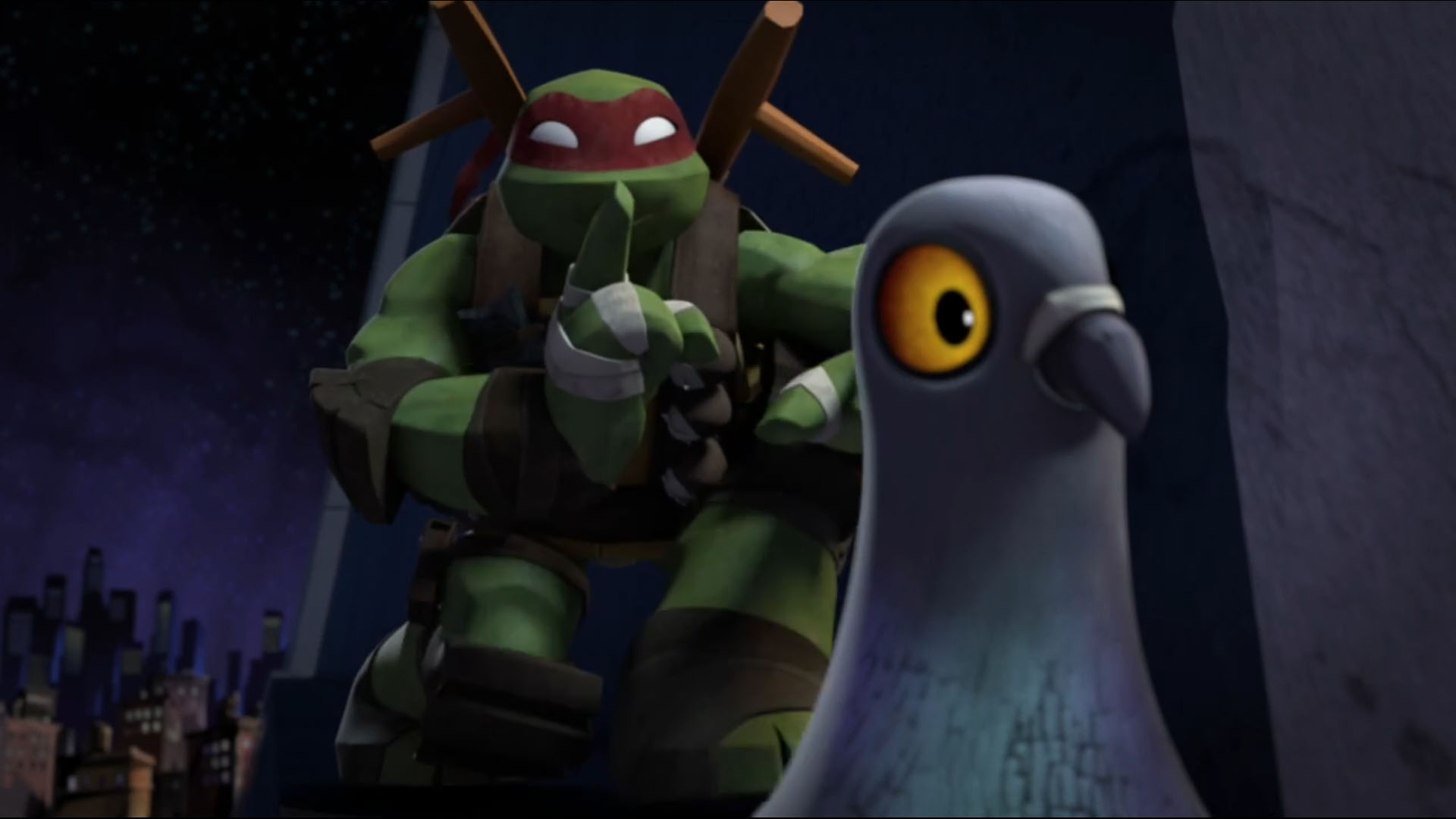 Les tortues avaient prévu un plan de distraction. Tandis que les kraangs avaient fort à faire à l’entrée de leur tour, les ninjas attaqueraient cette fois par les airs. Donatello avait bricolé des ailes volantes leur permettant d’atteindre le dernier étage de la tour. Raphael s’emparait d’un pigeon pour le placer dans les caméras des kraangs pour permettre à ses frères de passer sans être vus. Les ninjas évoluaient autour du toit du bâtiment jusqu’à atteindre deux gardes. Michelangelo les distrayait tandis que Donatello les dégageait dans le vide.