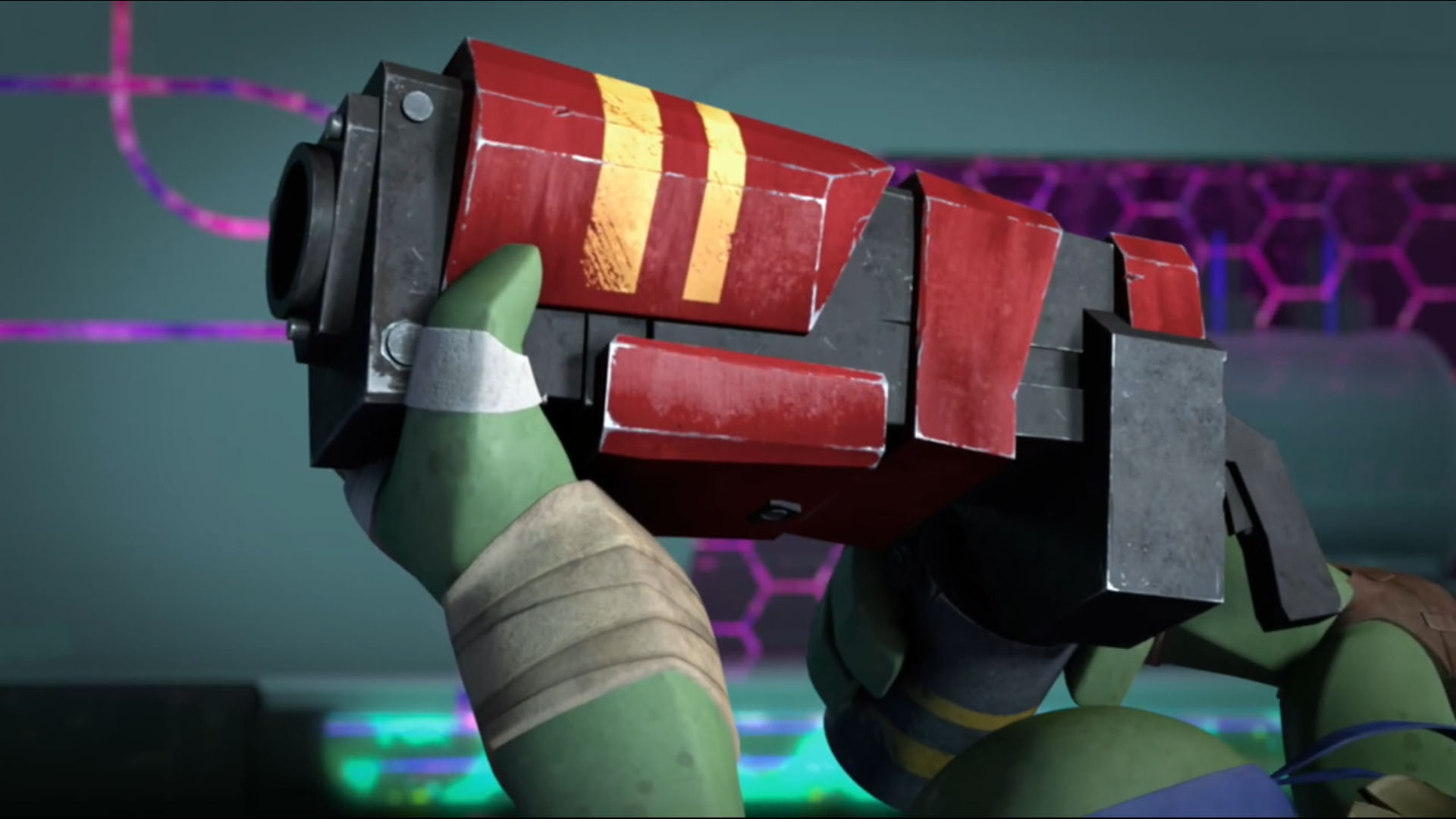 À l’intérieur de la salle d’embarquement du portail du T.C.R.I., tous les extraterrestres étaient prêts à réceptionner le Technodrome. Même Traag, le colosse de roche volcanique était présent. Les tortues étaient entrées à l’intérieur sans être vues et observaient la scène depuis le plafond, tapies dans l’ombre. Leonardo visait le portail avec l’omni-désintégrateur, mais ce dernier possédait un bouclier. La charge n’avait aucun effet sur lui. Le tir les faisait repérer et les intrus essuyaient des salves de riposte.