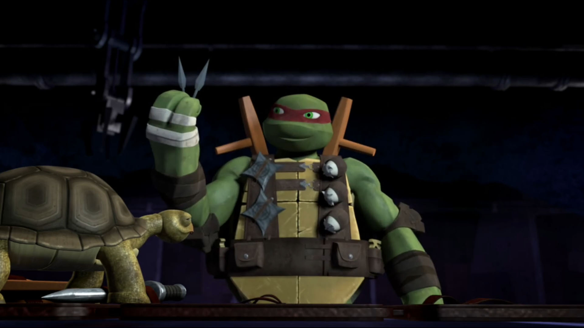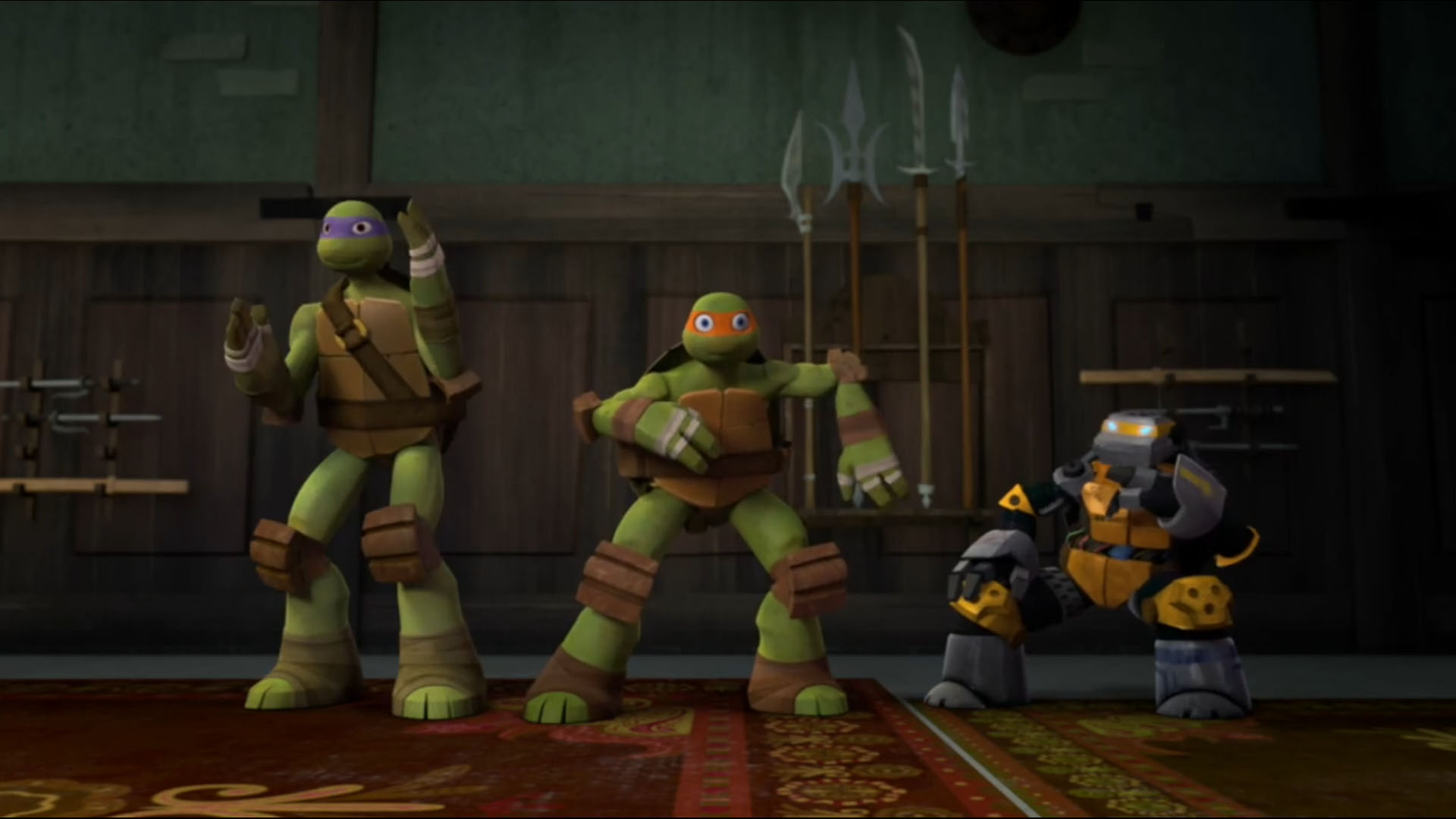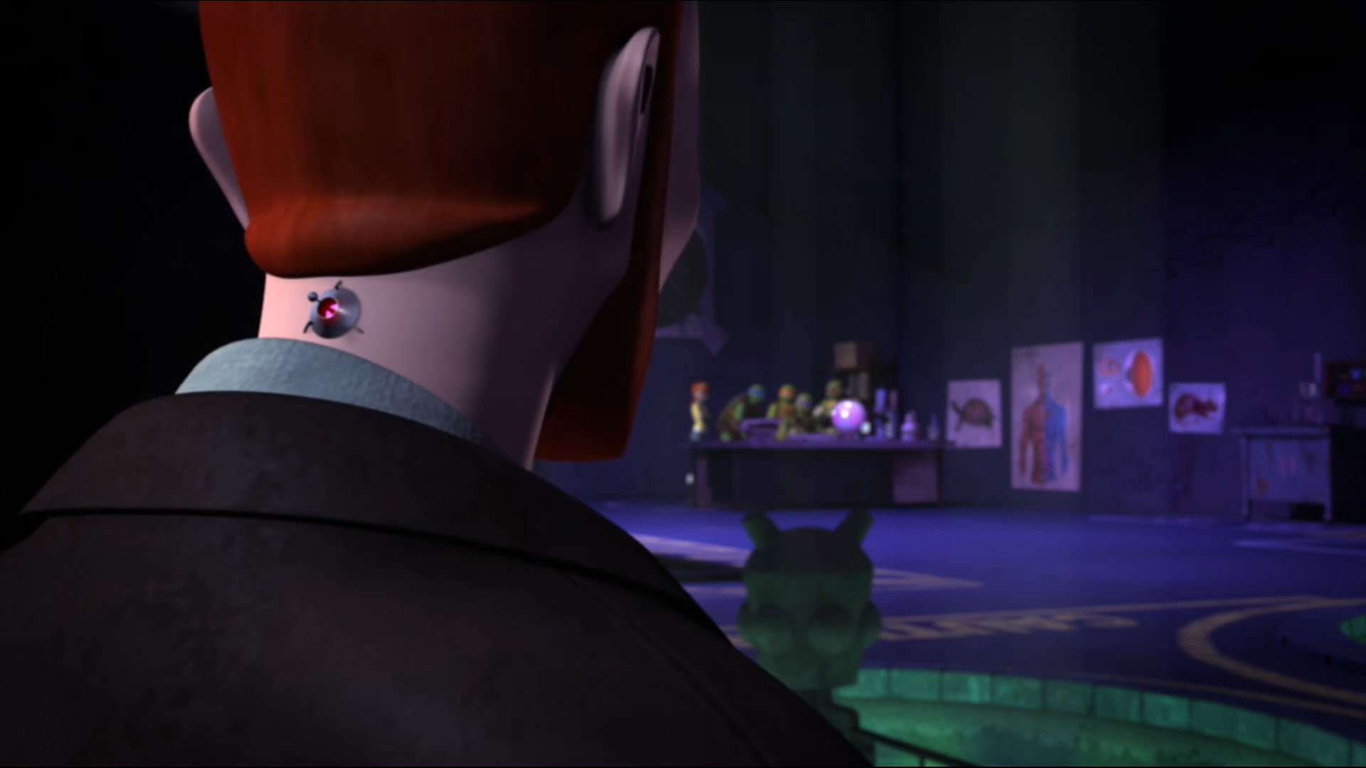 dans la pièce pour leur souhaiter bonne chance. Les quatre tortues avaient fait beaucoup de chemin depuis leur première sortie à l’extérieur (L’apparition des tortues, S1 E1). Il savait qu’ils étaient à la hauteur pour empêcher ce qui allait suivre dorénavant. Il se dirigeait vers Leonardo pour lui rappeler que le plus important dans cette mission était la survie de la Terre, peu importe les sacrifices qu’ils devraient réaliser. La discussion était observée par Kirby, resté en retrait et dont un petit appareil était fixé à sa nuque.