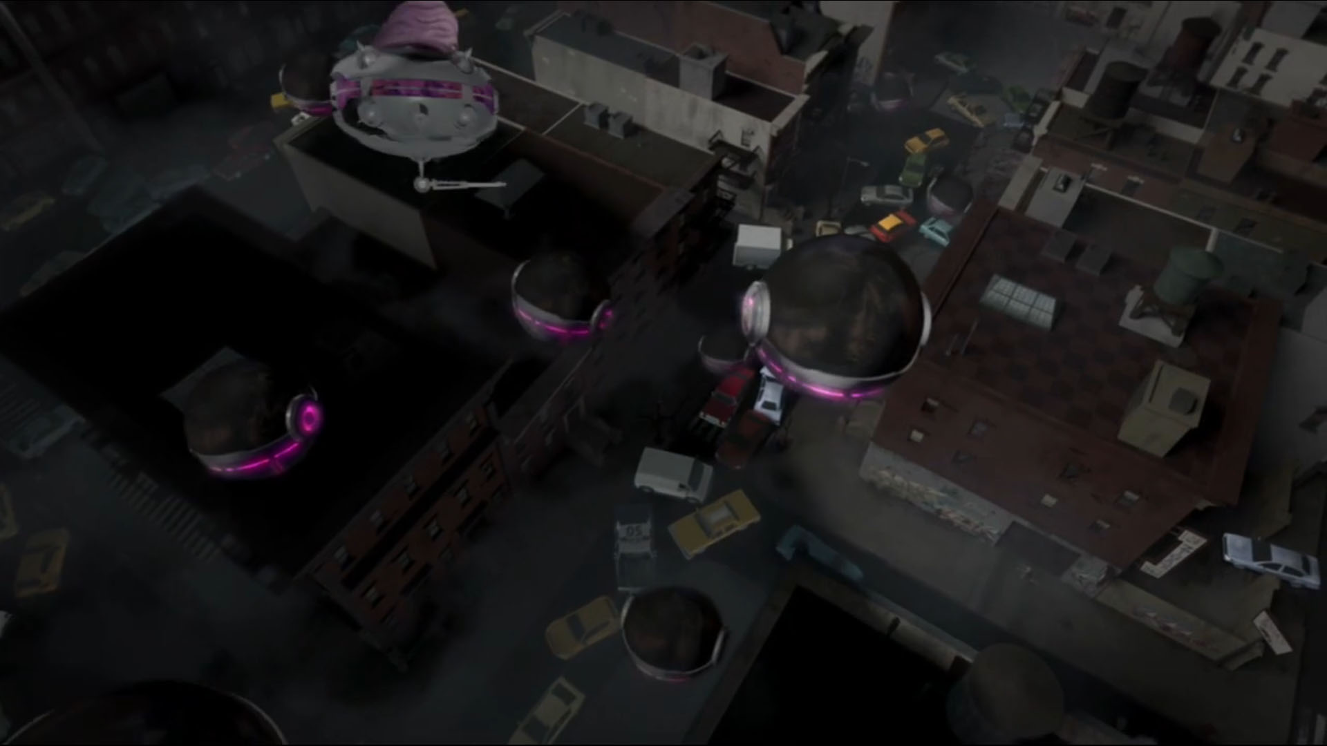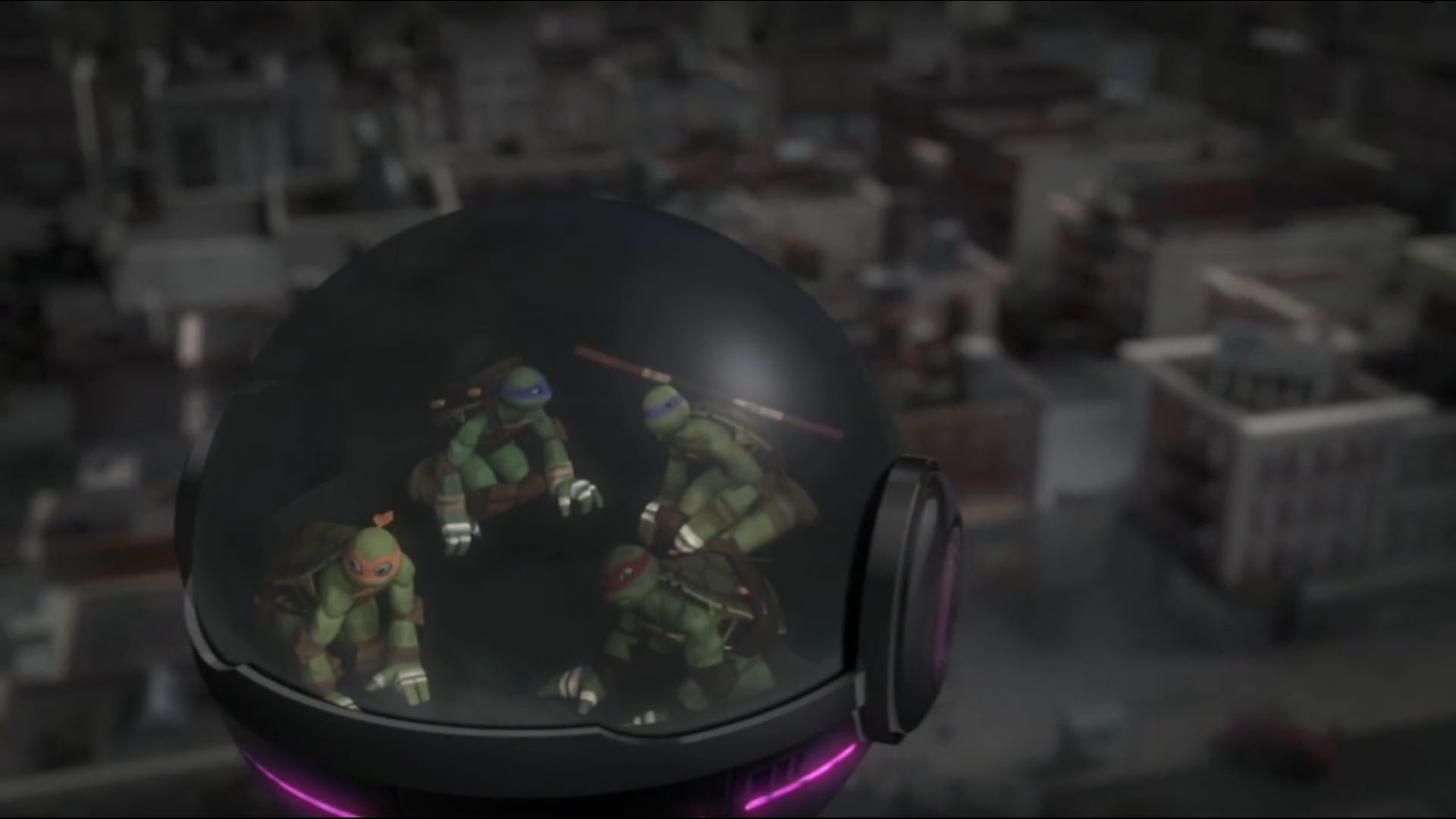 Dans les rues, les civils couraient dans tous les sens. Des capsules s’emparaient des humains sans mal à travers la pagaille générée. Les capsules retournaient dans le Technodrome et d’autres prenaient leur place. Les tortues se faufilaient entre les voitures renversées et les ruelles et essayaient d’imaginer un plan. Leonardo proposait d’entrer dans l’une de ces capsules pour pénétrer à l’intérieur du vaisseau extraterrestre. Raphael fondait sur un kraangdroid et lui arrachait la tête. De quoi les aider pour leur mission d’infiltration.