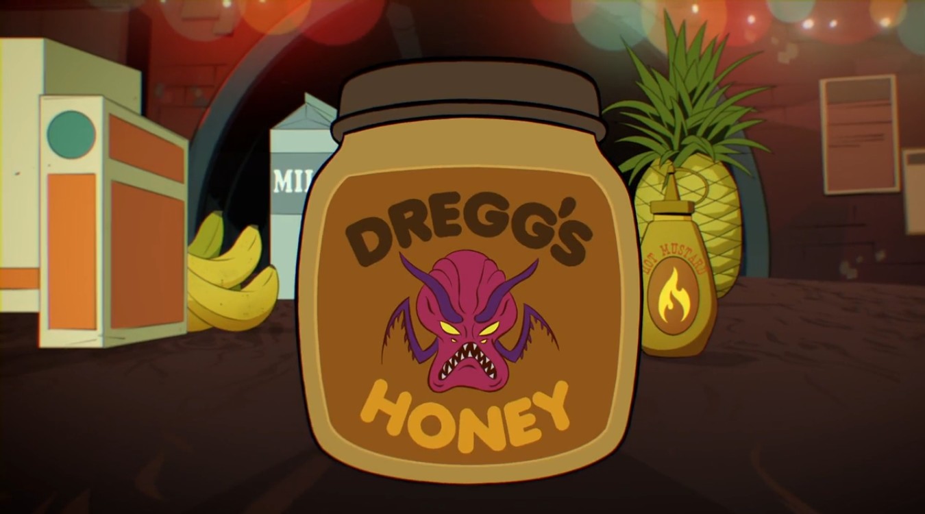 - Pour établi leur plan d’attaque contre Big Mama, les tortues disposèrent des objets de cuisine et de la nourriture sur leur table. On y trouve un pot de miel « Dregg », rendant hommage à lord Vringath Dregg, du dessin animé de 2012.