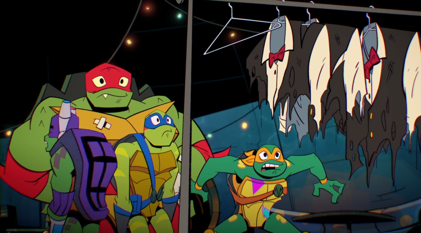 Sur le point de s’en aller vers leur mission, les tortues allèrent s’habiller. Elles porteraient des costumes élégants ce soir, pour une bonne infiltration au sein d’une soirée chic. Sauf que ceux-ci avaient été saccagés. Il en manquait d’ailleurs un… Leonardo regrettait déjà de lui avoir expliqué leur plan.
