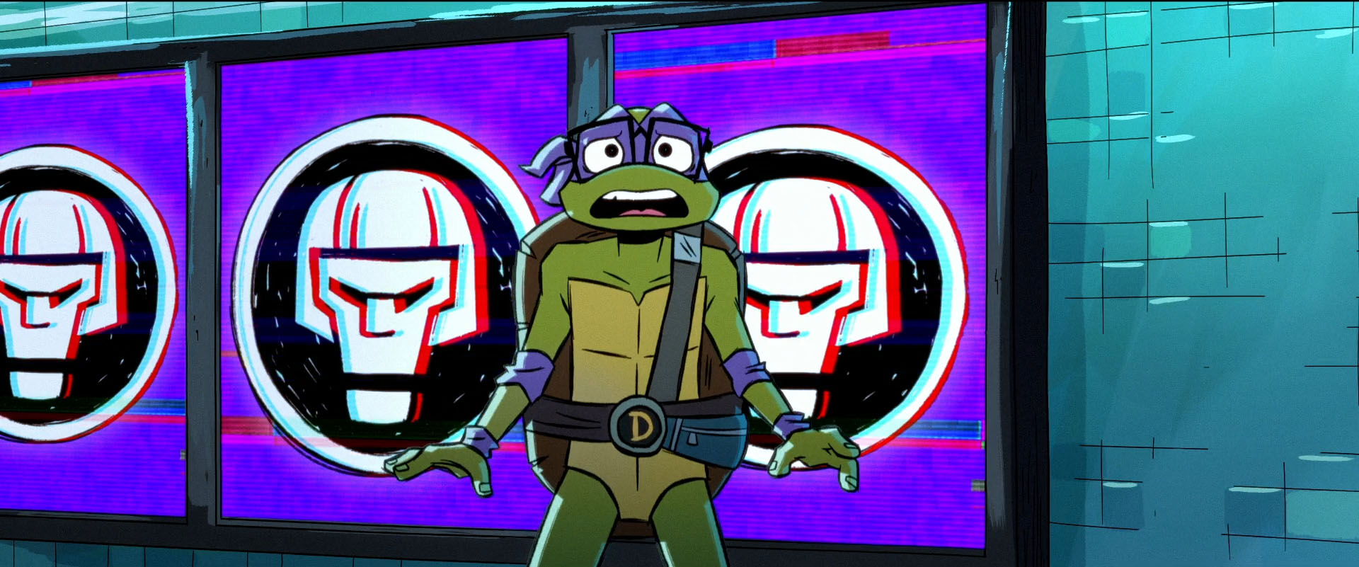 sur les toits pour échapper à son tour à un Mechazoid. Caché derrière un panneau publicitaire, il cherchait à joindre April mais tombait sur sa messagerie (Leonardo se bat tout seul, S1 E1). Très vite, la machine retrouvait sa trace et reprenait la poursuite dans un échafaudage. La tortue avait quelques secondes de répit, de quoi lui laisser le temps d’envoyer un SOS à son amie avant de se faire bousculer. Son téléphone tombait dans la rue, en contrebas, puis dans les égouts. L’adolescent traversait la rue pour atteindre un ascenseur et gagner le métro. Le Mechazoid 04 traversait la porte de son bras avant de se le faire broyer par la descente de la cabine. Arrivé dans les souterrains, Donatello était sonné et s’effondrait devant deux policiers.