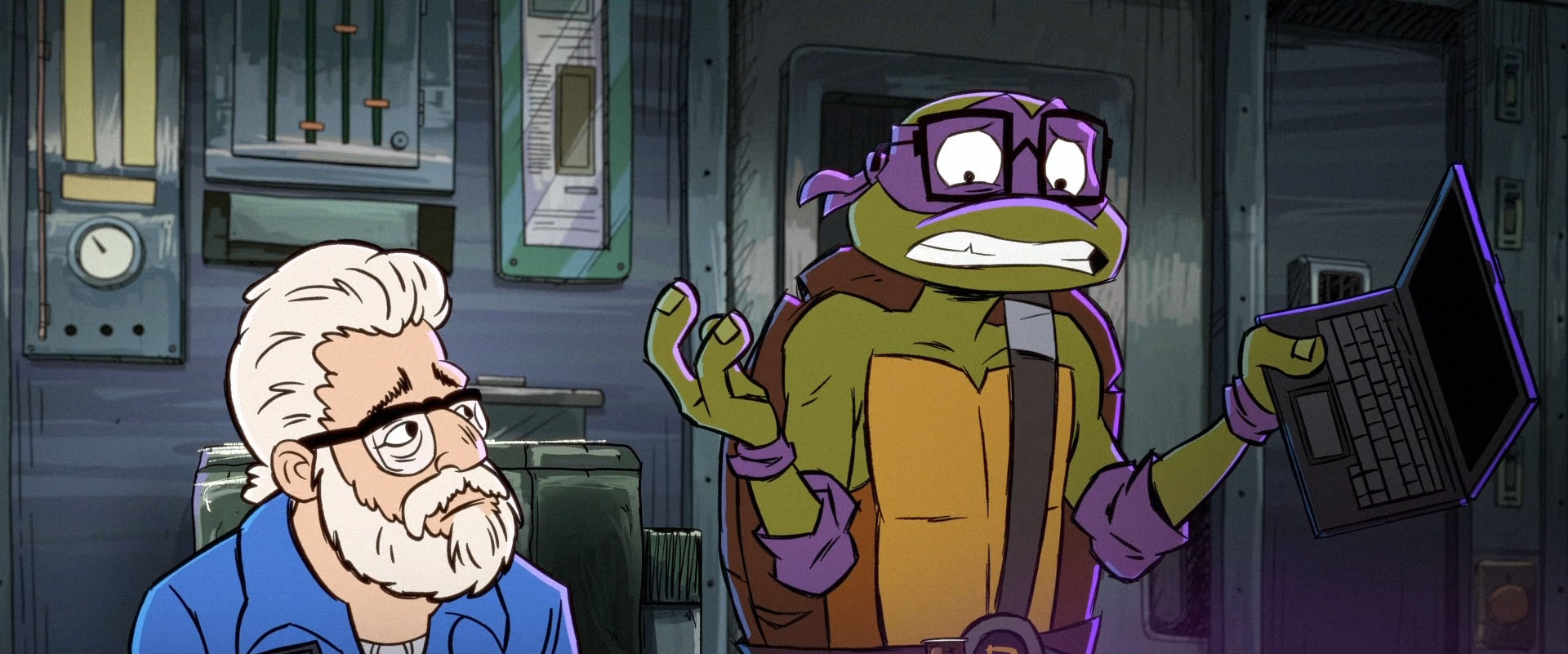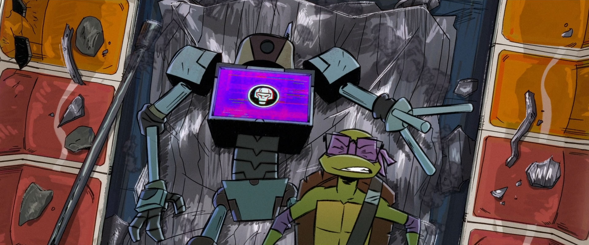 Apprenant qu’il y avait une antenne sur le toit de la rame, la tortue s’empressait de l’atteindre. Le Mechazoid détruisait le plafond, la faisant s’effondrer à ses pieds. Les voyageurs dans le wagon lançaient tout ce qu’ils pouvaient sur la machine pour permettre à Donatello d’atteindre cette antenne. Branchée à l’ordinateur, la tortue parvenait enfin à toucher au but. Mais une fois encore, le robot faisait des siennes et saisissait sa cible. Il lui faisait traverser les vitres pour la plaquer contre le mur, carapace contre la paroi. Donatello se concentrait et repensait aux mots de Raphael, qui lui demandait d’être parfois plus dur.